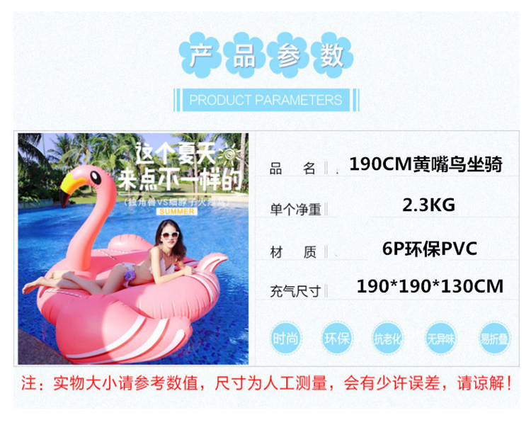 190CM黄嘴火烈鸟坐骑细脖子火烈鸟坐骑浮床浮排粉天鹅泳圈漂浮垫