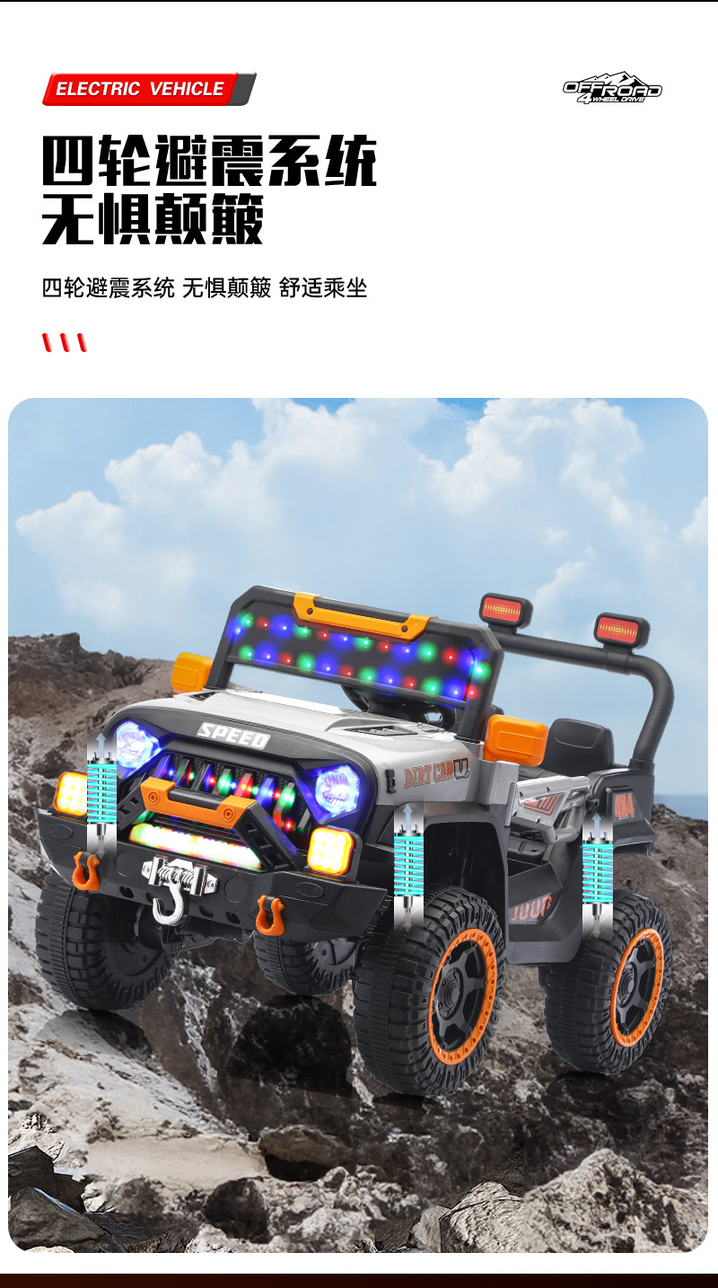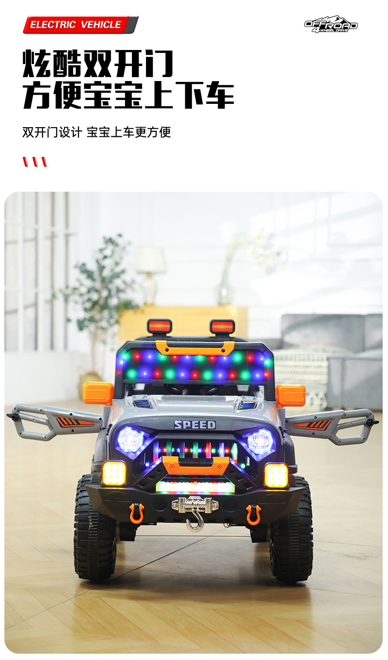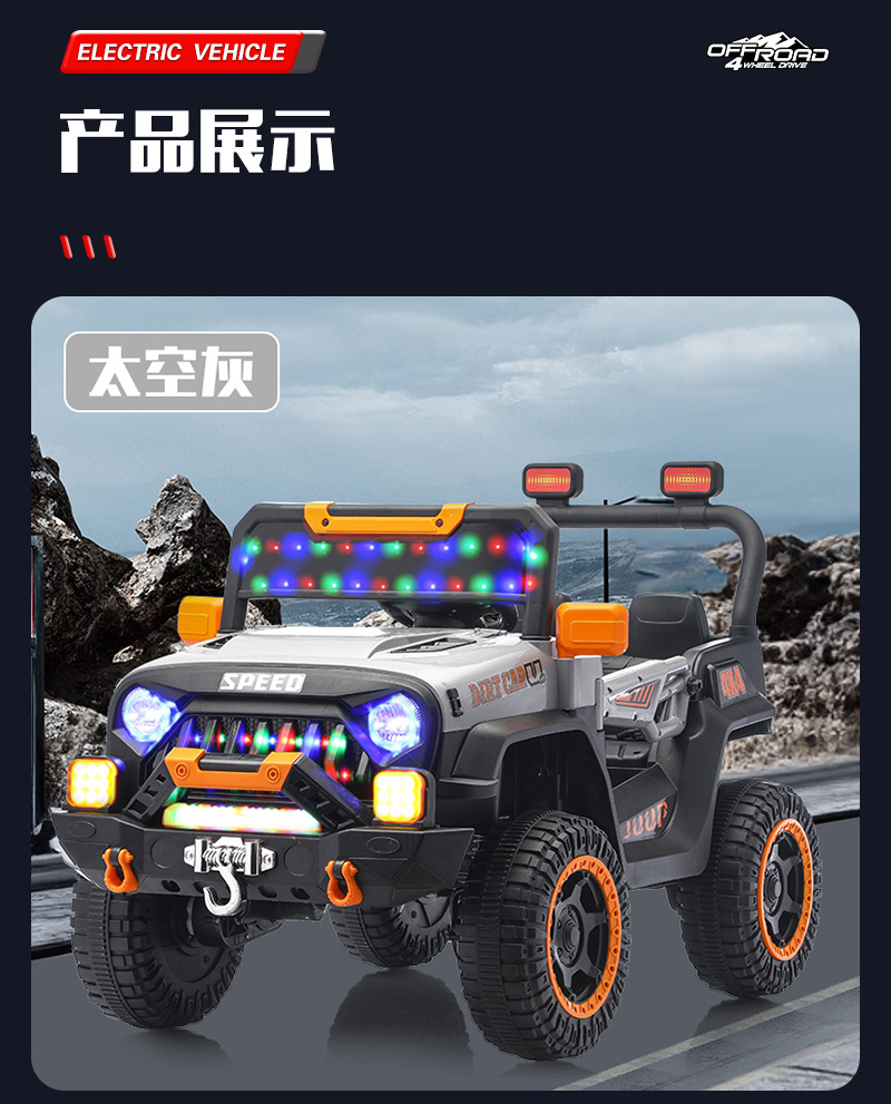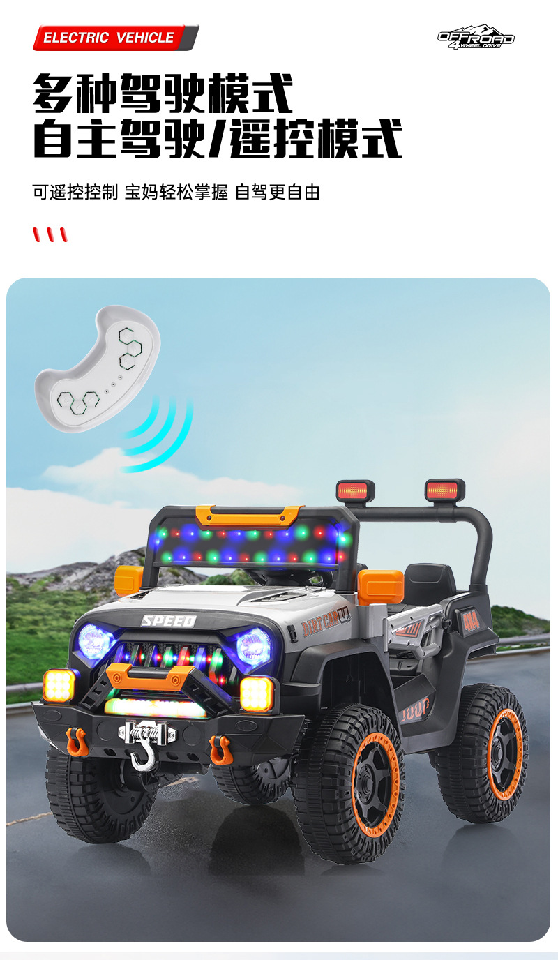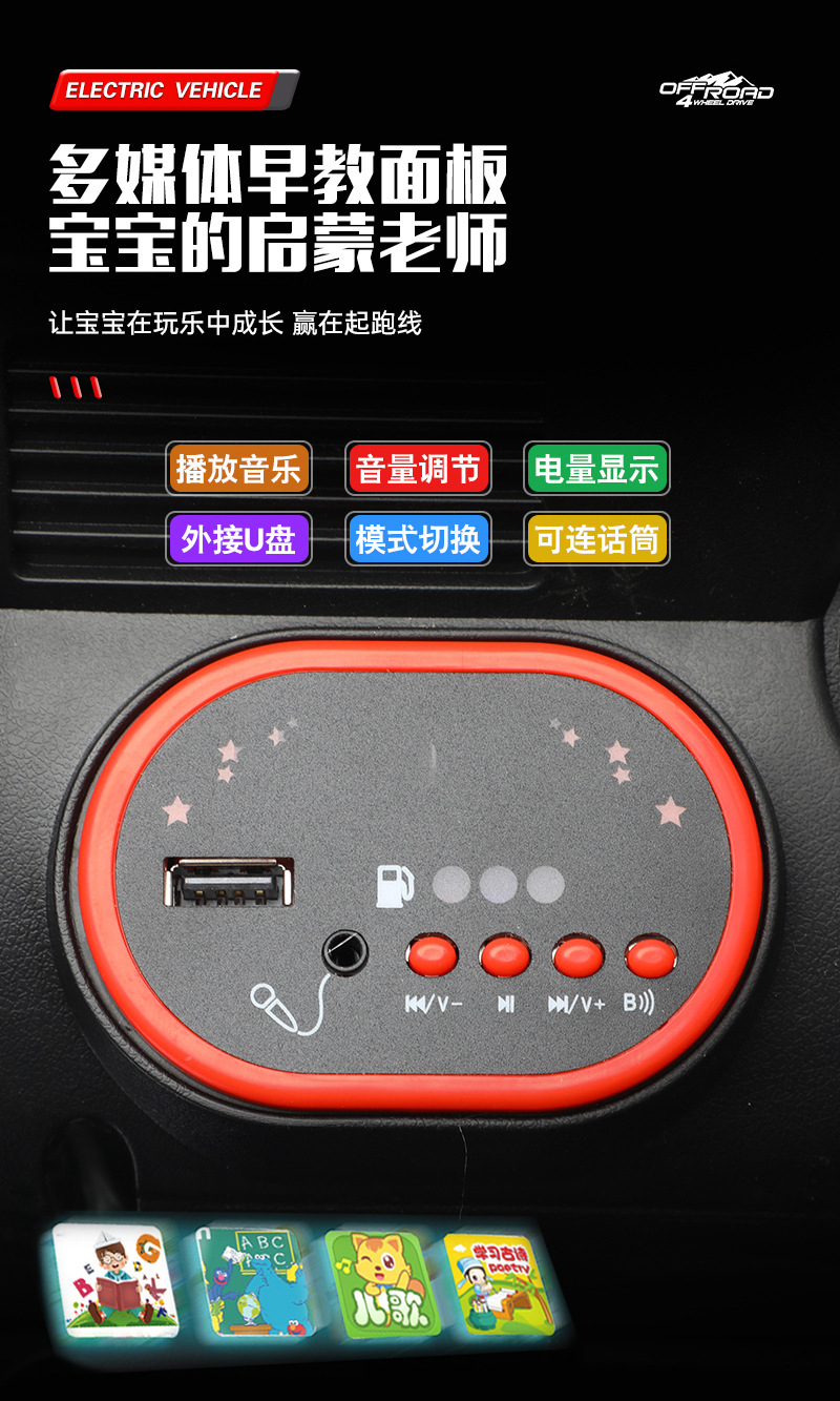 标配音乐灯光遥控器,电子摇摆,遥控,前后仿真车灯,蓝牙,早教 英语,音乐,故事,USB,MP3,防滑轮胎,四轮避震