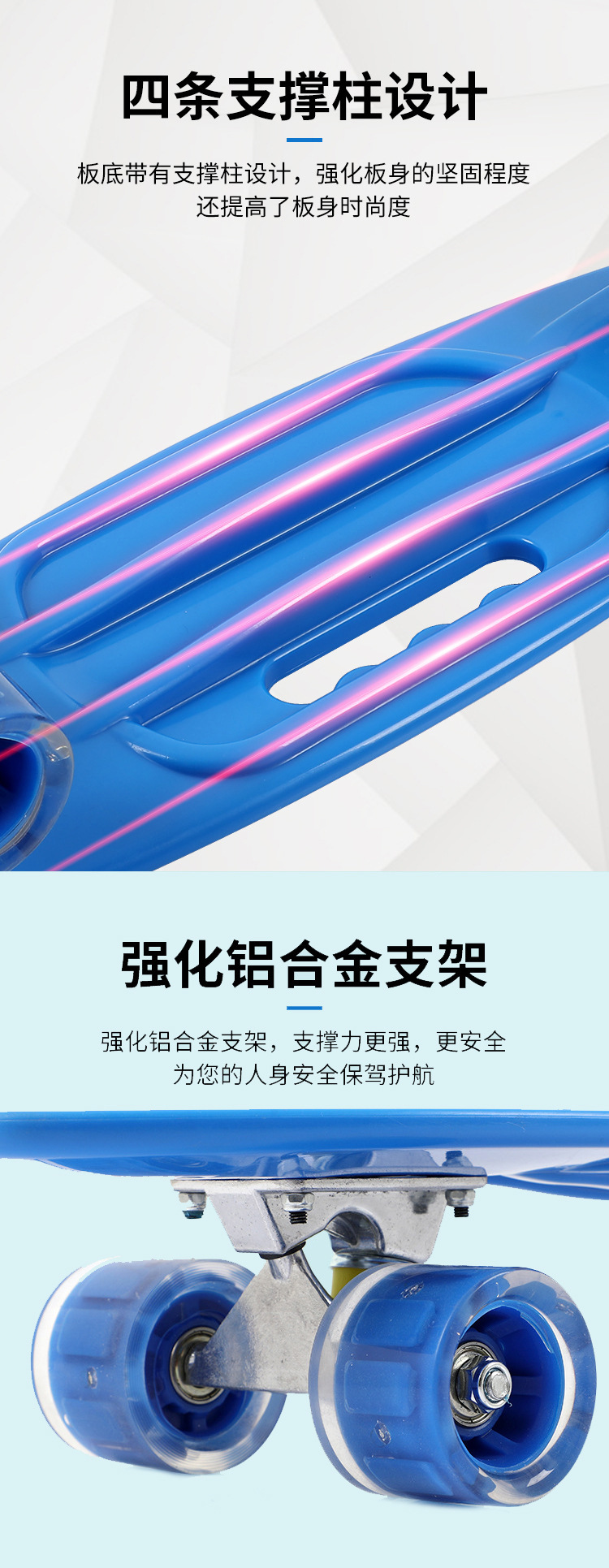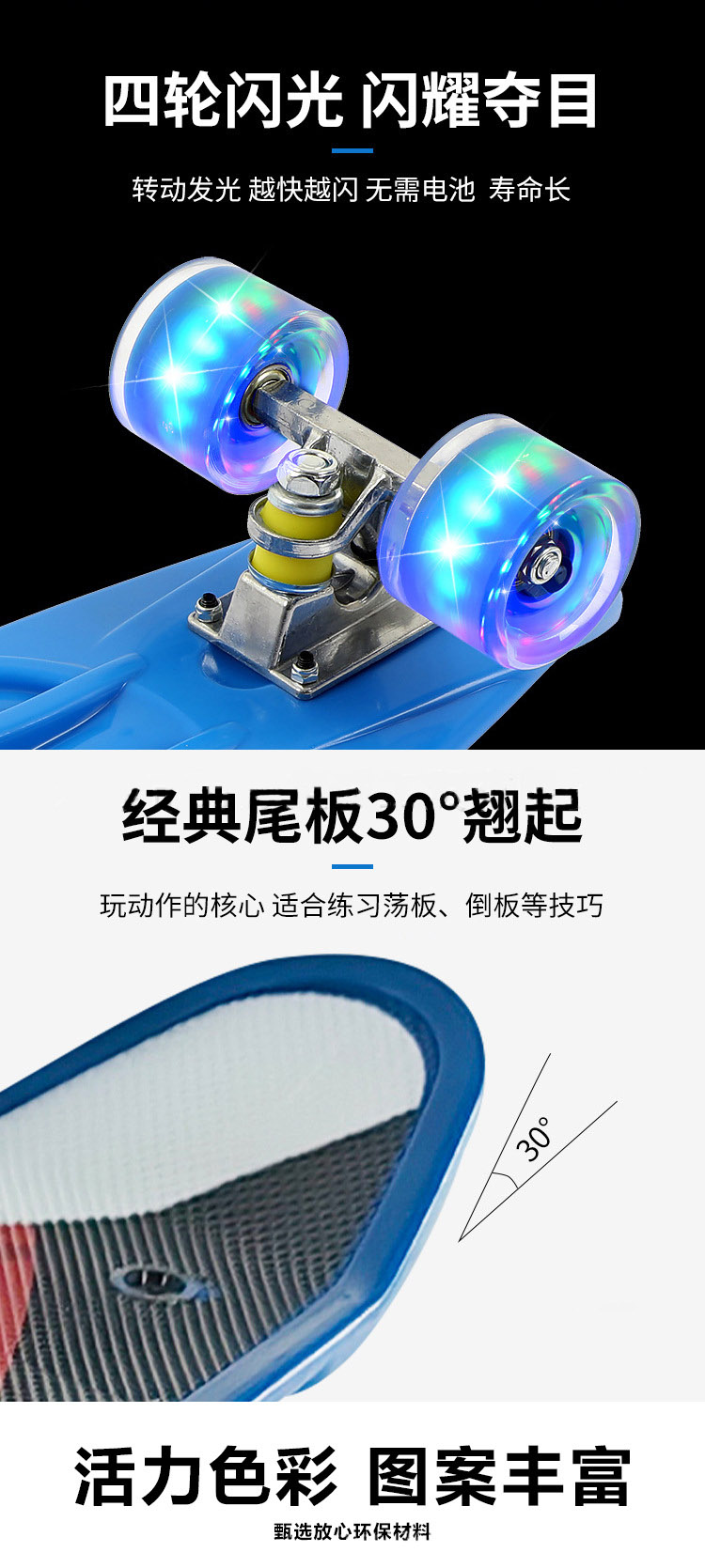 产品类别:滑板材质:PP适用人群:通用板面分类:单翘板尺寸:23.5英寸颜色:图案随机规格:闪光轮