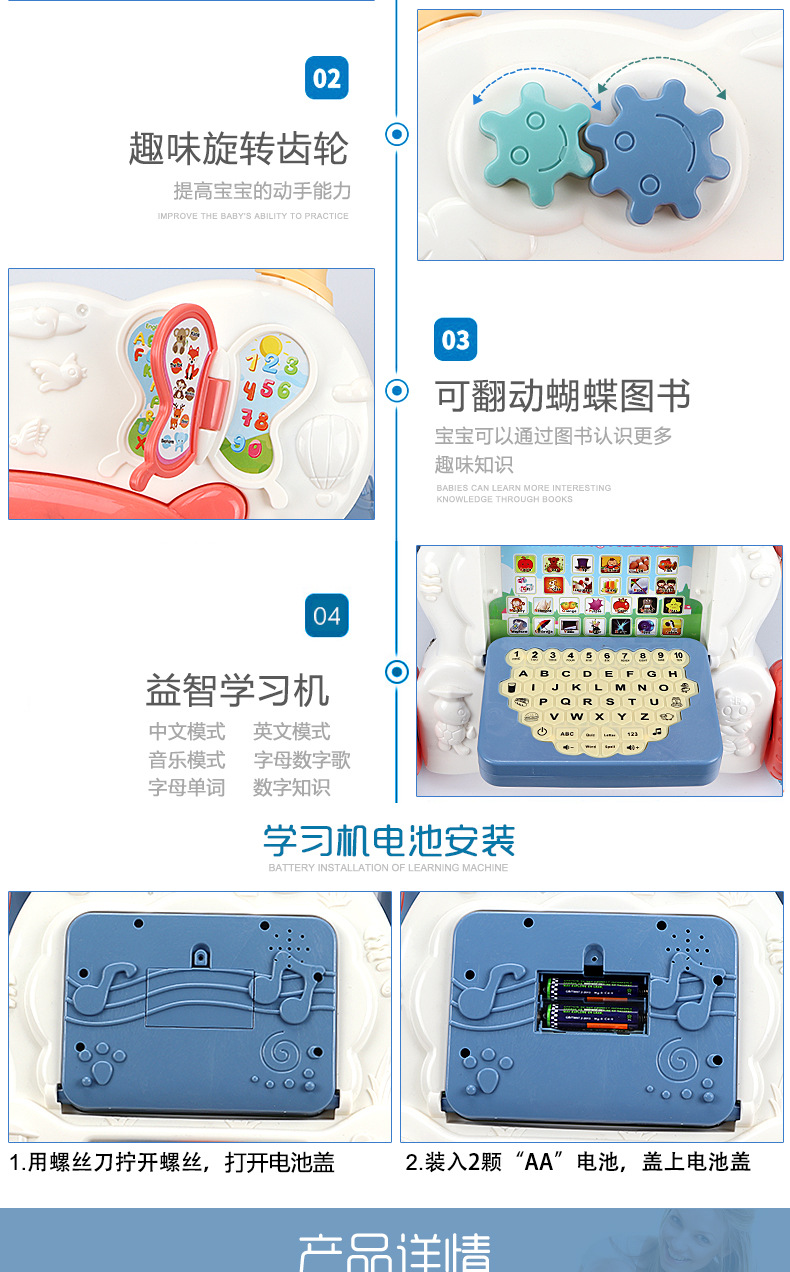 适用人群:不限,男孩,女孩特色功能:音乐,学步包装:彩盒玩具材质:塑胶能力培养:动手动脑,抓握,智力开发,爬行,视觉,兴趣培养,感官,情感,听觉,亲子交流,手眼协调,互动玩具适用年:婴幼(0-3岁)