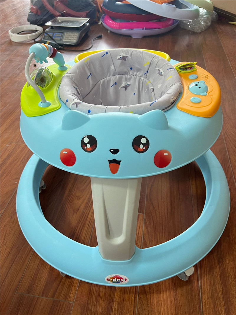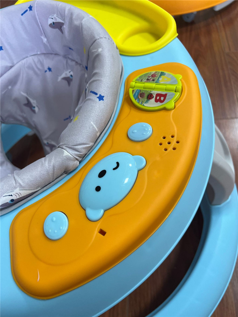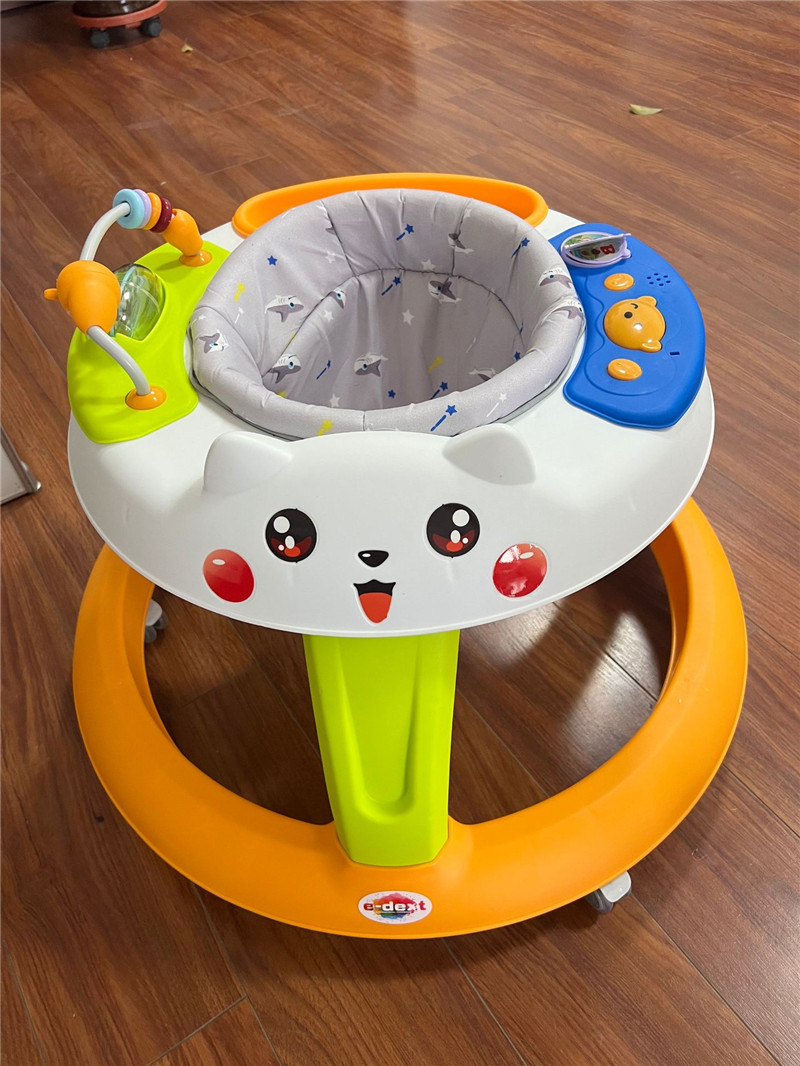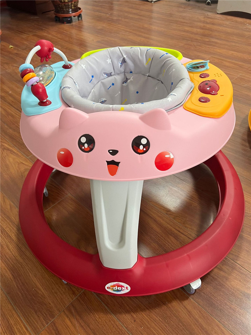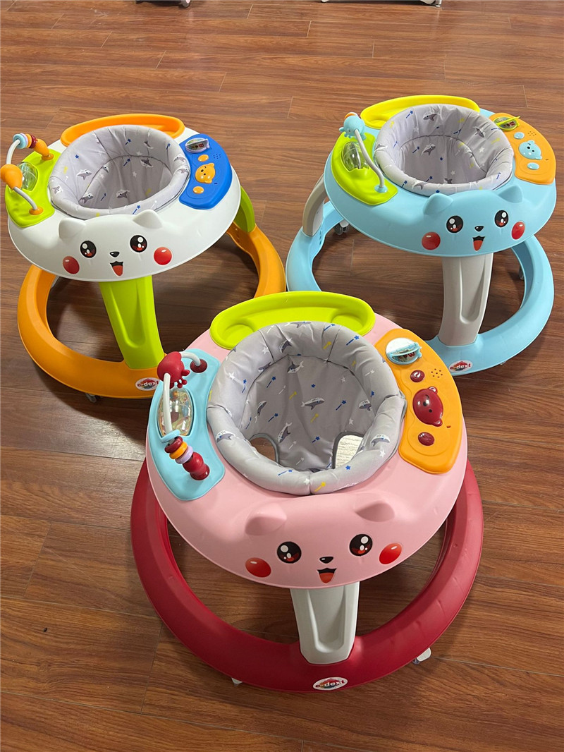 材质:塑料适用年龄:6-12个月,1-3岁,0-6个月功能:有音乐1.静音轮2.坐垫360⁰旋转3.下盘防跌落4.三挡调节5.带音乐