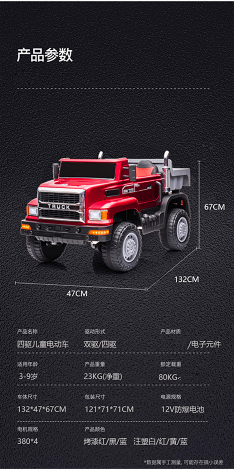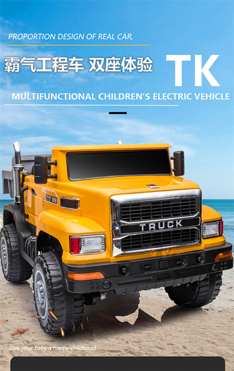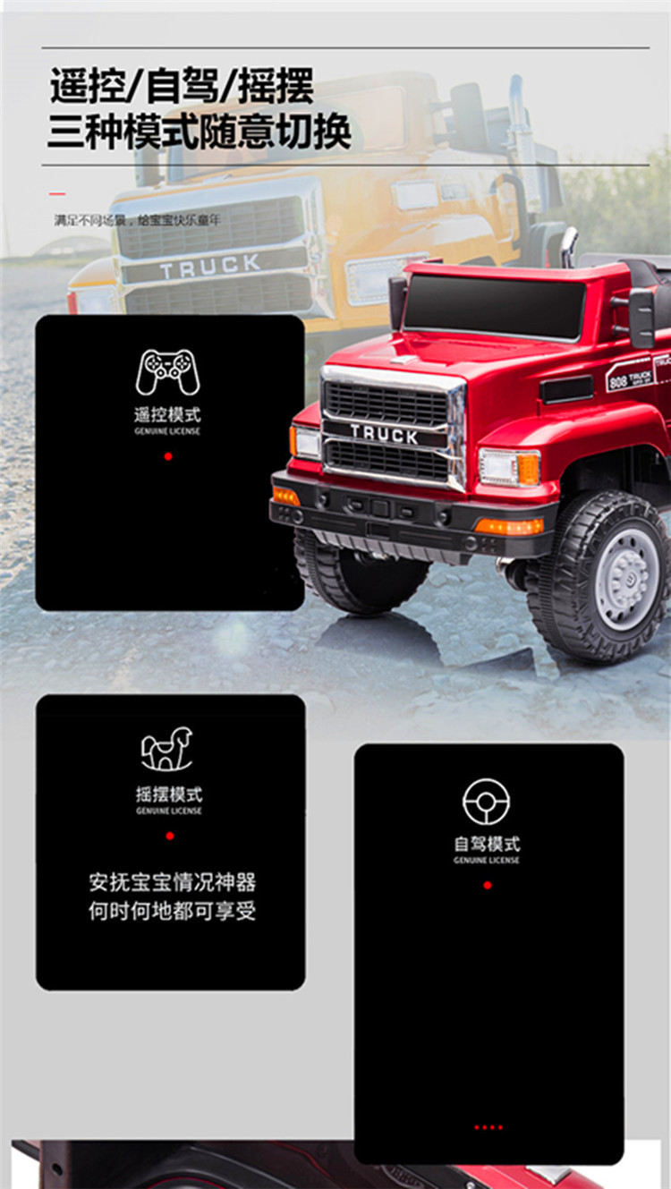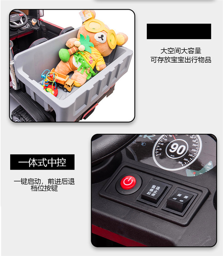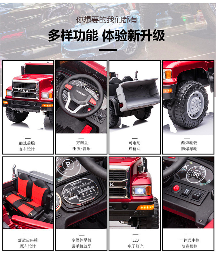 四驱带减震,多种功能能遥控器,可控制调速,缓起缓停,加速减速,音乐切换,揺摆运动,音乐灯光,电源,鸣笛,刹车系统等功能),一键启动,电量显示,电动翻斗手柄操控,带安全锁,仿真前大灯,早教功能,英语故事,LED大灯,USB插口,MP3 插口。