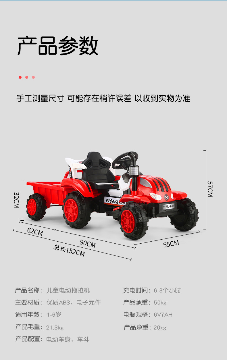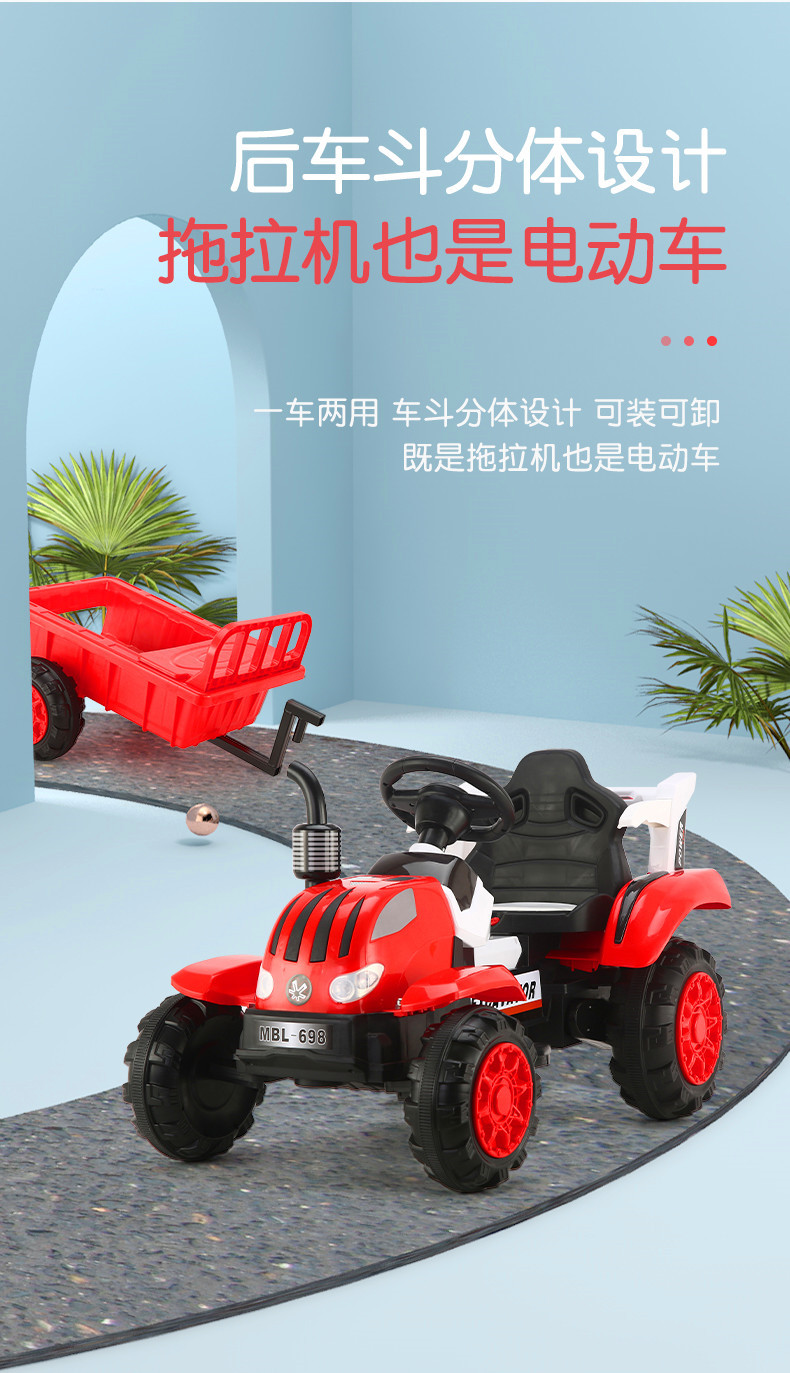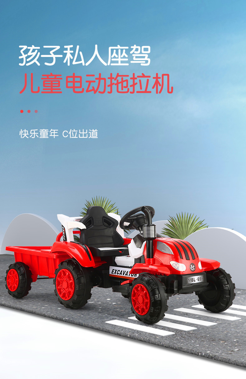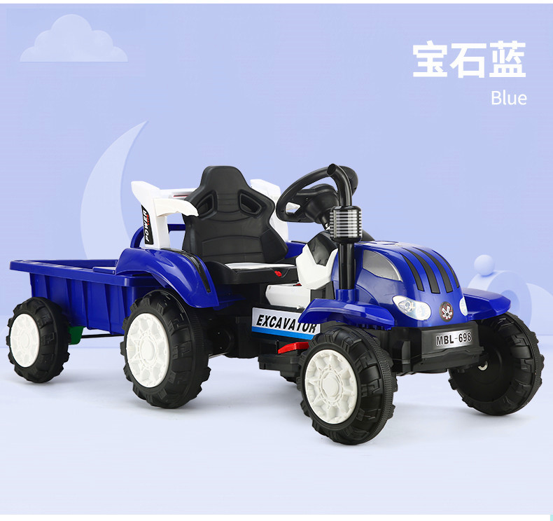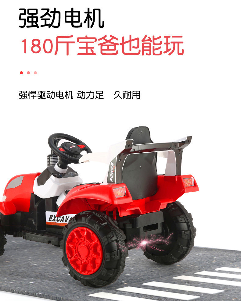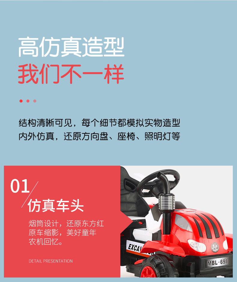 仿真电动拖拉机,仿真方向盘,灯光音乐早教,音量+-功能,一键启动,前进、后退、停止三档位,USB接口,仿真越野车轮不扎胎,脚踩油门,LED大灯,抗冲击PP材质,多种功能能够操作台.皮座椅,遥控