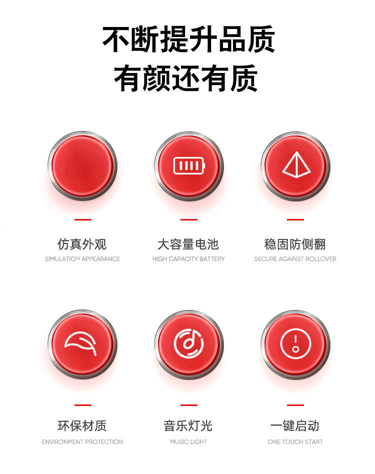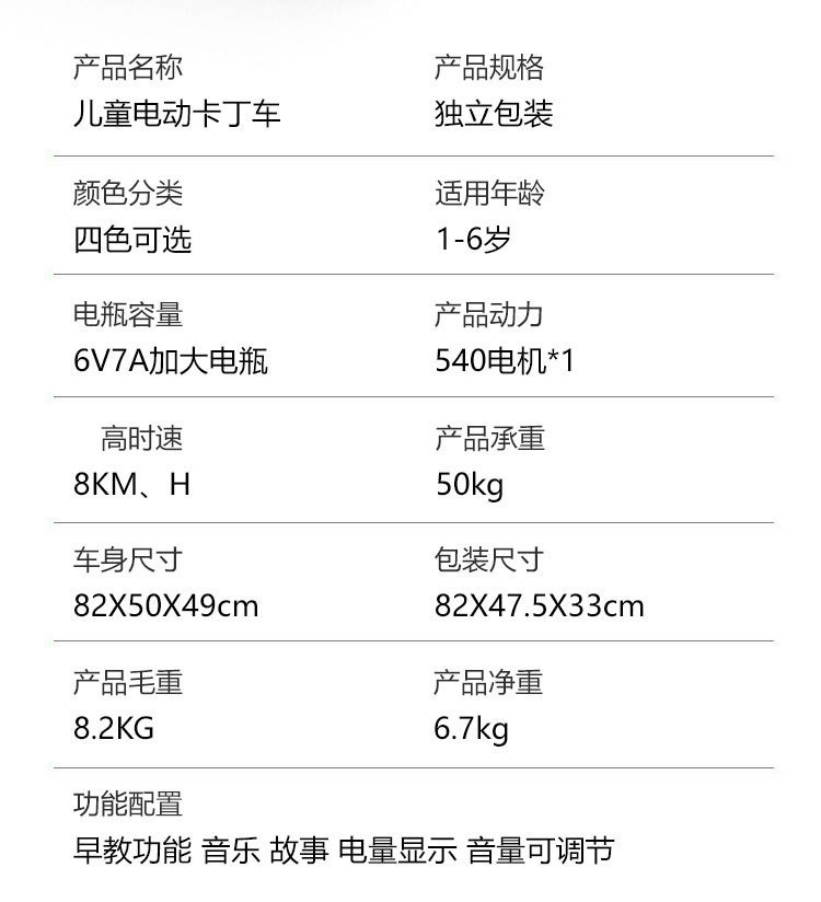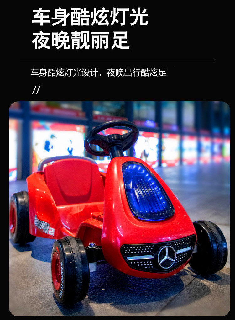 新款儿童电动卡丁车,540W分离式电机,一键启动,早教功能,炫酷英文音乐,故事,电量显示 LED大灯,三档调节功能,缓启动,采用防滑耐磨轮胎,舒适车座,环保聚丙烯PP料,每箱一台