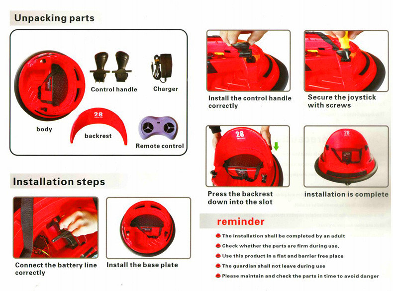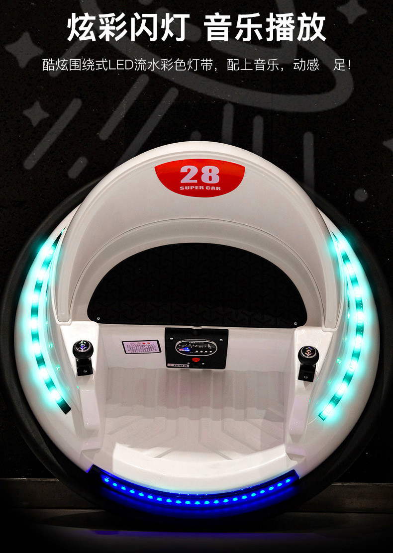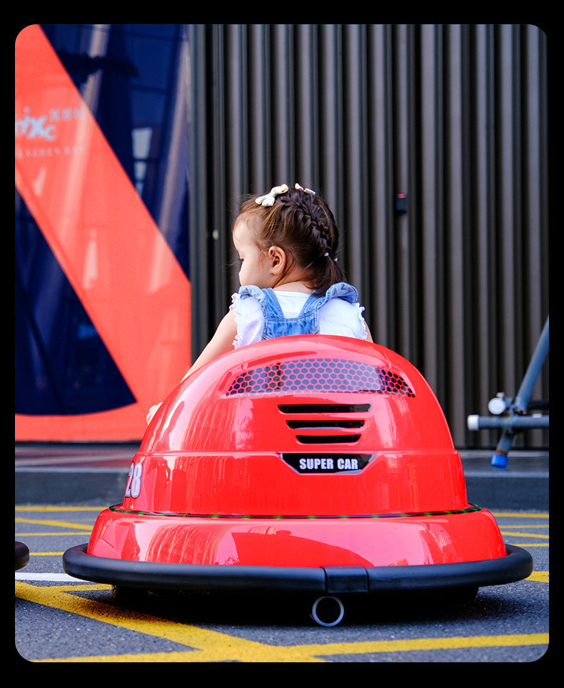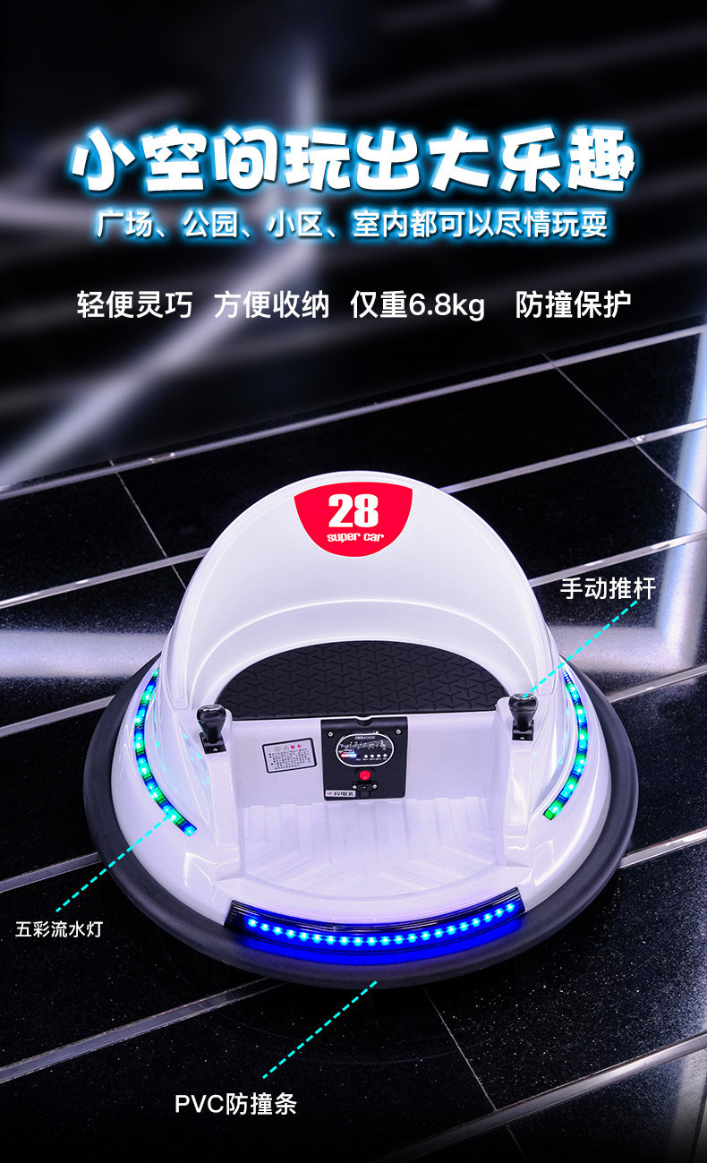 互动型儿童电动碰碰车,360度旋转万向轮,对一2.4G遥控器,LED七彩灯光,两个万向控制杆,转向灵活,全方向行驶,一键刹车,双电双驱马达,炫酷环绕式LED灯带,动感音乐,音量可大小调节,环保软质PVC车体防撞条,防震静音弹性碰撞,全封闭底盘。