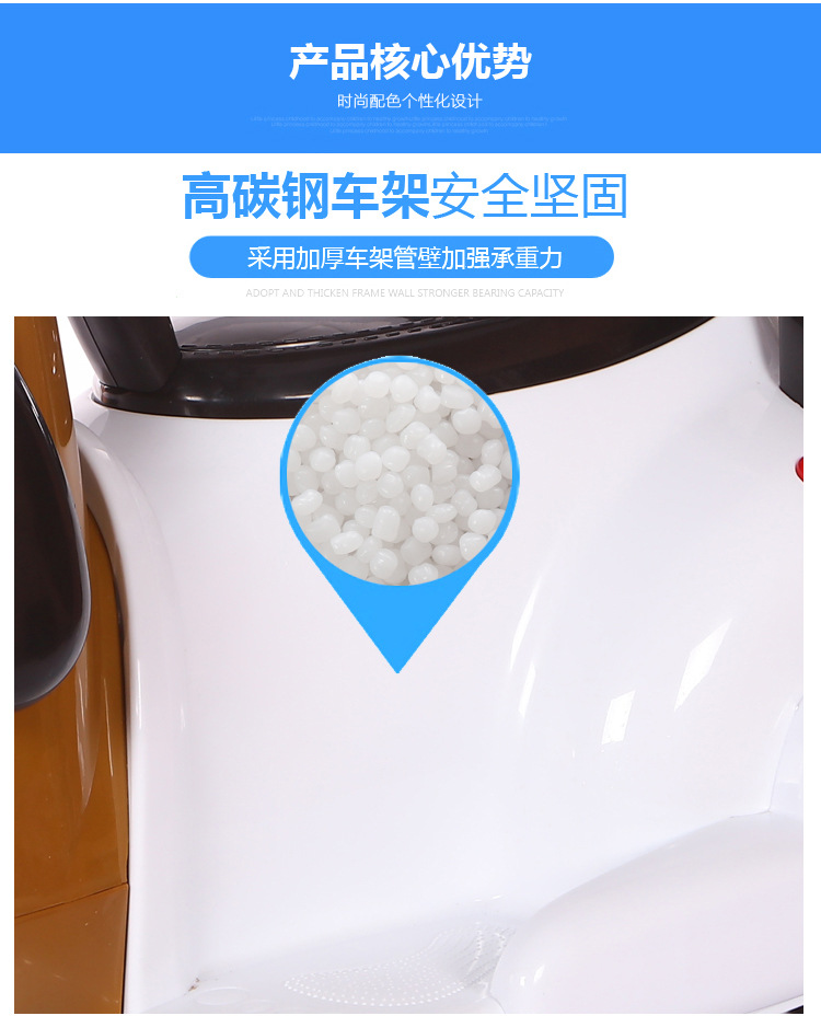 1.真车一键启动控制开关 2.前后LED灯独家设计工艺 3.钢梁车架与PVC环保耐摔外壳组成 4.可调节音量大小 5.升级重低音喇叭设计,无杂音 6.人性化脚踩油门设计,踩住启动,松开停止,安全可靠,自由控制 7.前进,停止,后退三挡调节 8.靠背护栏计,