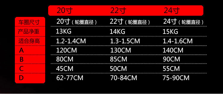 一体轮变速折叠减震款20寸,变速折叠减震款20寸,变速折叠减震款22寸,低配促销款。颜色:黑红色,黑蓝色
