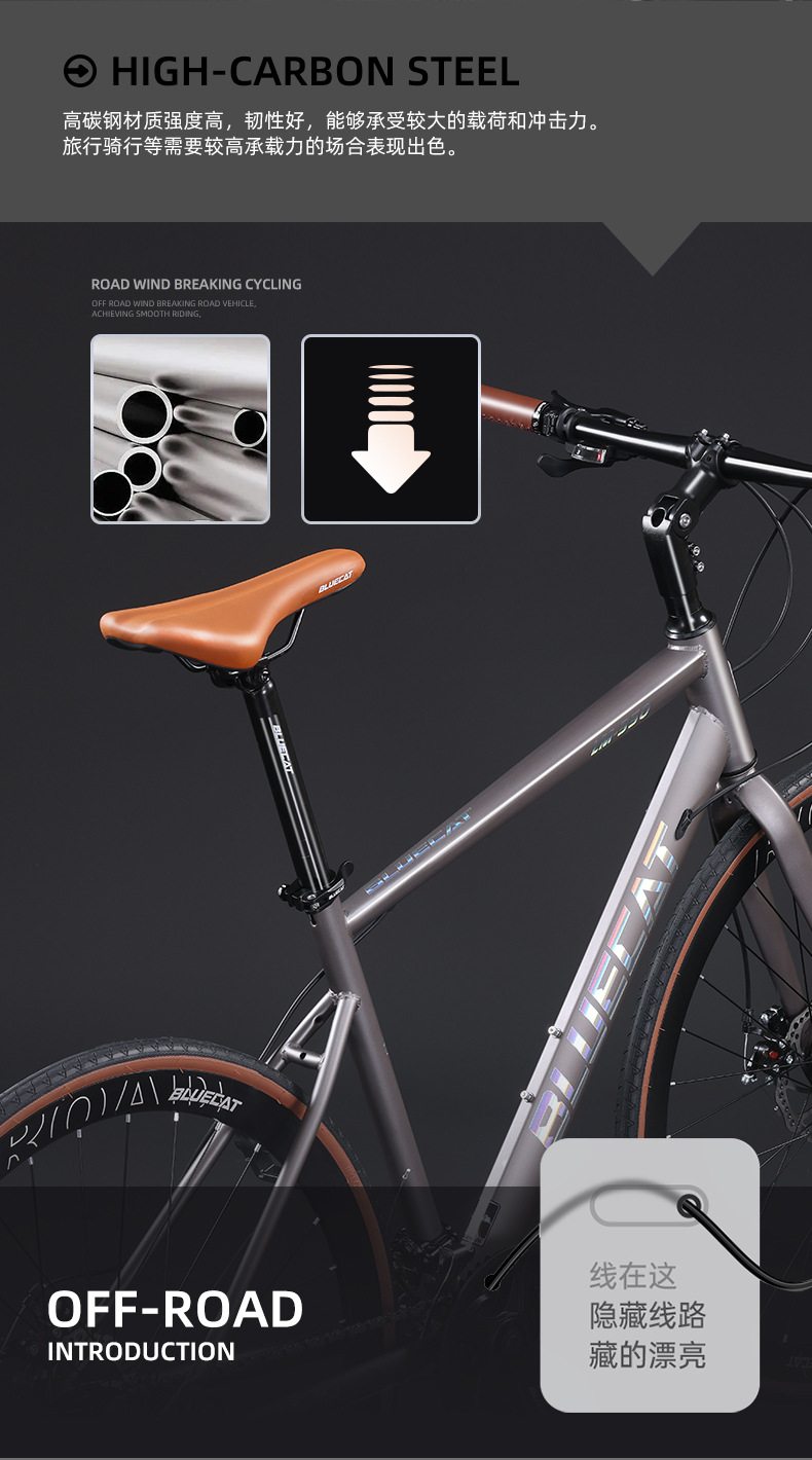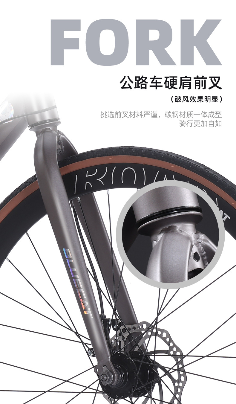 尺寸:24(英寸) 推进模式:链条 载重量:250kg(kg) 材质:碳钢车用途:运动车 车架结构:整体车 脚踏类型:普通脚踏制动系统:蓝图24速变速系统 车架类型:无尾车架前叉类型:无避震硬叉刹车类型:双碟刹款型:公路车 配置等级:高碳钢内走线车架