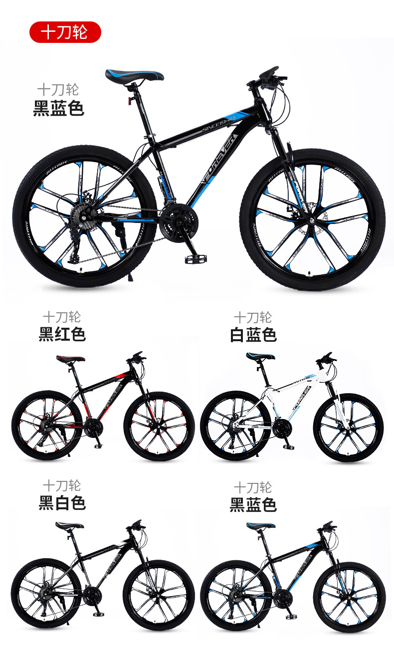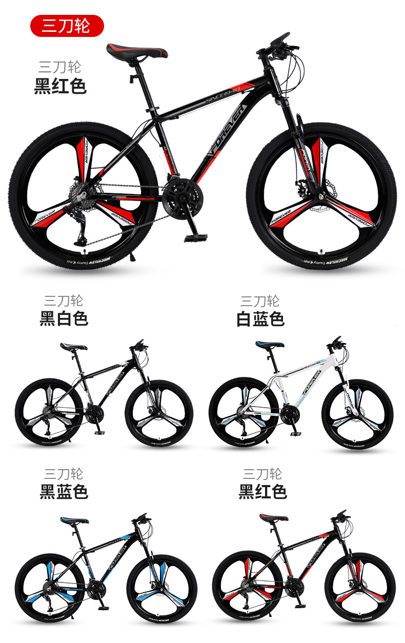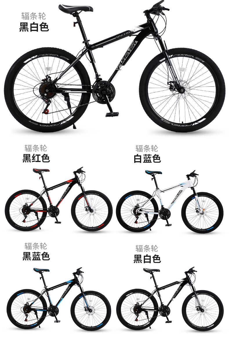 黑白色,黑红色,黑蓝色,白蓝色,炫彩蓝。钢架辐条,钢架三刀,钢架十刀。铝架辐条,铝架三刀,铝架六刀,铝架十刀。24英寸,26英寸,27.5英寸。21速,24速,27速,30速