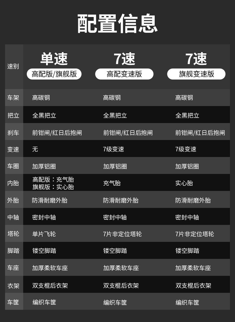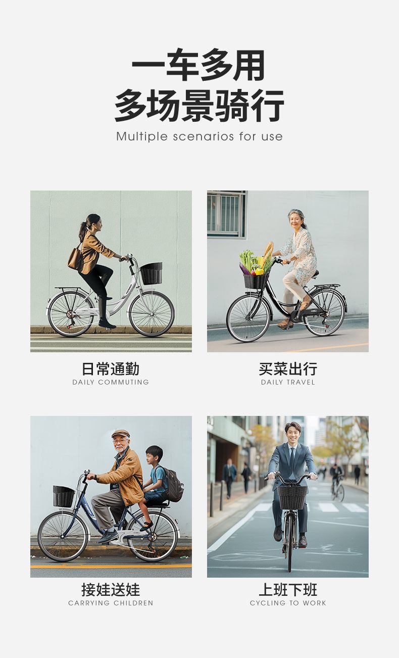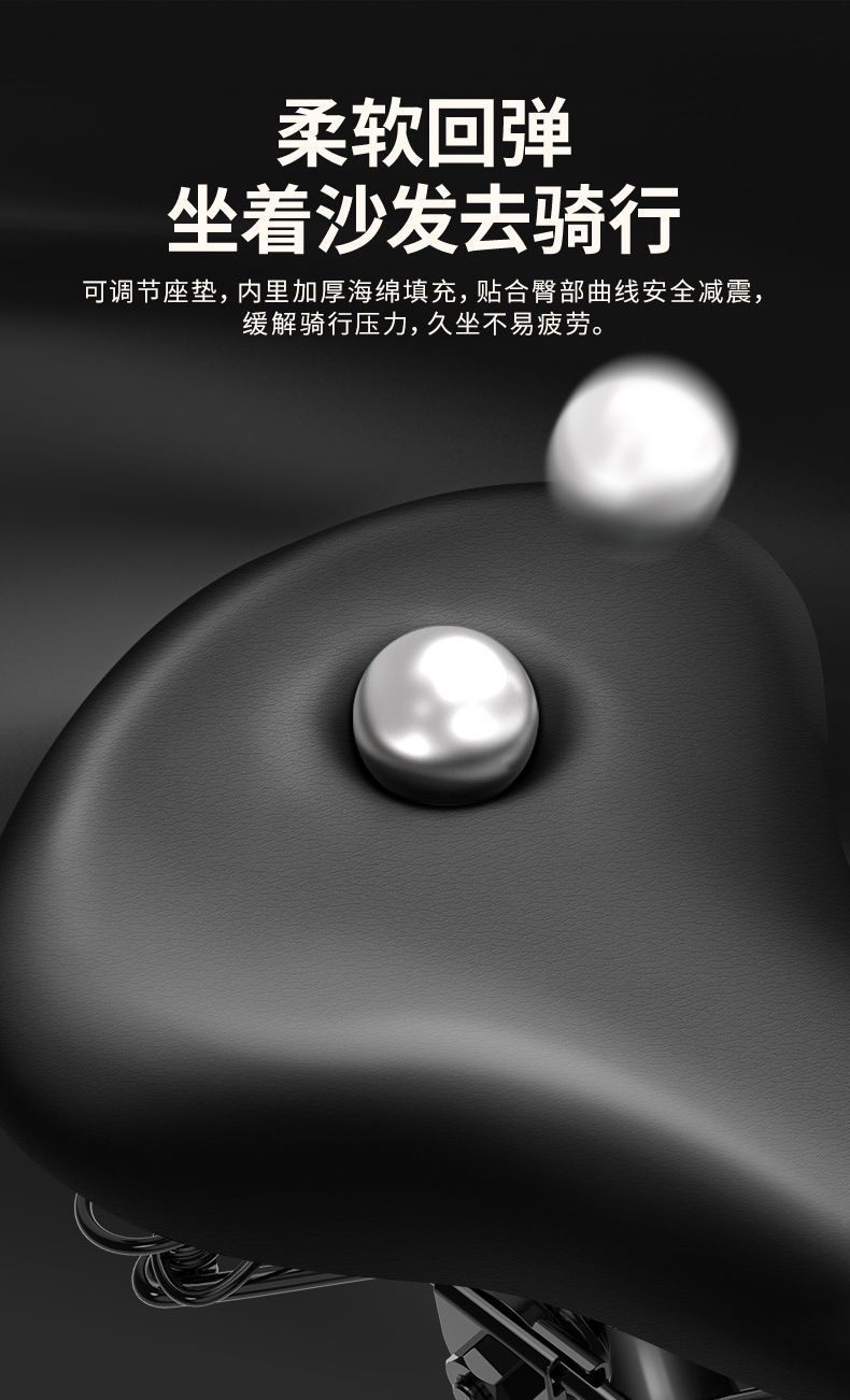 曜石黑,珍珠白,磨砂灰,宝石蓝,橄榄绿,【靠背款-仿藤车筐】充气胎,【靠背款-仿藤车筐】实心胎。22寸,24寸,26寸。单速,变速