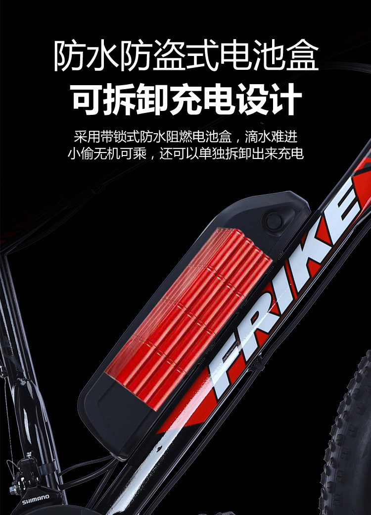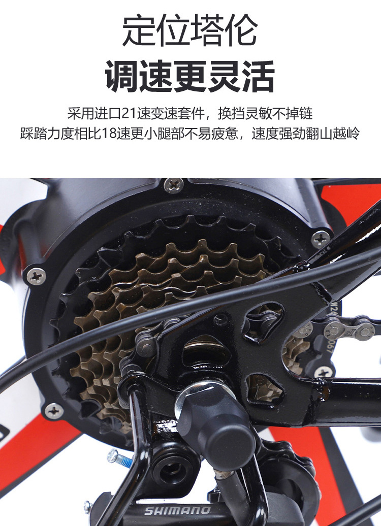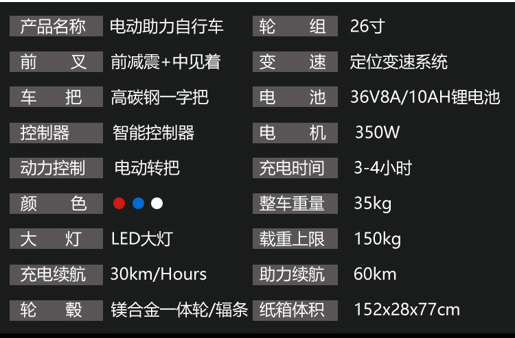 黑红色,黑蓝色,黑白色,黑灰色。21速液晶36V8A26公里,21速液晶36V10A42公里,21速液晶一体轮36V10A42公里