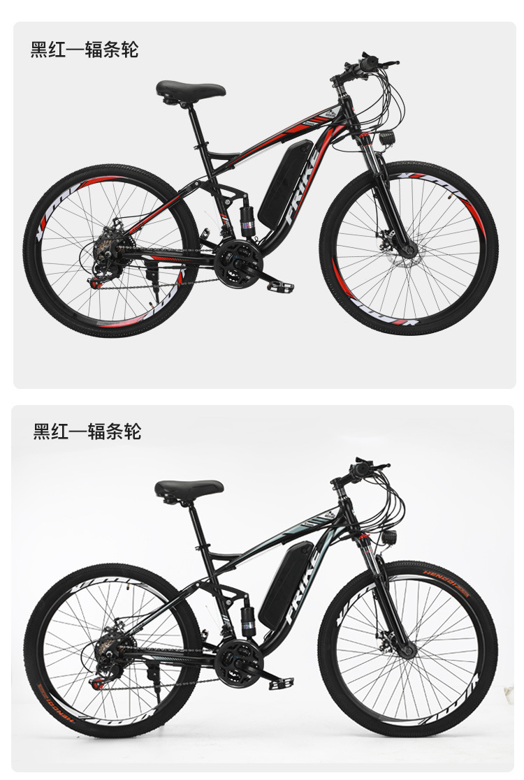 26寸液晶36V8A35公里,26寸液晶36V10A50公里,27.5寸液晶36V10A50公里,26寸液晶一体轮36V10A50公里。颜色:黑红色,黑蓝色,黑灰色
