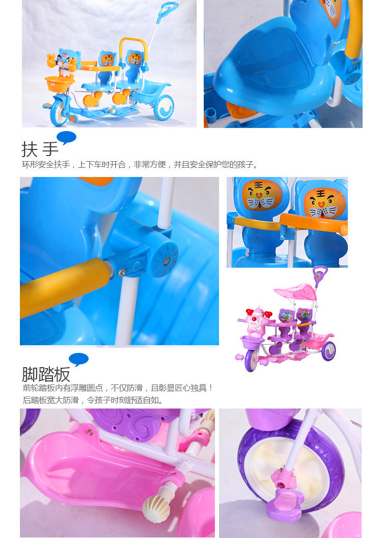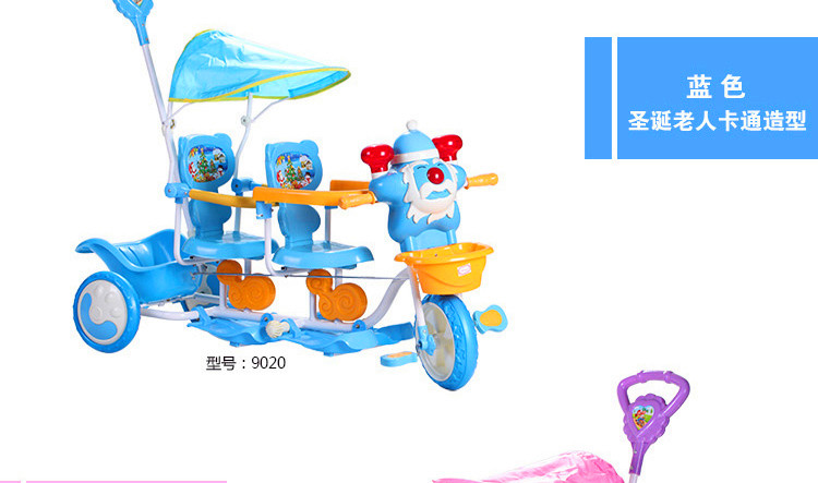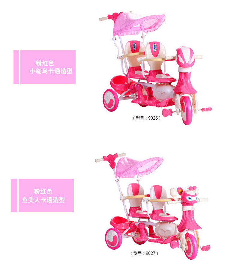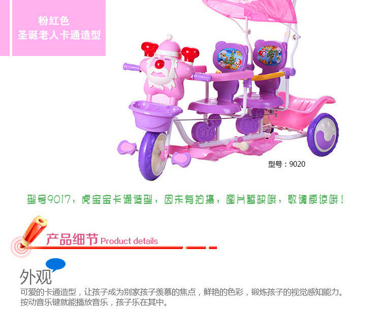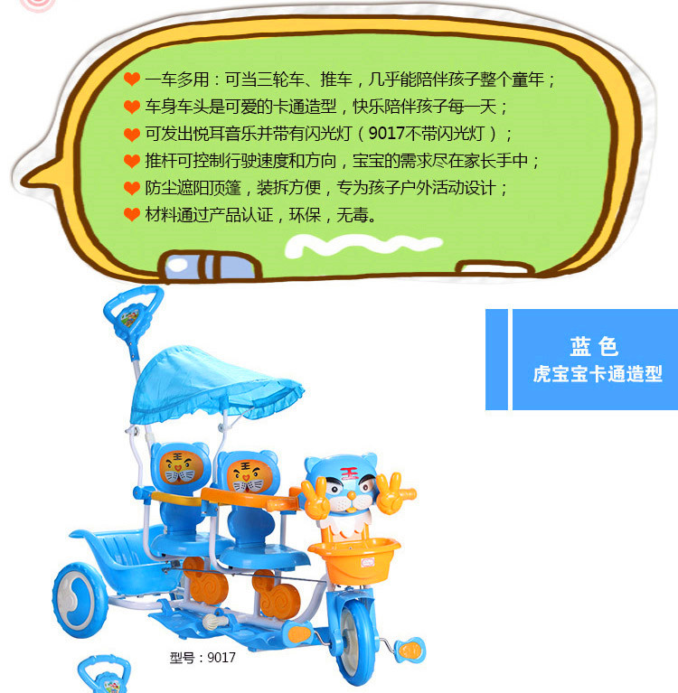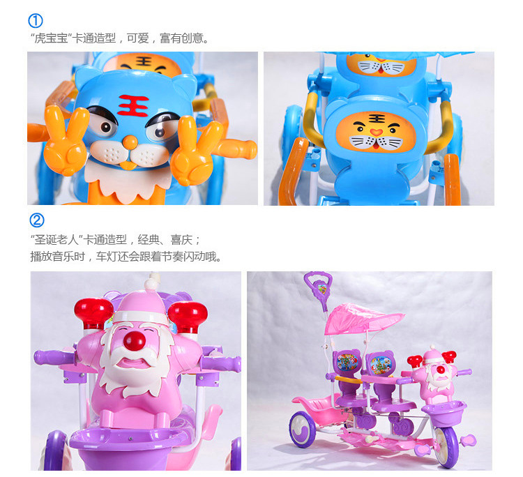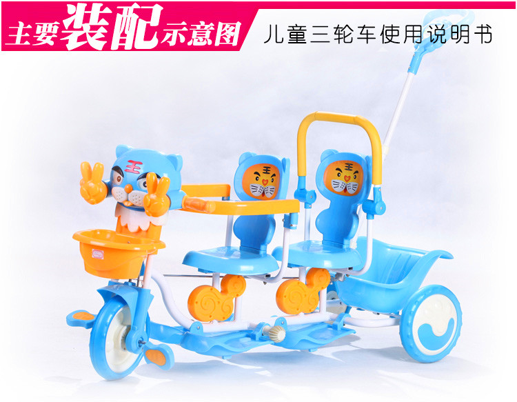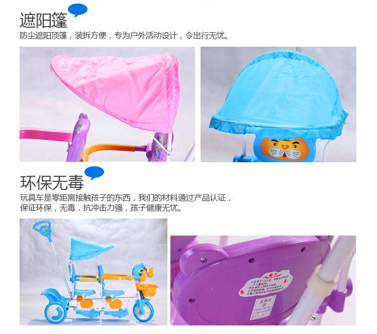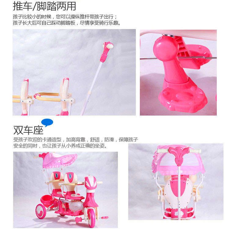 儿童双胞胎三轮车 脚踏车双座带推杆音乐 带遮阳蓬