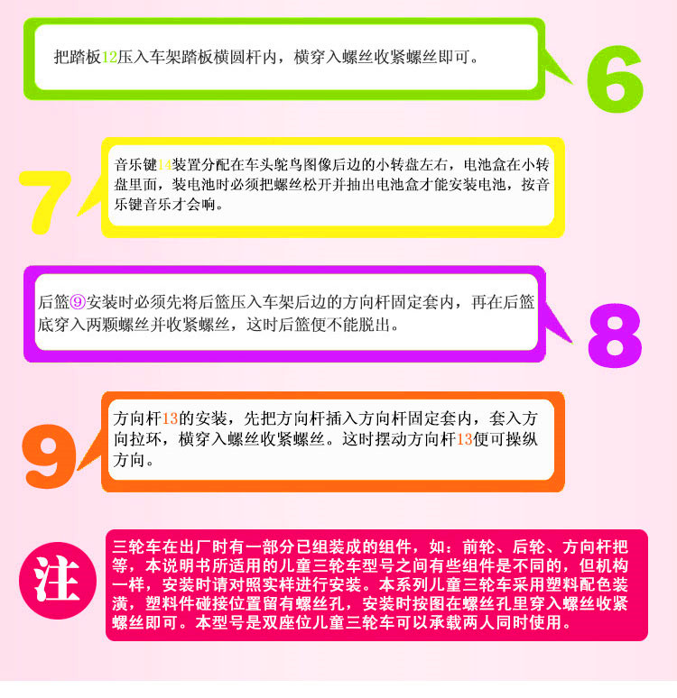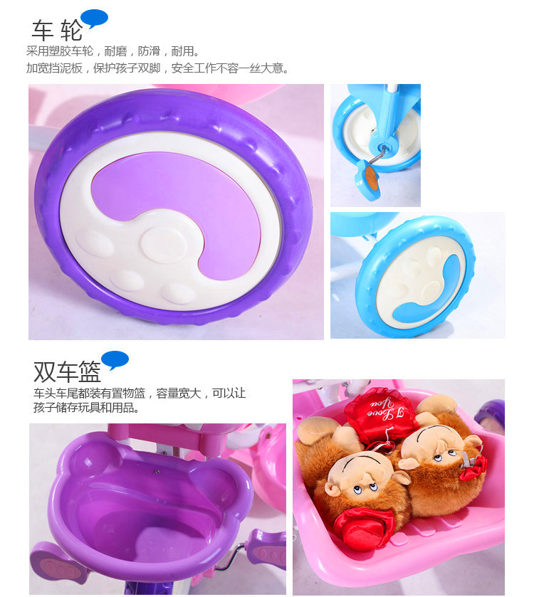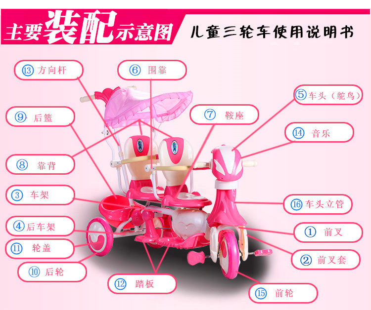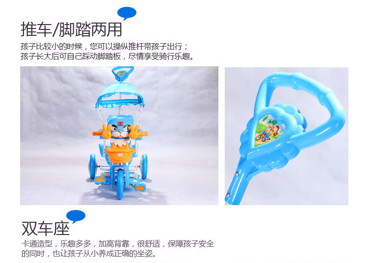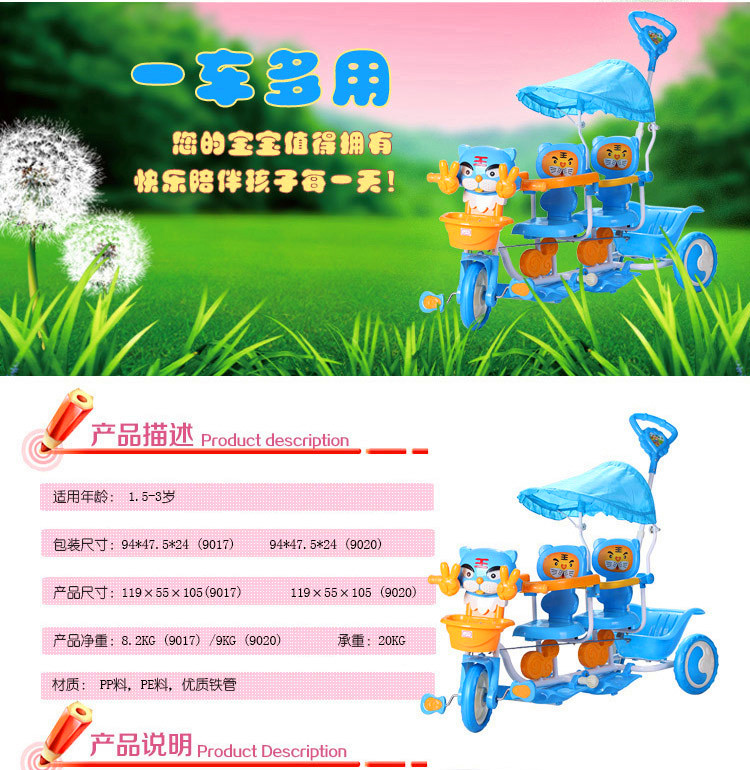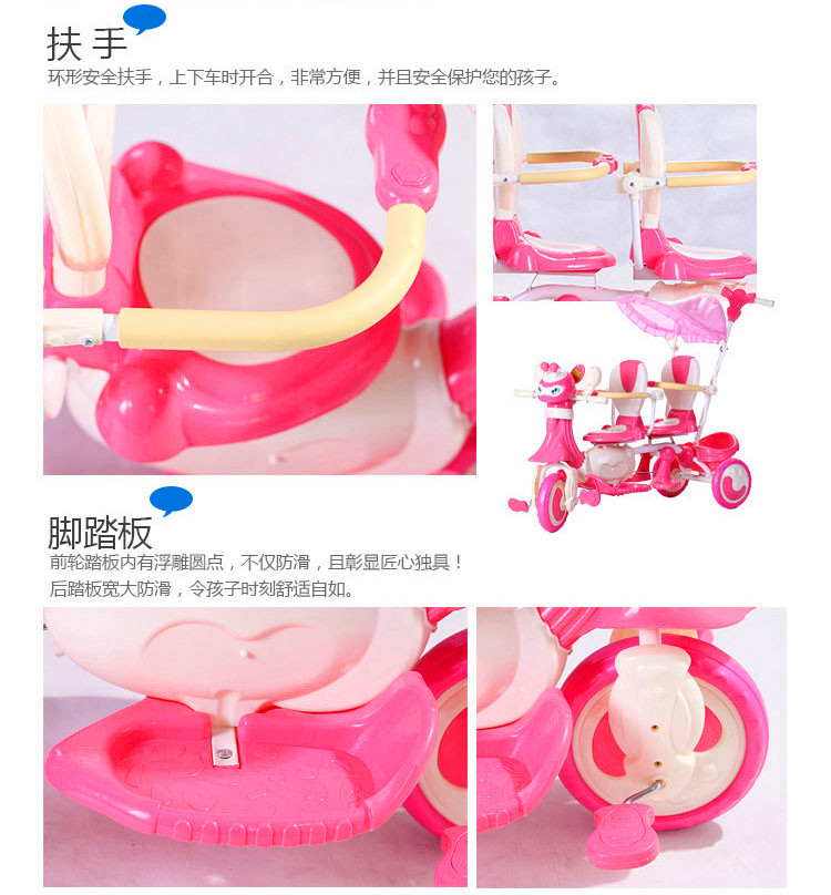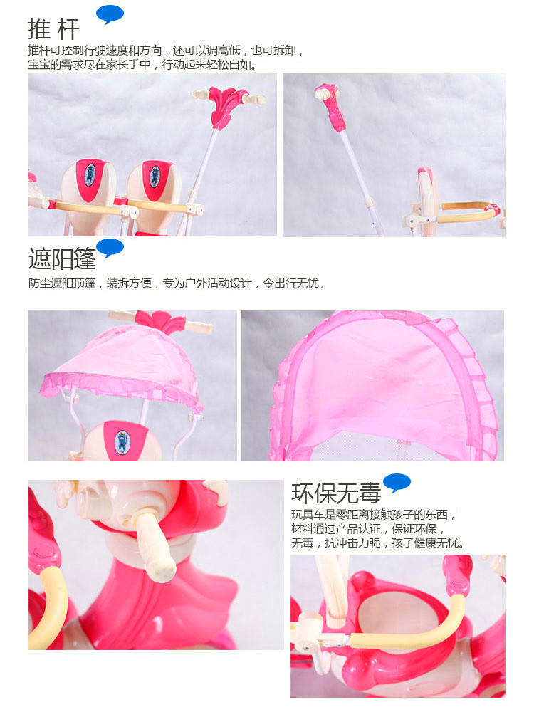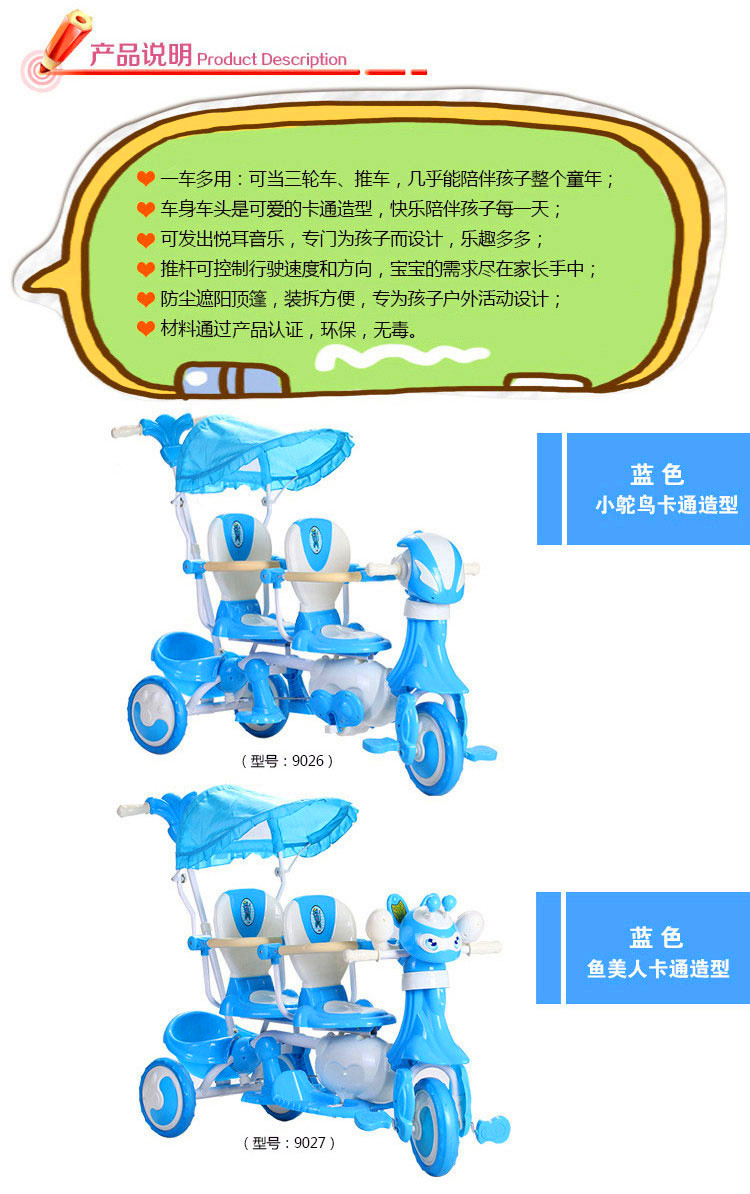 儿童双胞胎三轮车 脚踏车双座带推杆音乐 带遮阳蓬