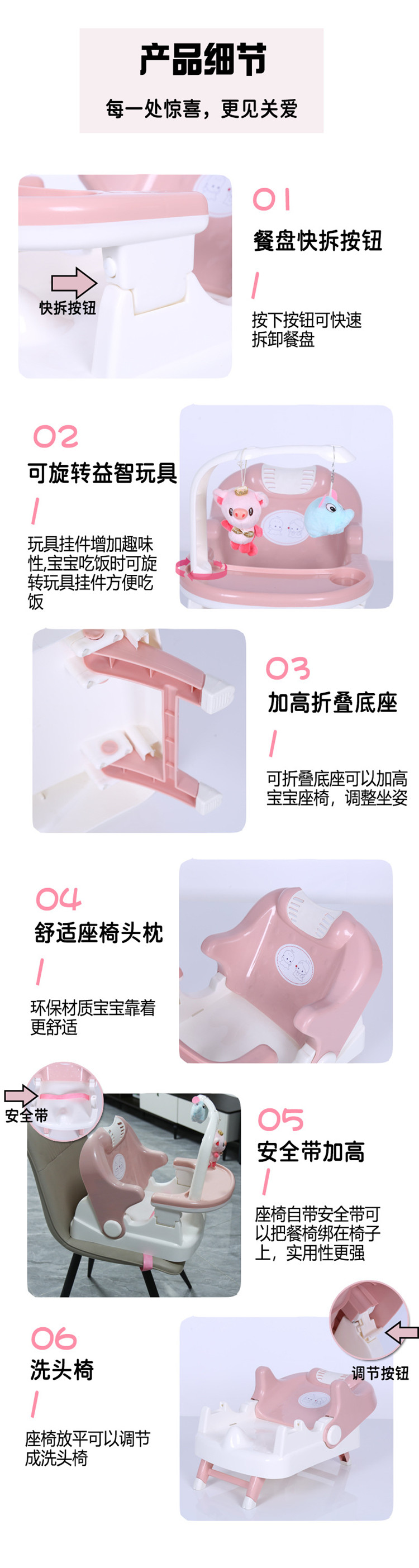 货号:034-TCZD注册会员可查看: 体积.重量等参数,并可自动生成订单合同,自动汇总数据,选配功能!PP材质 承重: 25KGS餐椅+洗头椅+洗澡椅三合一产品,靠背可三档调节,快速拆卸餐盘,支腿可一键收纳 带安抚玩具