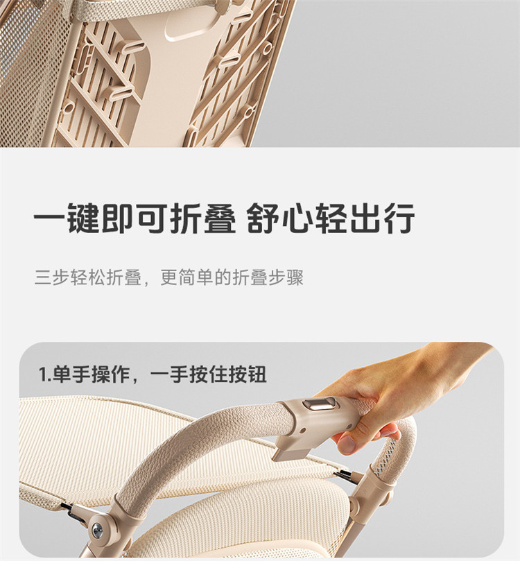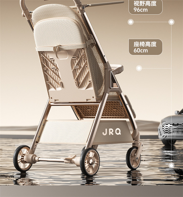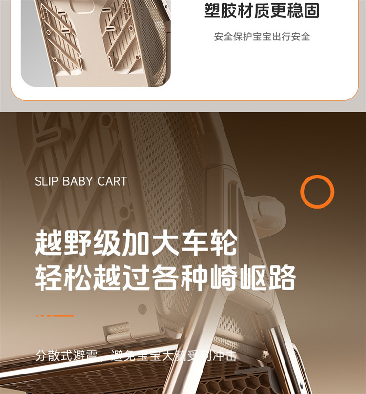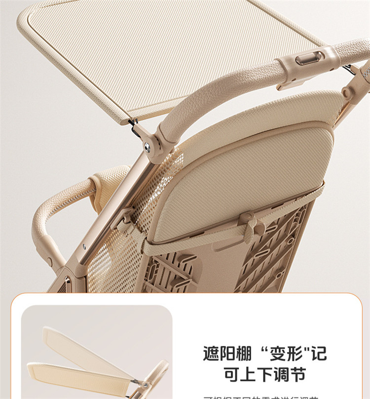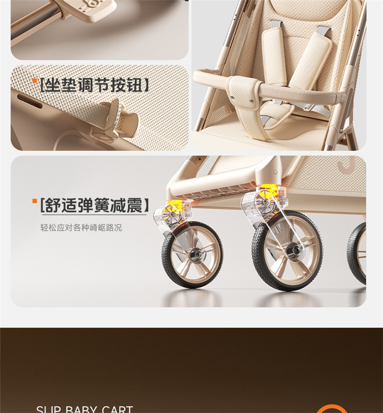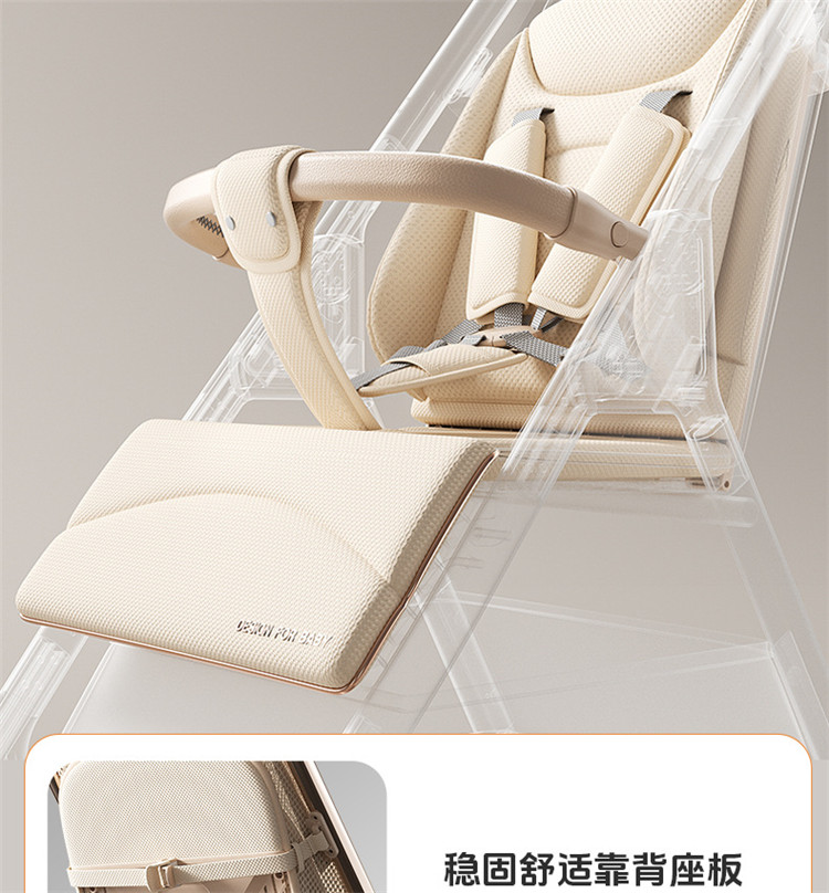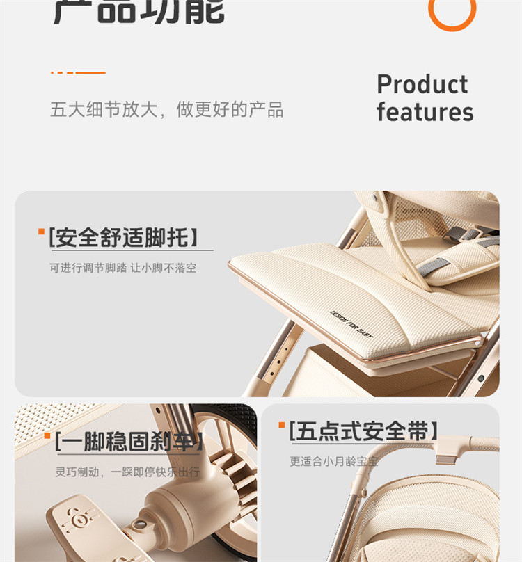加厚加固的铝合金框架,防侧翻设计,一键式折叠,五点式安全带,加宽座椅,一脚刹车,真皮手柄,拉力绒面料,铝管材料采用氧化工艺,可调靠背,耐磨EVA发泡轮胎,前轮6寸,后轮8寸。
