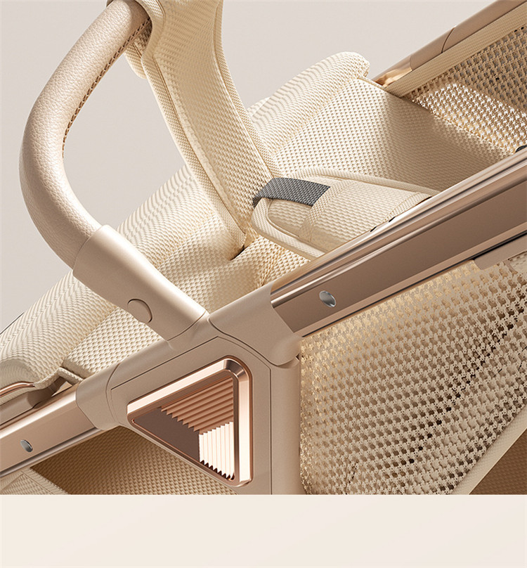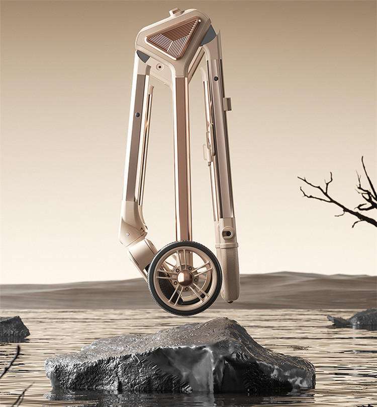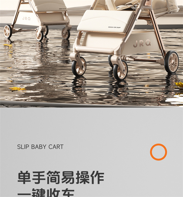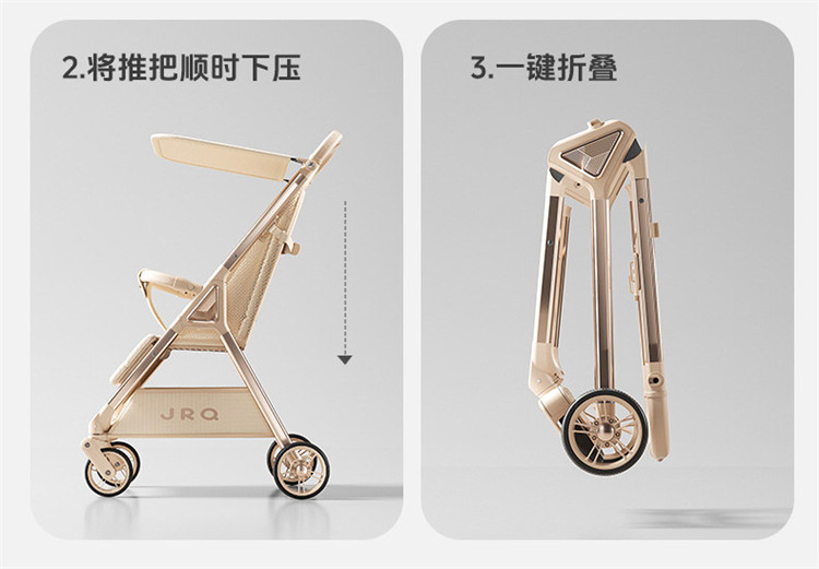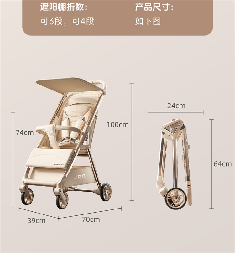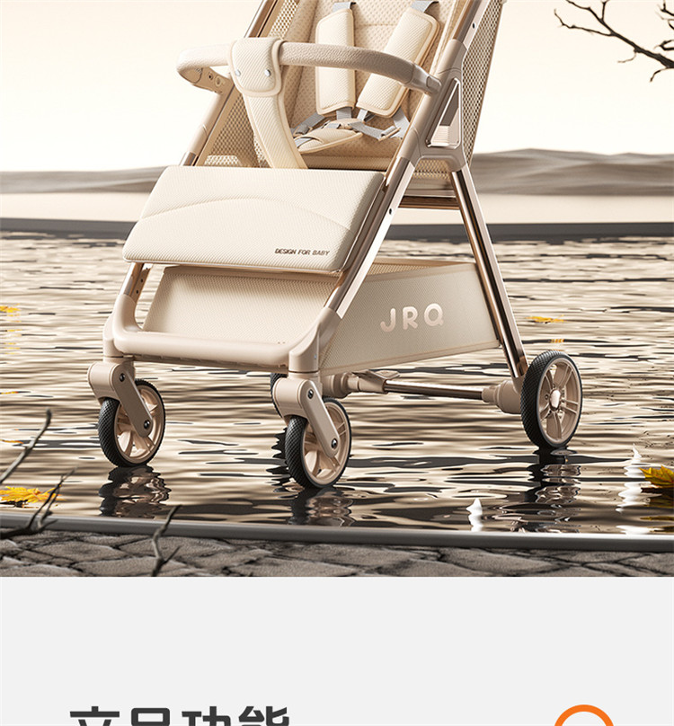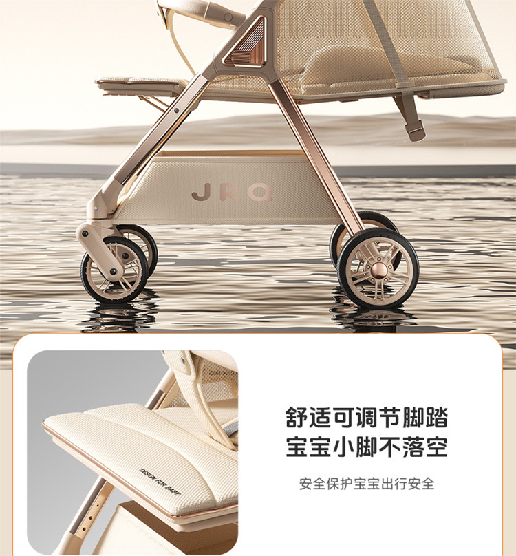 加厚加固的铝合金框架,防侧翻设计,一键式折叠,五点式安全带,加宽座椅,一脚刹车,真皮手柄,拉力绒面料,铝管材料采用氧化工艺,可调靠背,耐磨EVA发泡轮胎,前轮6寸,后轮8寸。