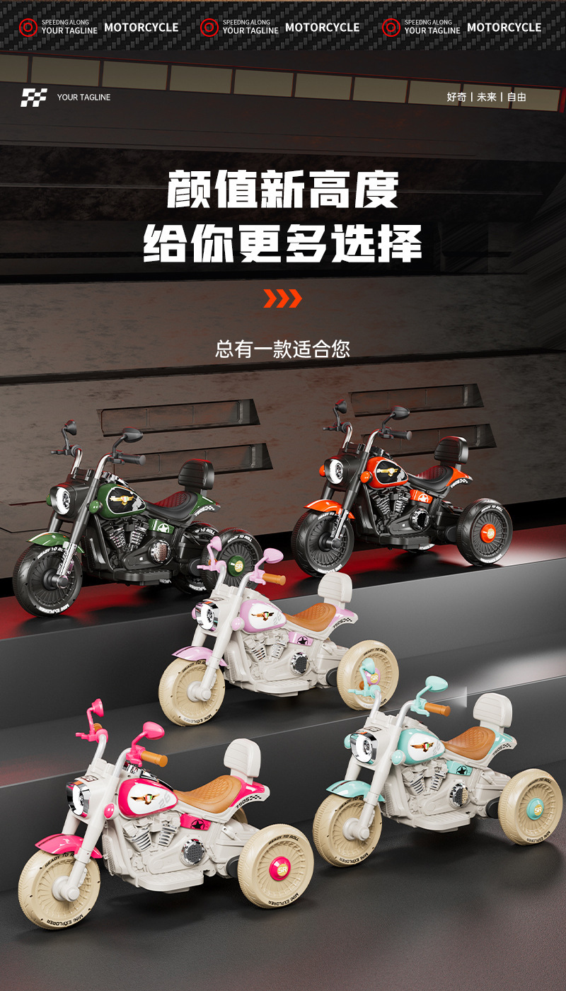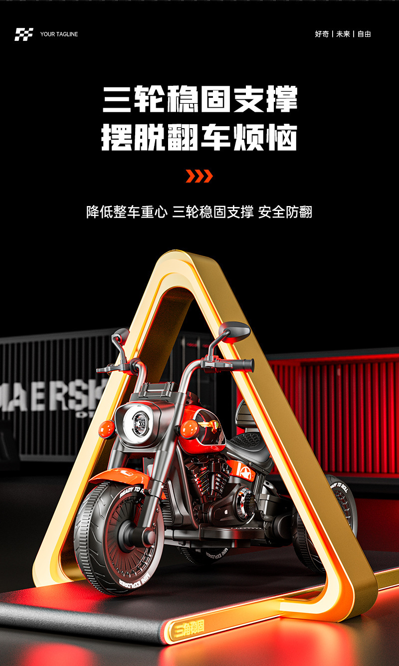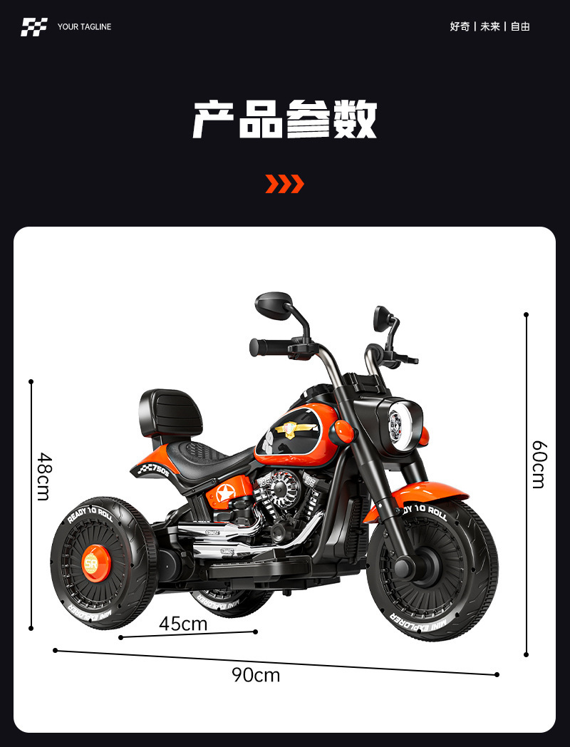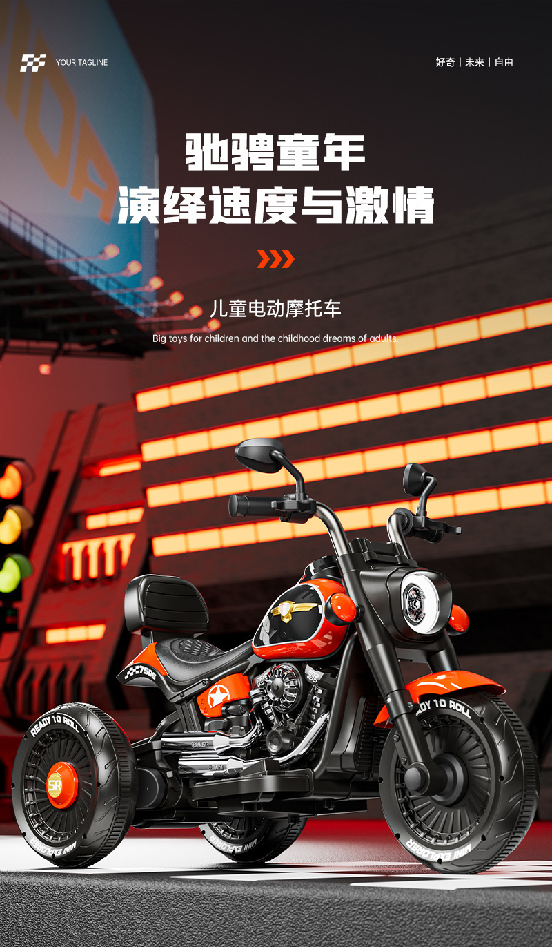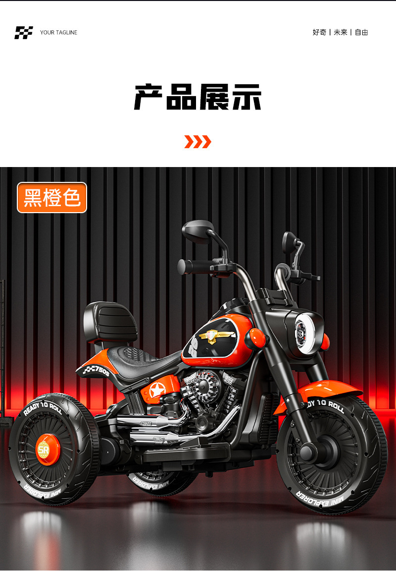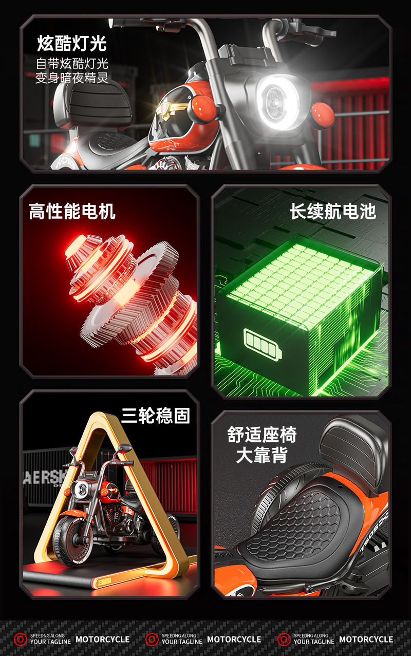 1:仿真车型;2:炫彩灯光;3:蓝牙音乐;4:遥控操作;5:一键启动;6:三轮款
