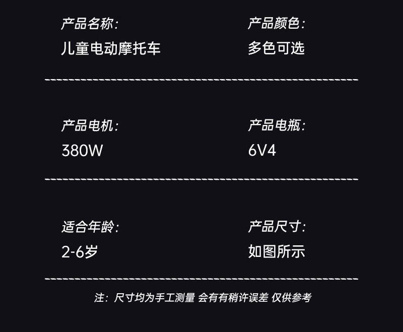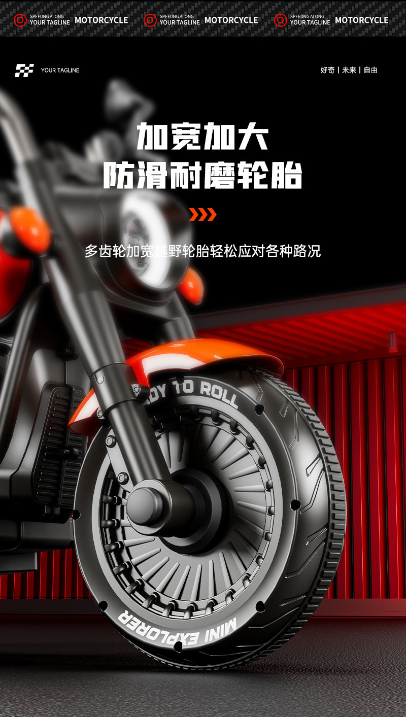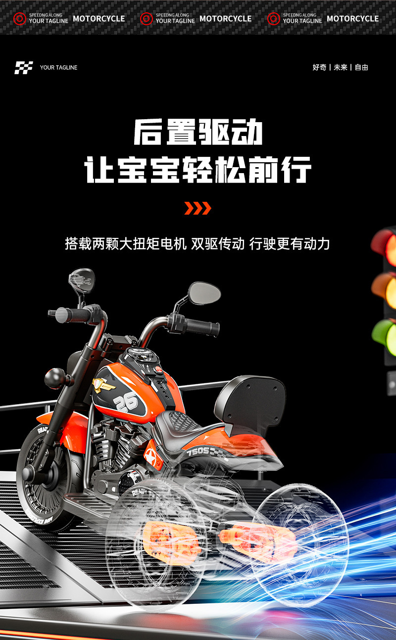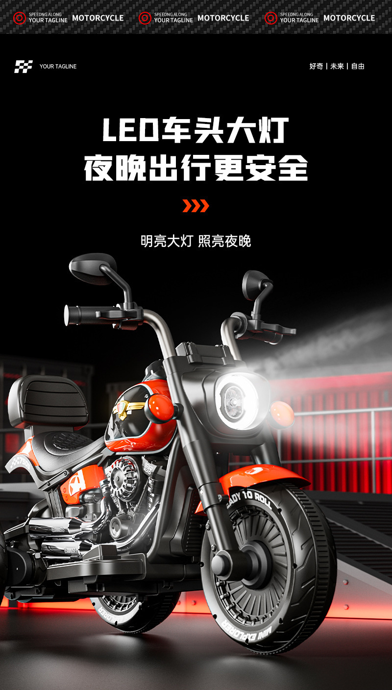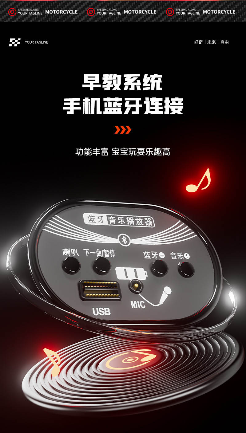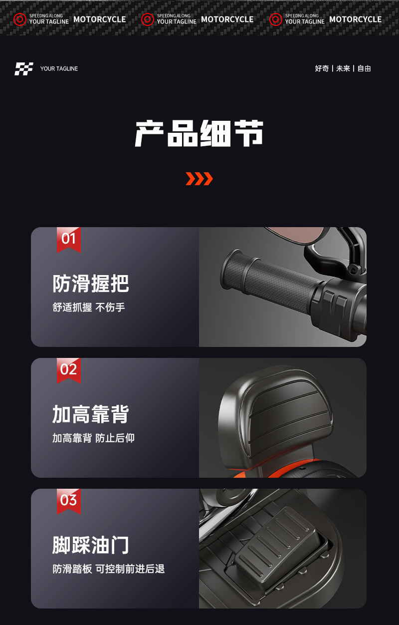 1:仿真车型;2:炫彩灯光;3:蓝牙音乐;4:遥控操作;5:一键启动;6:三轮款