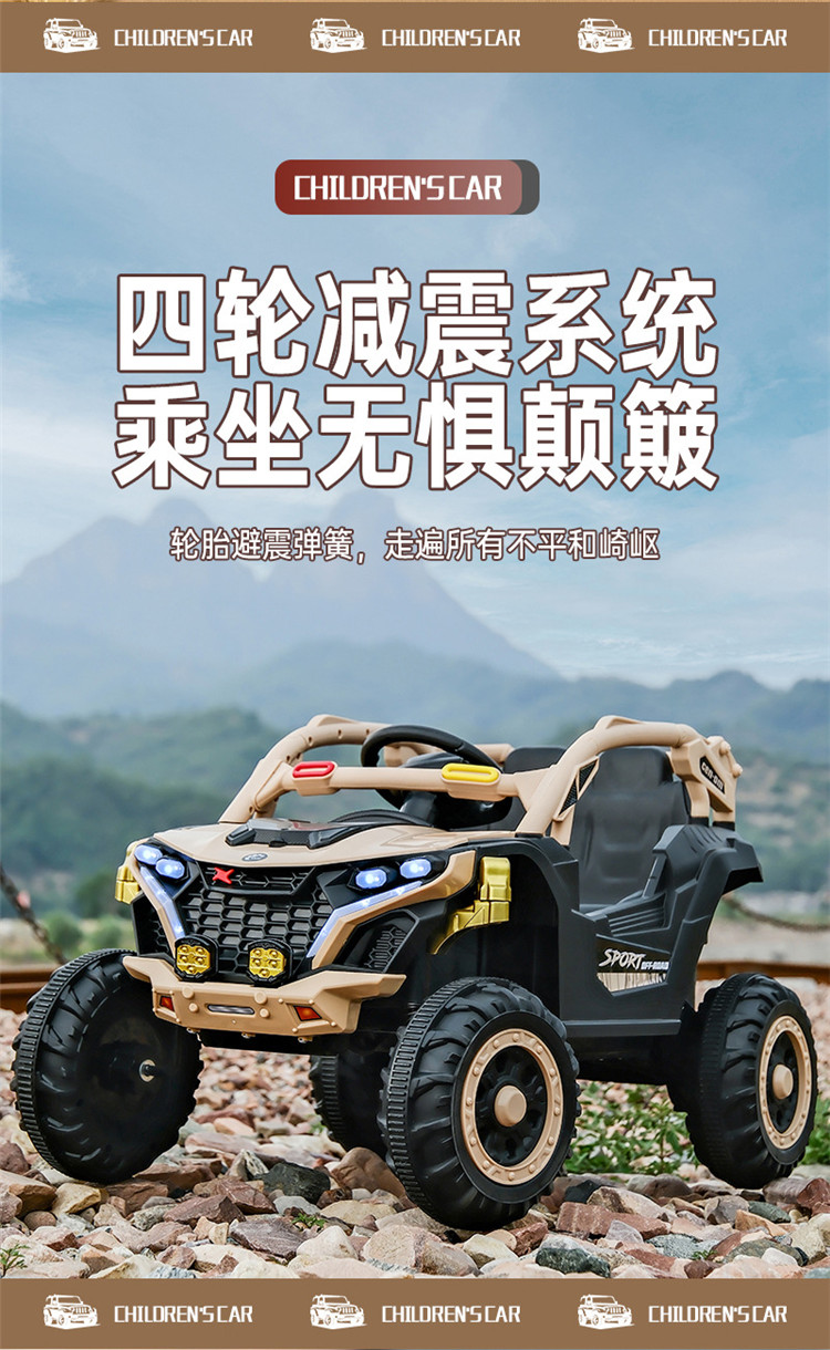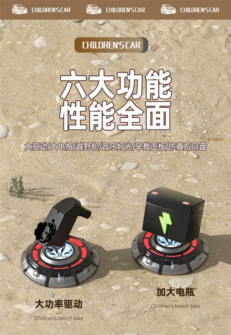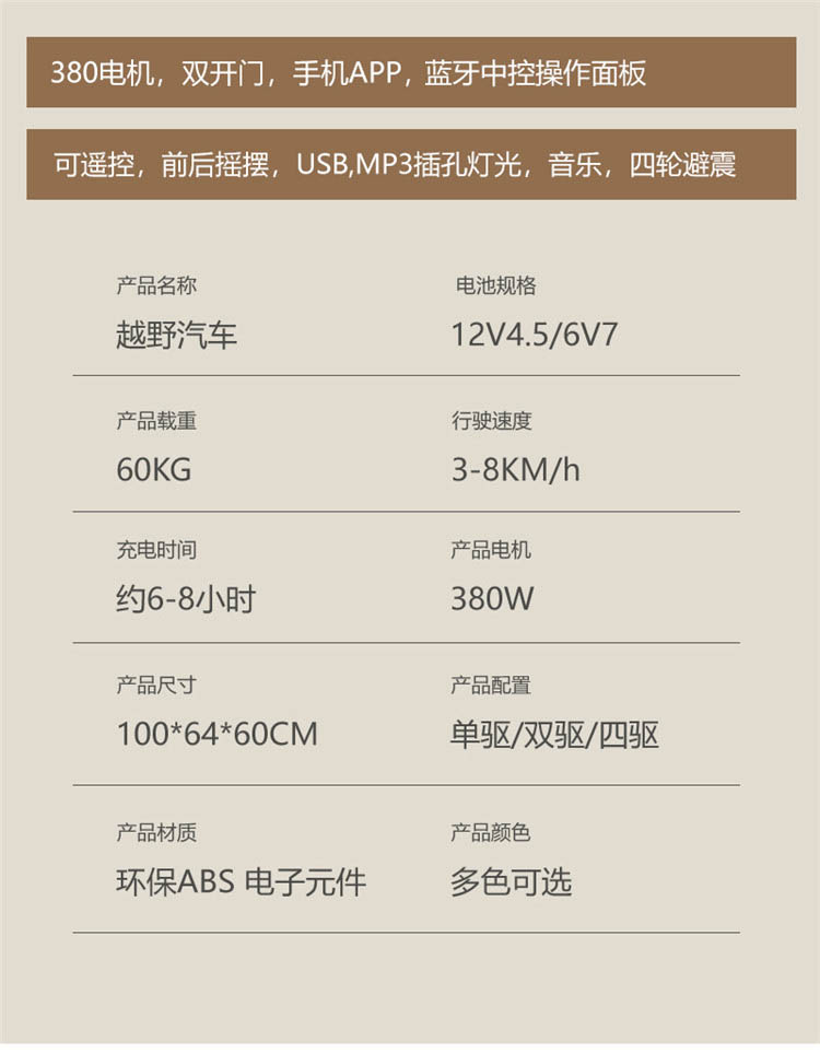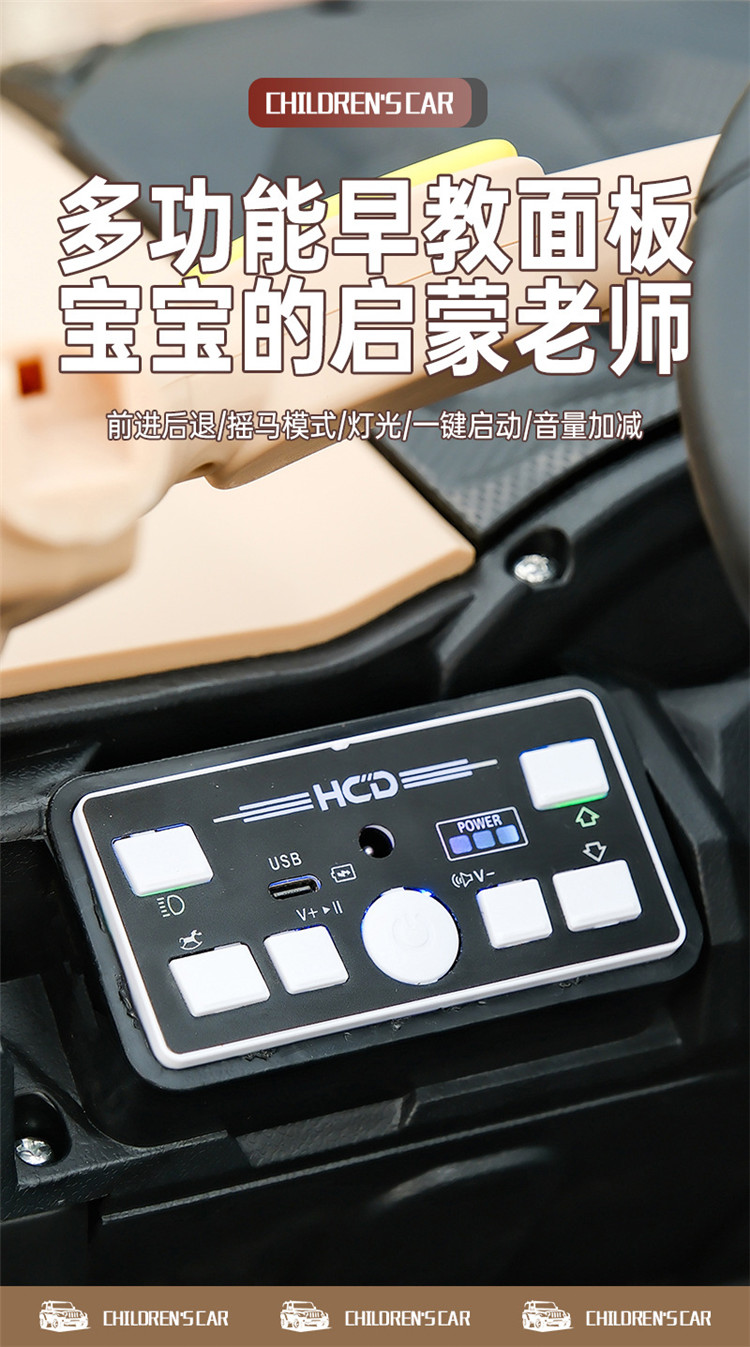 货号:046-TCZD注册会员可查看: 体积.重量等参数,并可自动生成订单合同,自动汇总数据,选配功能!一键启动+多种功能音乐板+音量加减+早教功能+前进后退功能+脚踩油门+缓启动+USB插口+灯光+双开门+电子平衡摇摆+2.4g遥控+手机APP遥控+后备沙铲+单驱+380电机+6v7电瓶