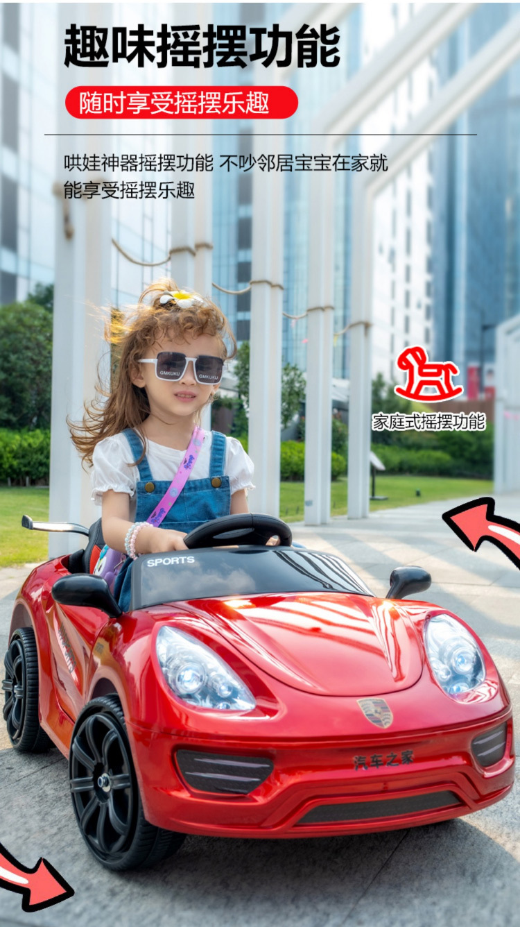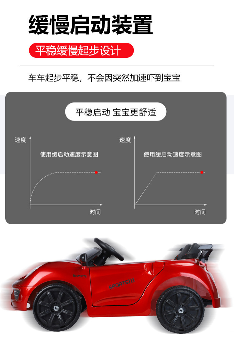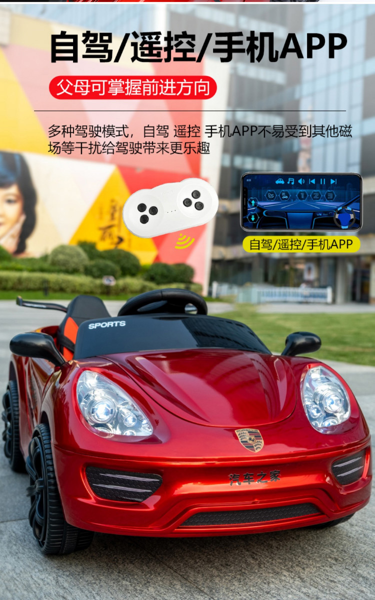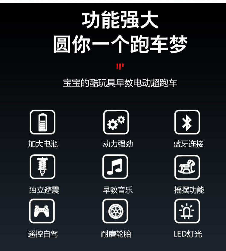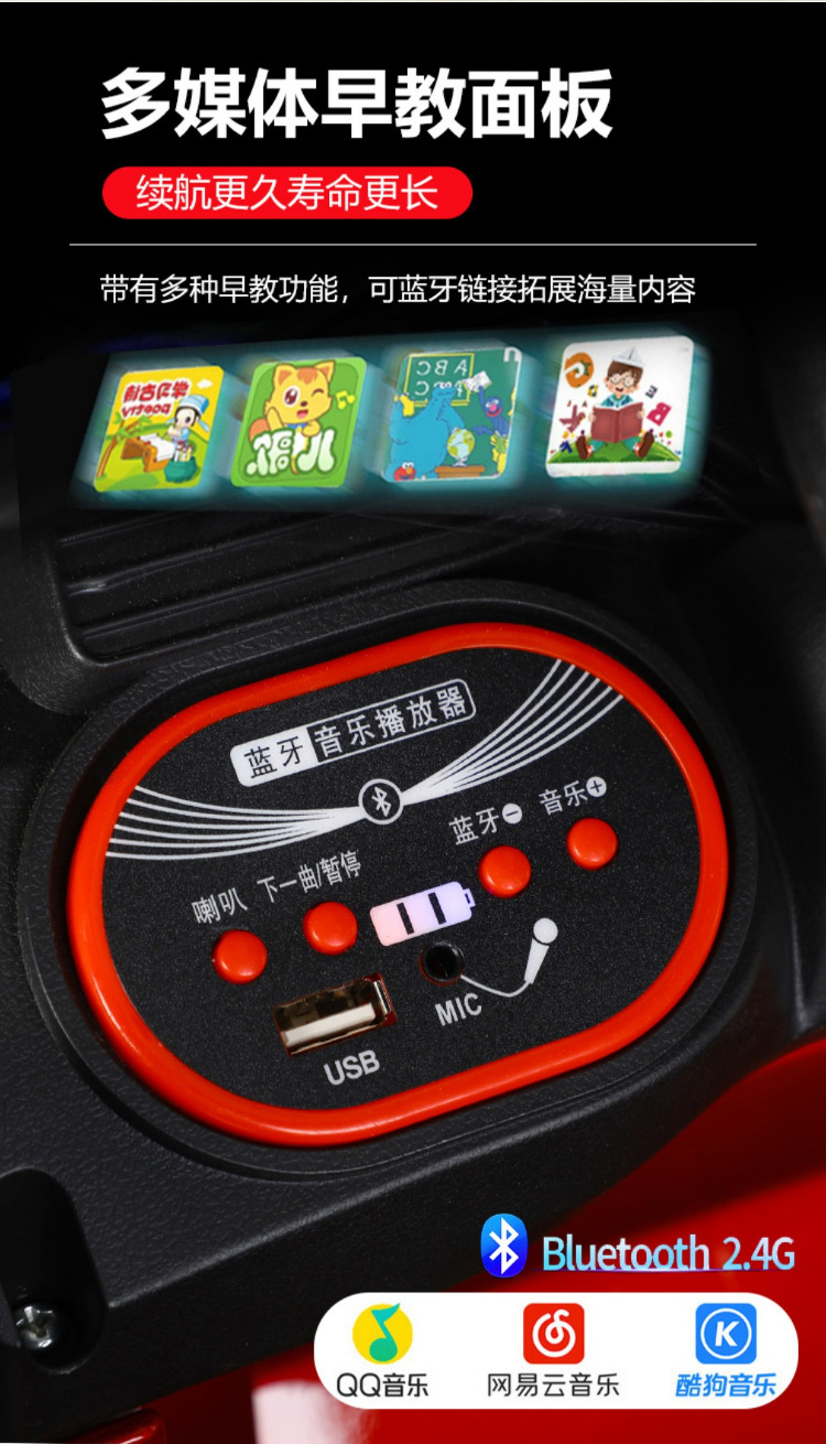 一键启动+多种功能音乐板+音量加减+早教功能+前进后退功能+脚踩油门+缓启动+USB插口+炫彩灯光+双开门+电子平衡摇摆+2.4g遥控+手机APP遥控+单驱+380电机+6v4电瓶