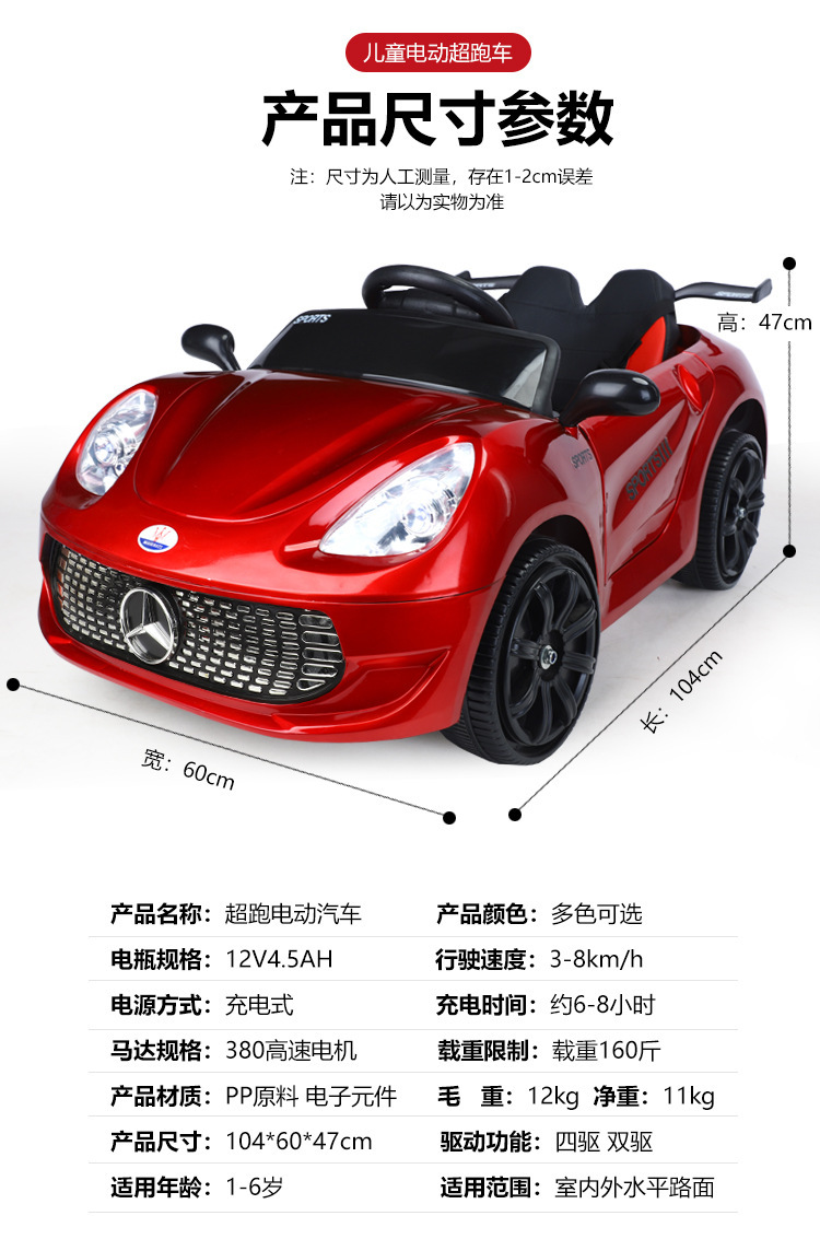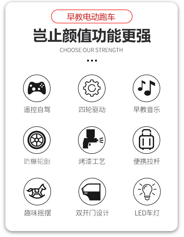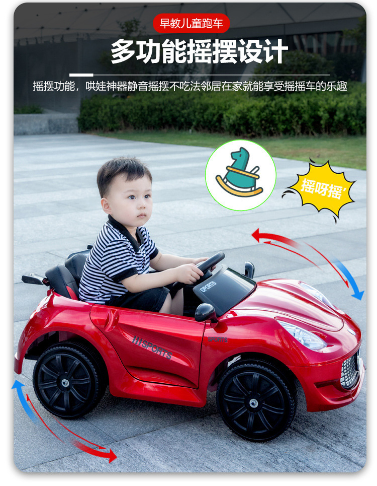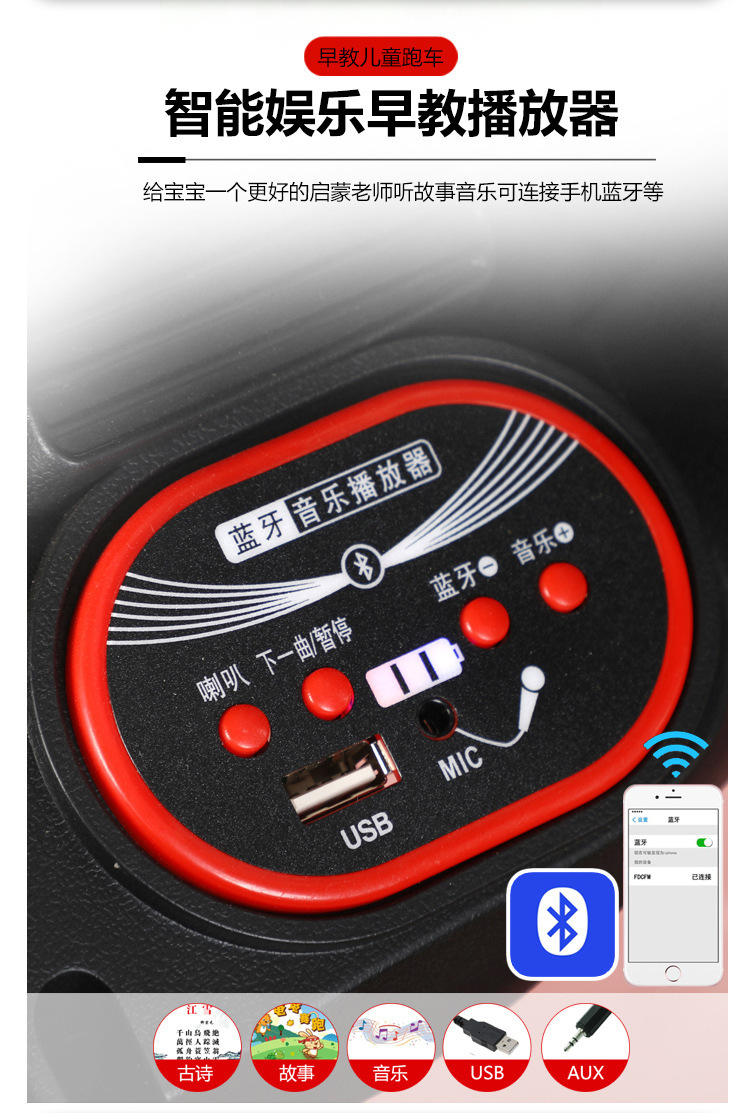 一键启动+多种功能音乐板+音量加减+早教功能+前进后退功能+脚踩油门+缓启动+USB插口+炫彩灯光+双开门+电子平衡摇摆+2.4g遥控+手机APP遥控+单驱+380电机+6v4电瓶