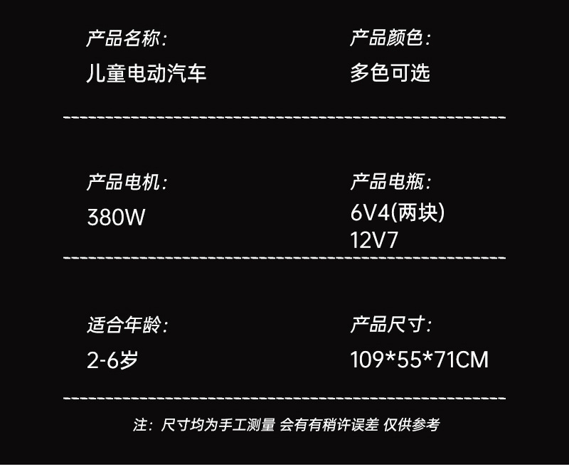 标配 孔雀绿/骑士白/烈焰红6v4电瓶+双电双驱+音乐早教。12V大电