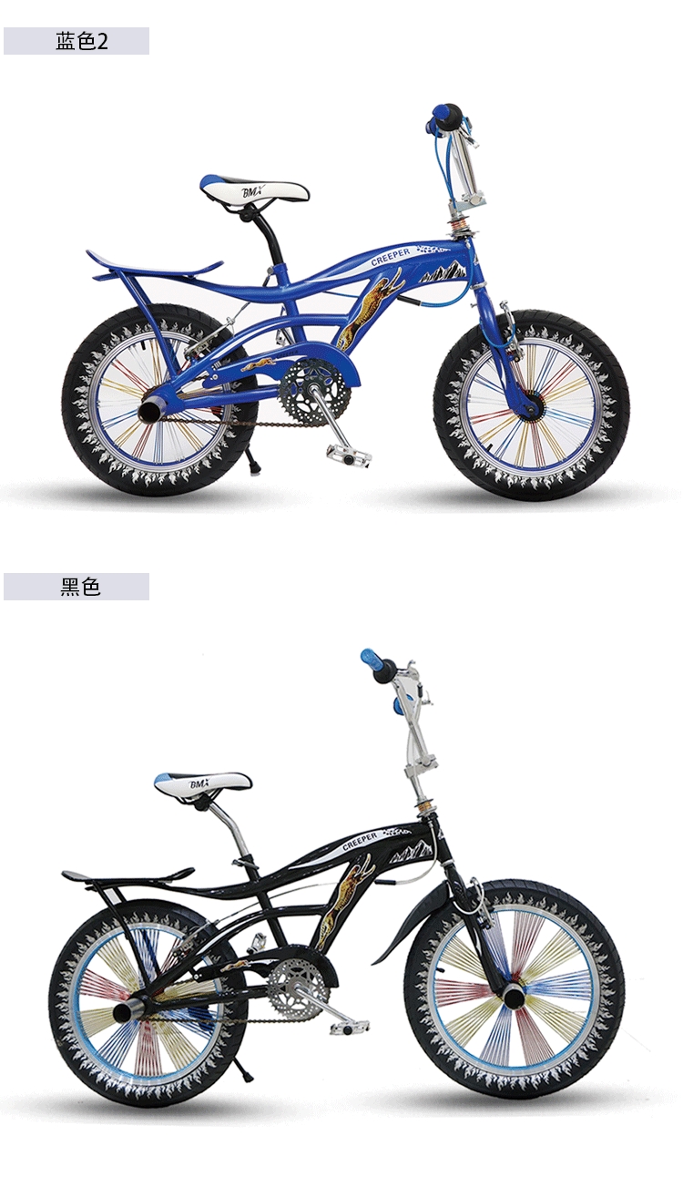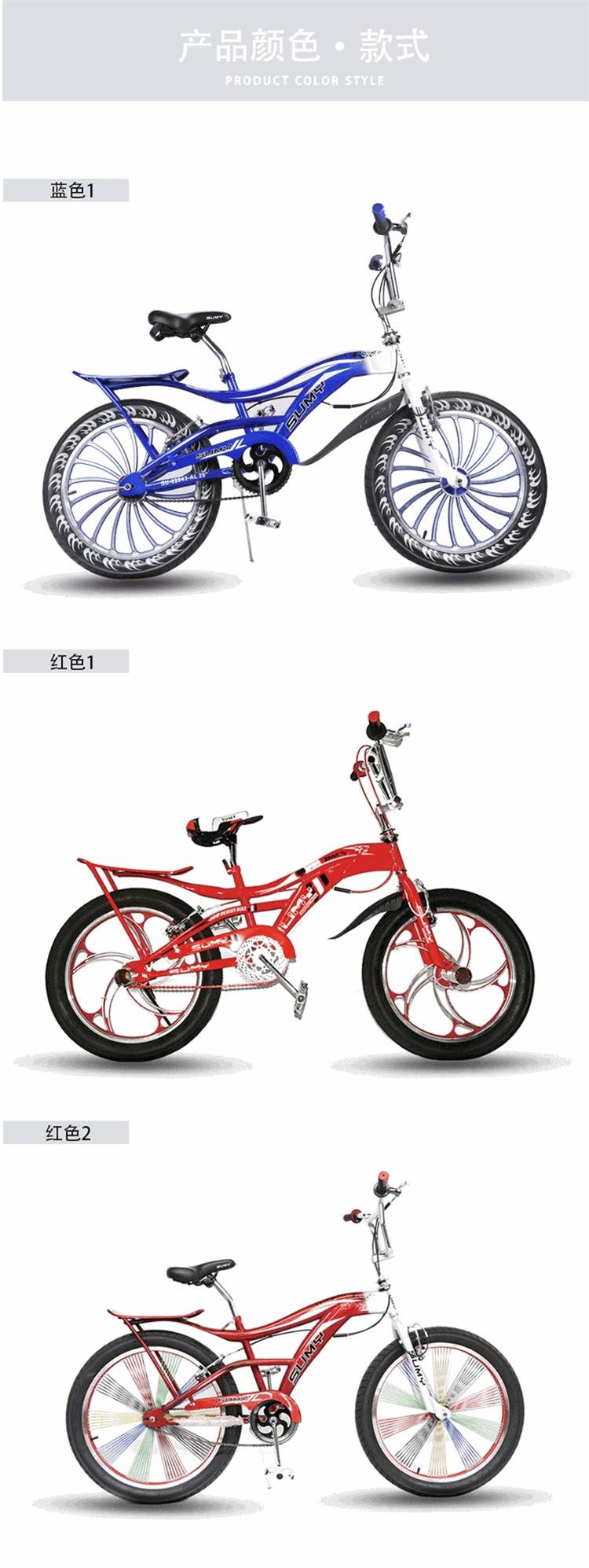 红色,蓝色,黑色。20寸,24寸。表演车分铝轮和辐条轮胎两种