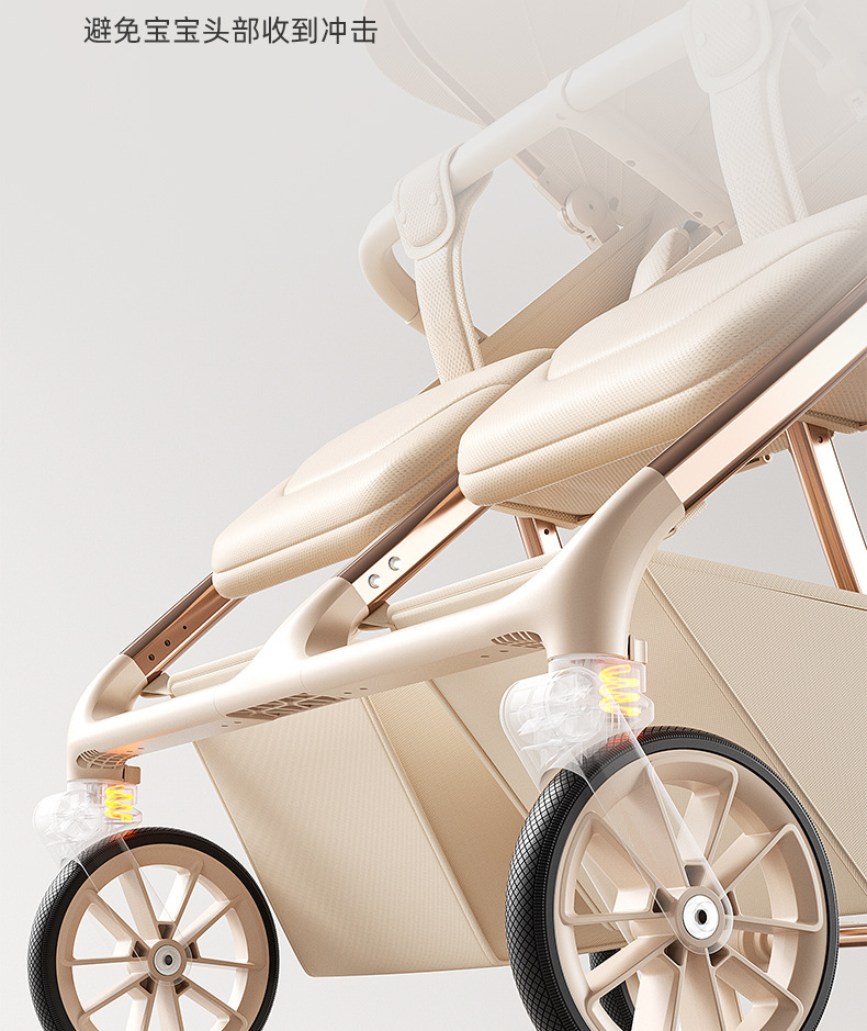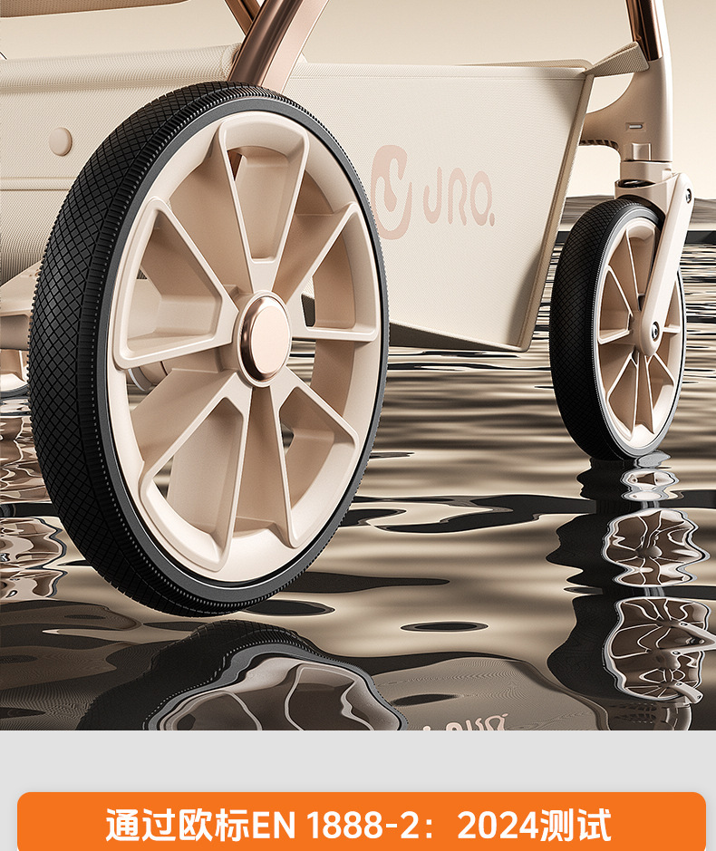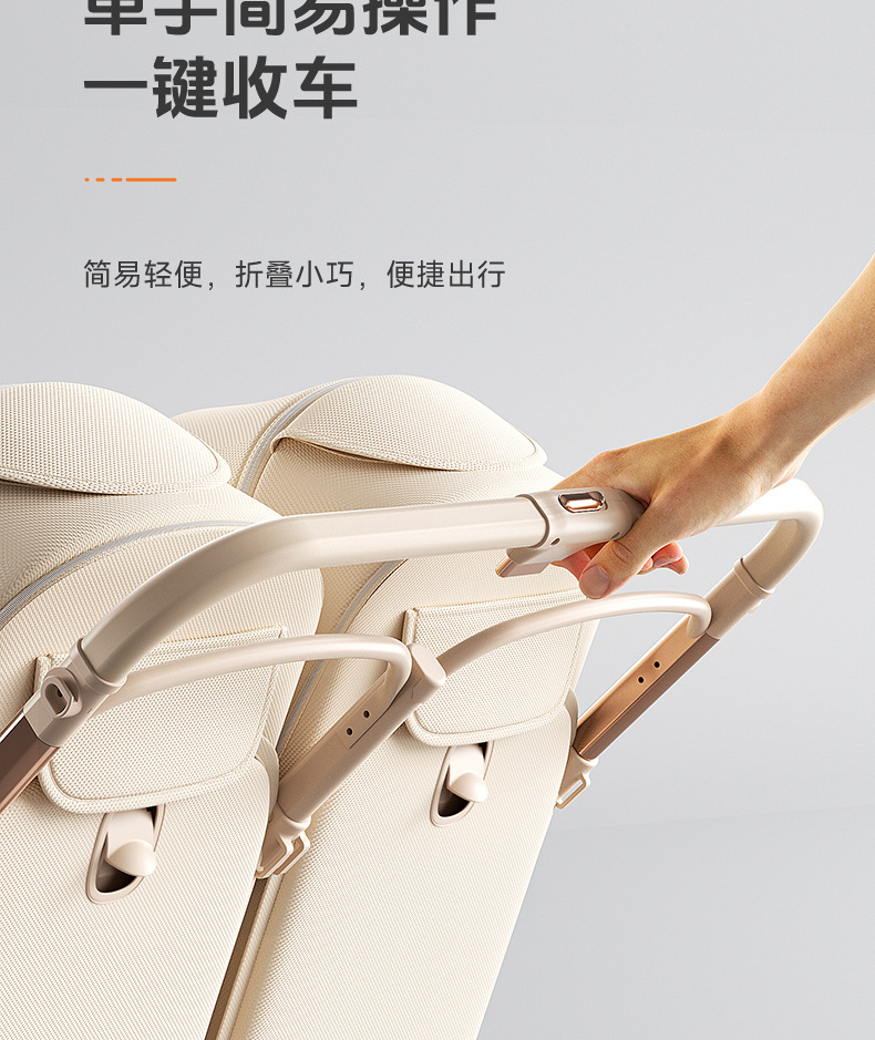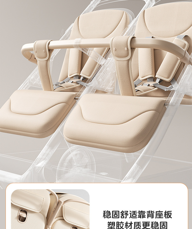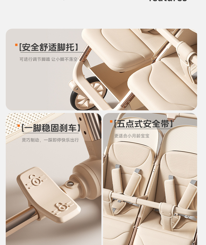 加厚加固的铝合金框架,防侧翻设计,一键式折叠,五点式安全带,加宽座椅,一脚刹车,真皮手柄,拉力绒面料,铝管材料采用氧化工艺,可调靠背,耐磨减震PU轮胎,前轮8寸,后轮10寸