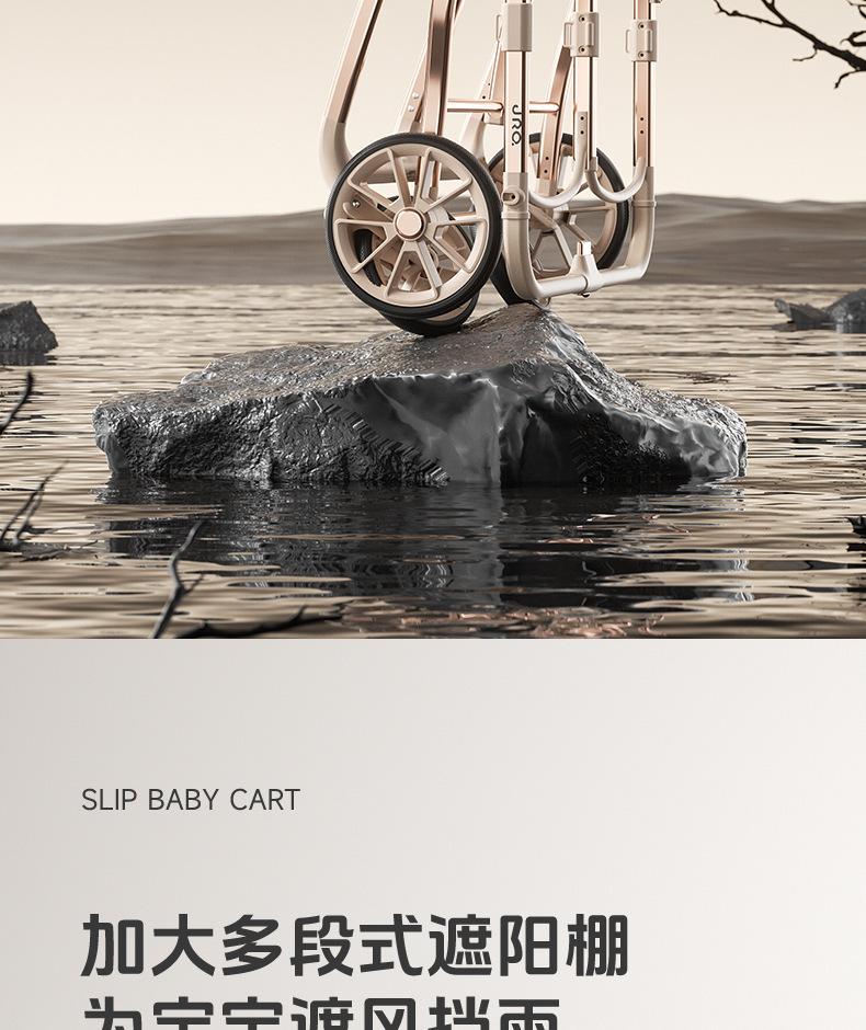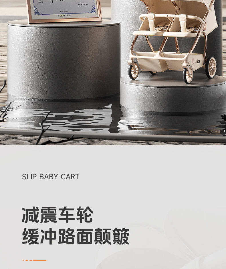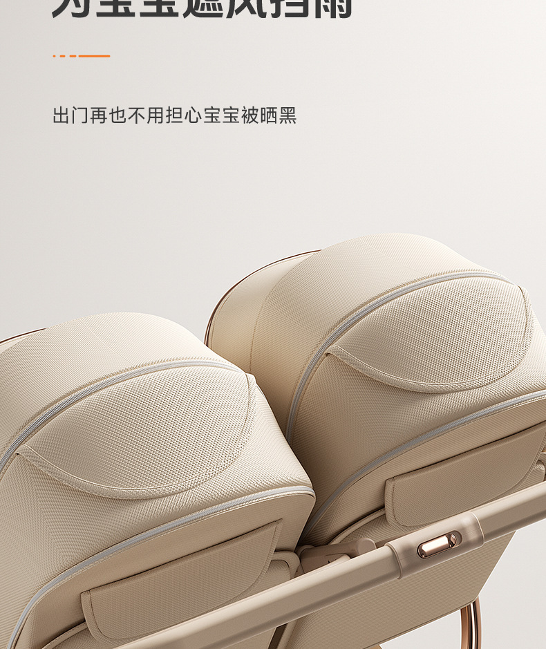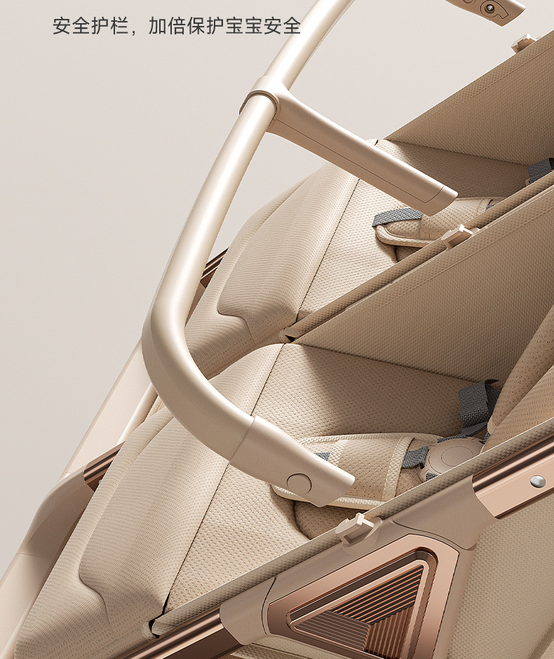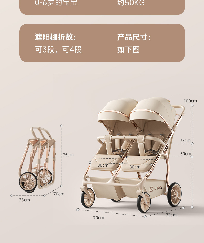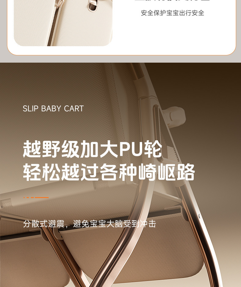 加厚加固的铝合金框架,防侧翻设计,一键式折叠,五点式安全带,加宽座椅,一脚刹车,真皮手柄,拉力绒面料,铝管材料采用氧化工艺,可调靠背,耐磨减震PU轮胎,前轮8寸,后轮10寸