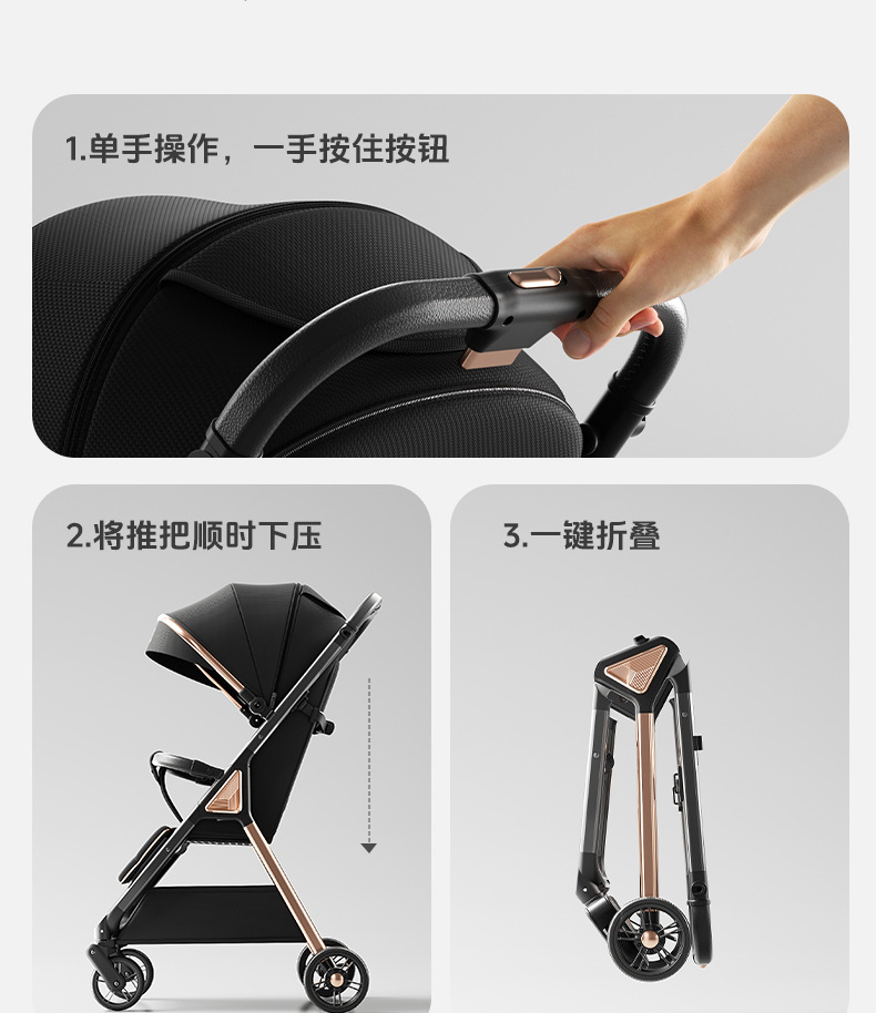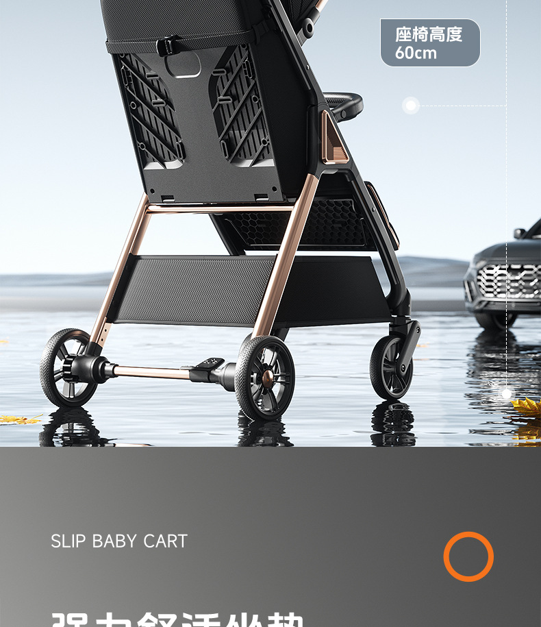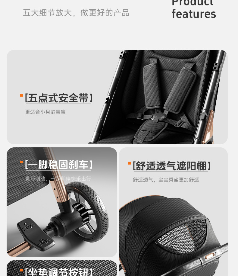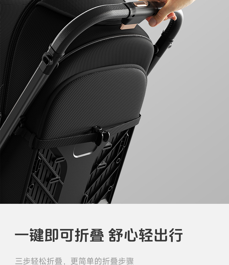 加厚加固的铝合金框架,防侧翻设计,一键式折叠,五点式安全带,加宽座椅,一脚刹车,真皮手柄,拉力绒面料,铝管材料采用氧化工艺,可调靠背,耐磨EVA发泡轮胎,前轮6寸,后轮8寸