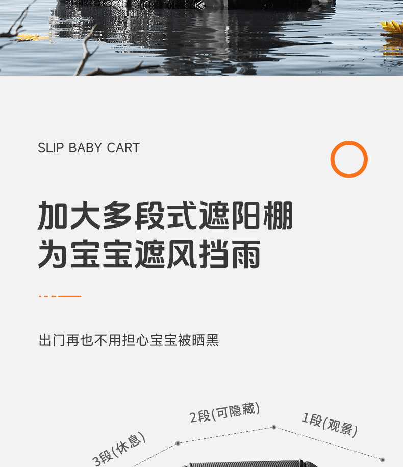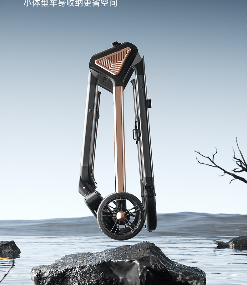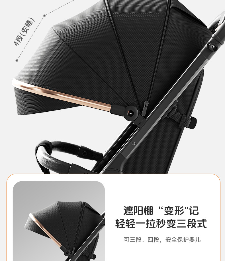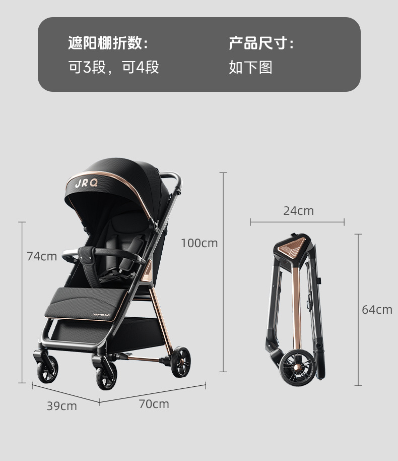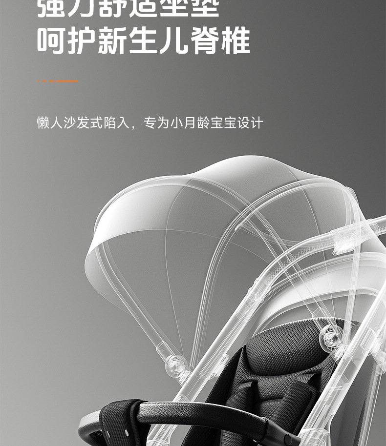 加厚加固的铝合金框架,防侧翻设计,一键式折叠,五点式安全带,加宽座椅,一脚刹车,真皮手柄,拉力绒面料,铝管材料采用氧化工艺,可调靠背,耐磨EVA发泡轮胎,前轮6寸,后轮8寸