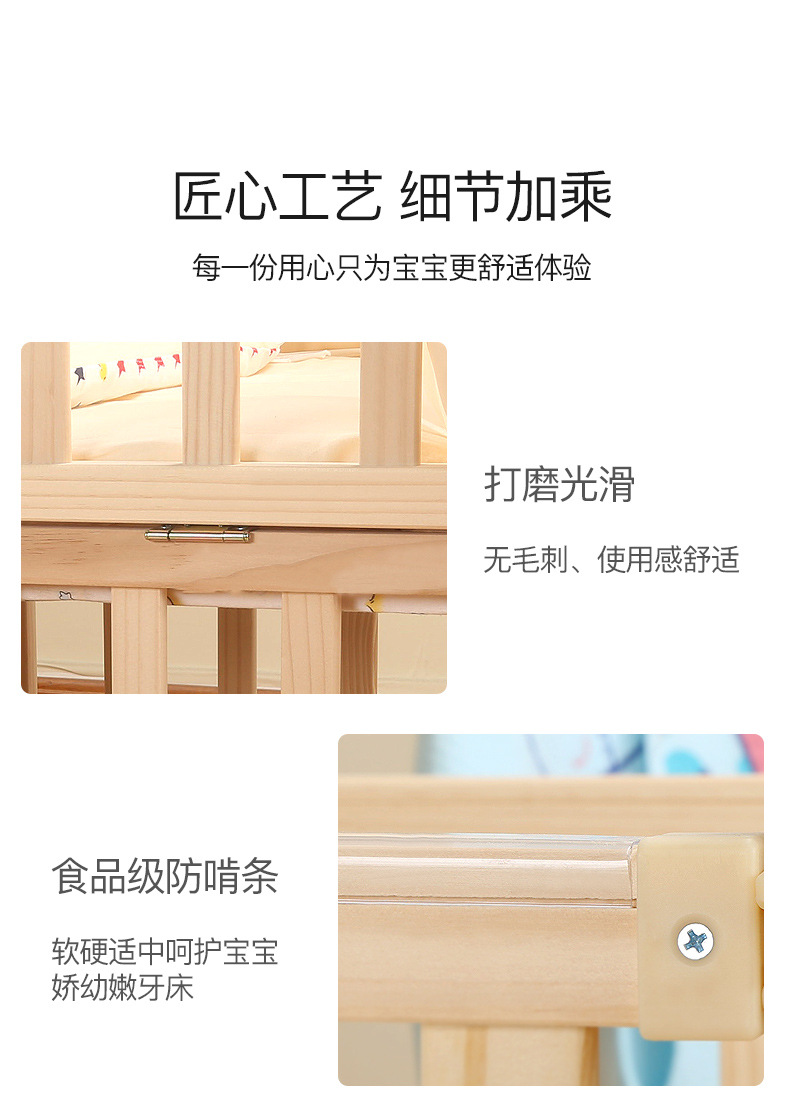 侧面护栏高61cm,栅栏间隙5cm,护栏木条加宽加厚;全实木,严格按照标准生产;
