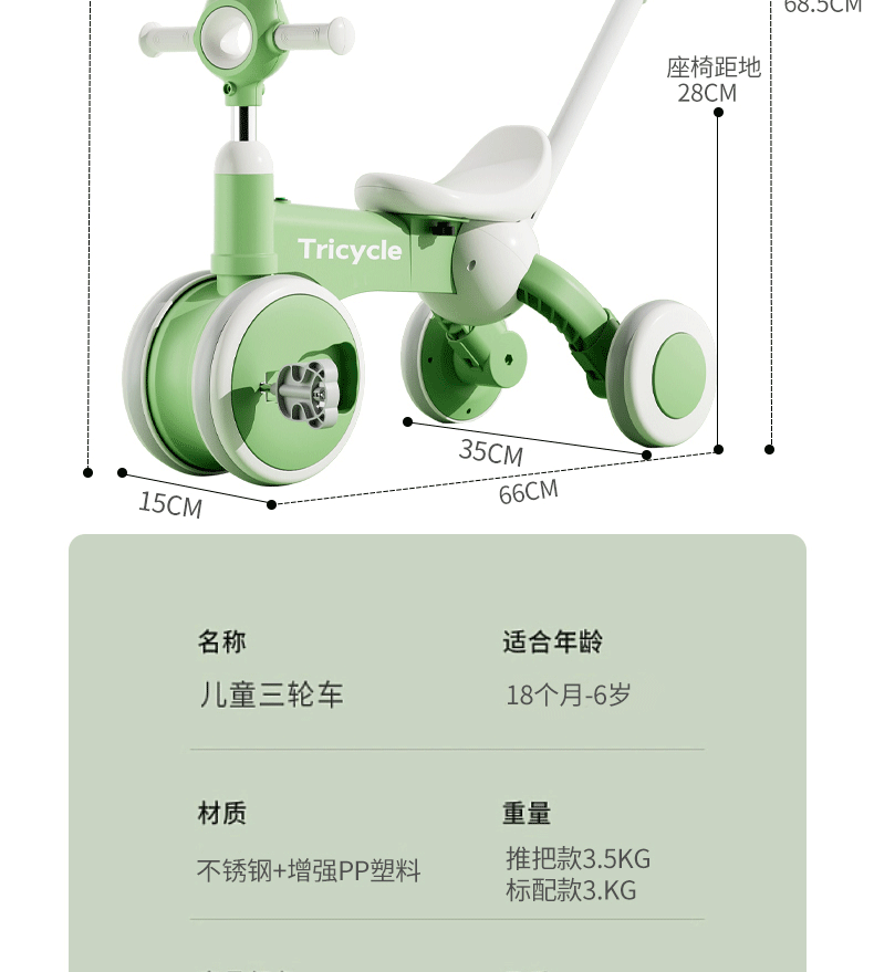 儿童三轮车脚踏车小孩手推一岁骑单车幼儿宝宝脚蹬自行车轻便 ¥93.00