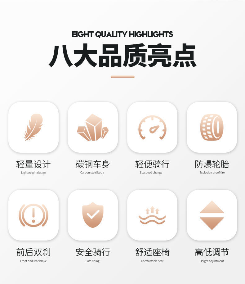 材质:高碳钢车架结构:整体车推进模式:链条载重量:120kg制动系统:V刹/碟刹共用车架类型:无尾车架前叉类型:无避震硬叉配置等级:标准型脚踏类型:普通脚踏刹车类型:前后机械式碟刹