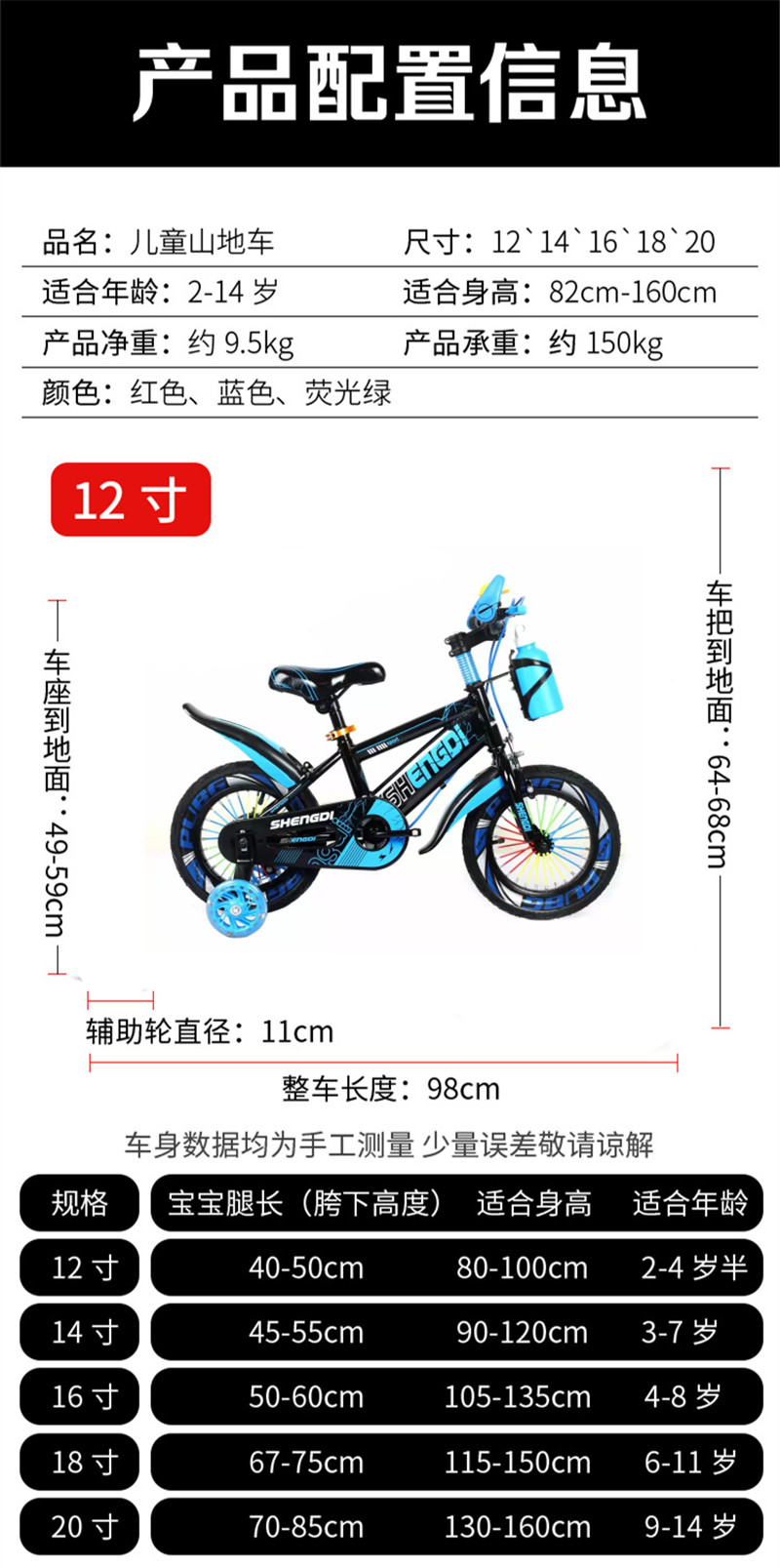 红色/蓝色/黄色。12寸,14寸,16寸,18寸,20寸