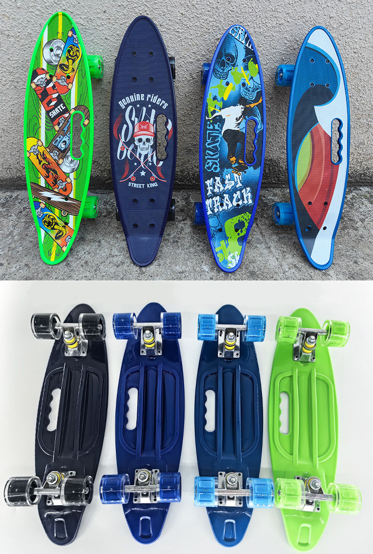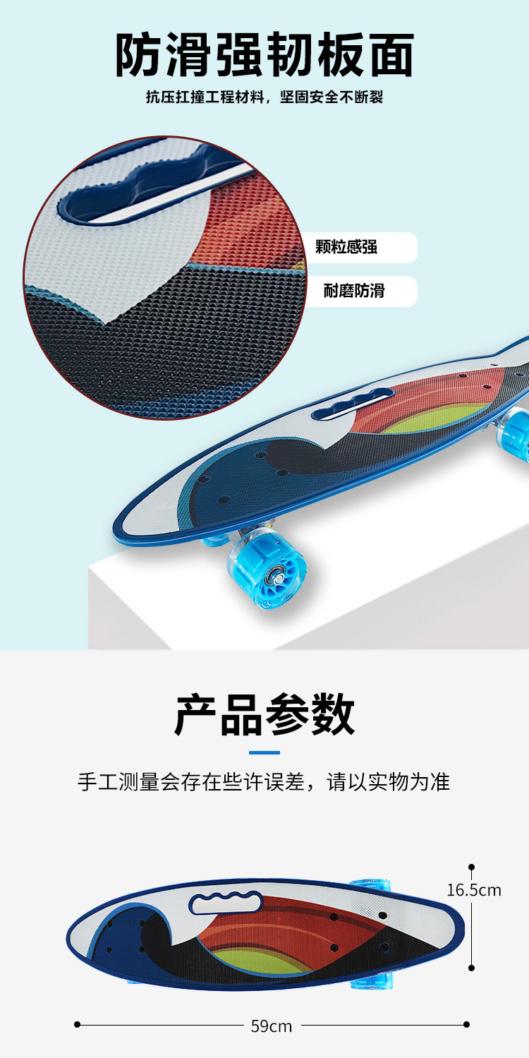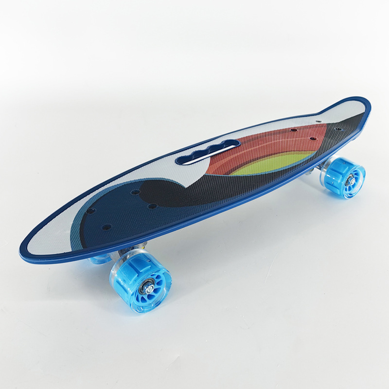 产品类别:滑板材质:PP适用人群:通用板面分类:单翘板尺寸:23.5英寸颜色:图案随机规格:闪光轮