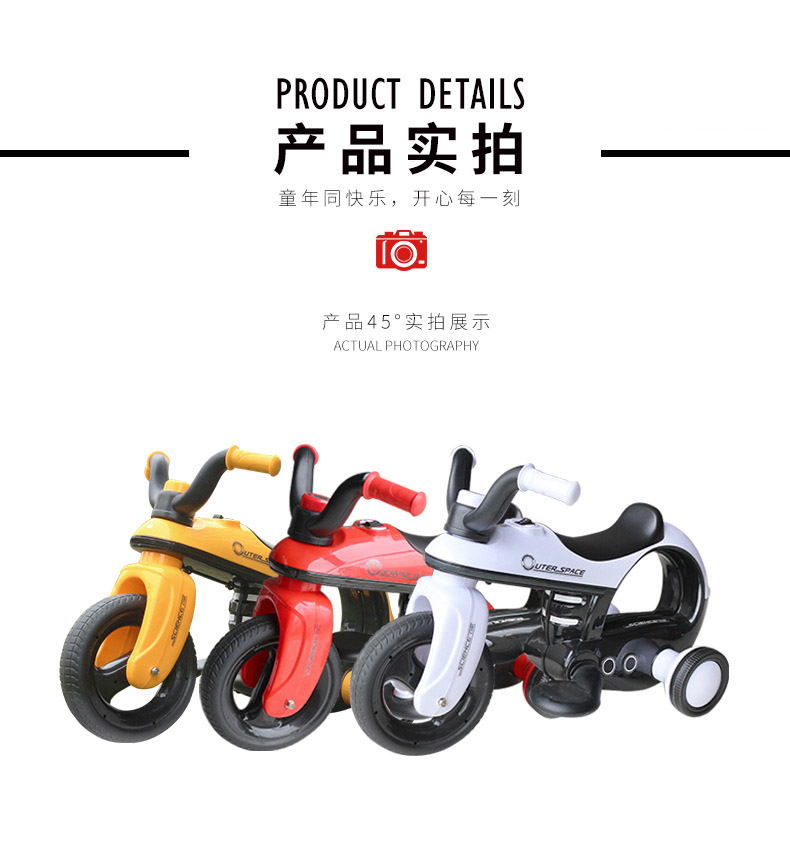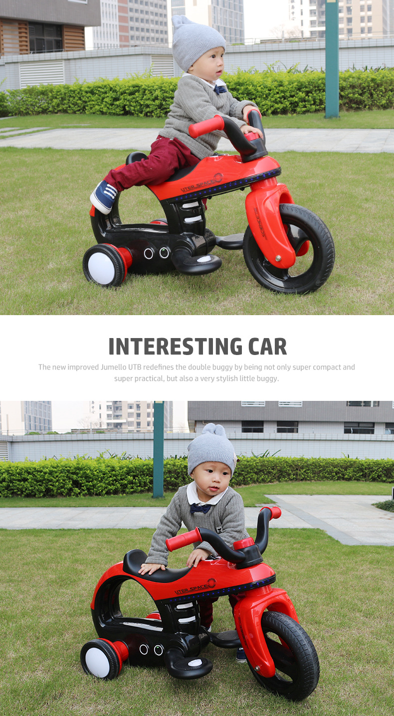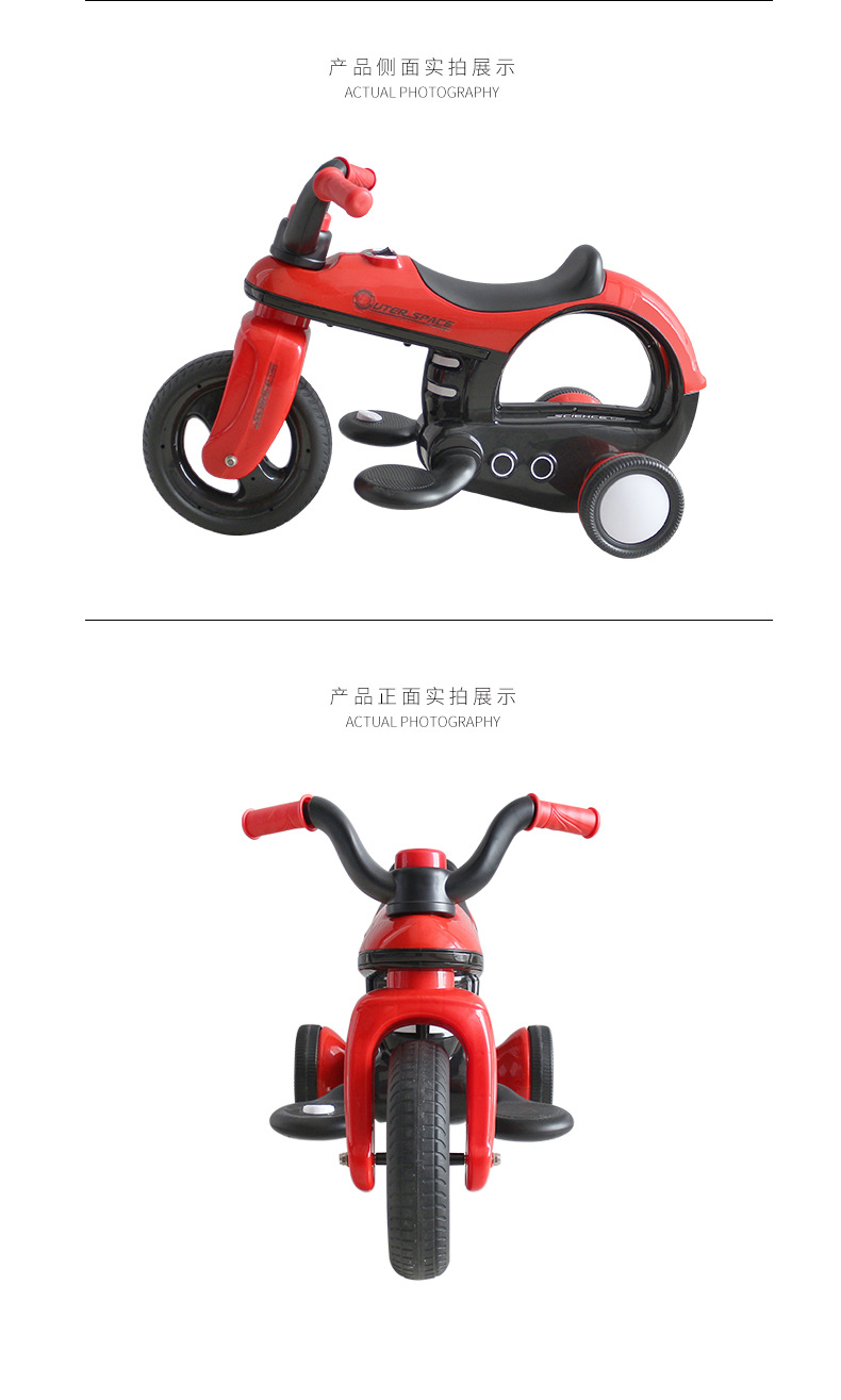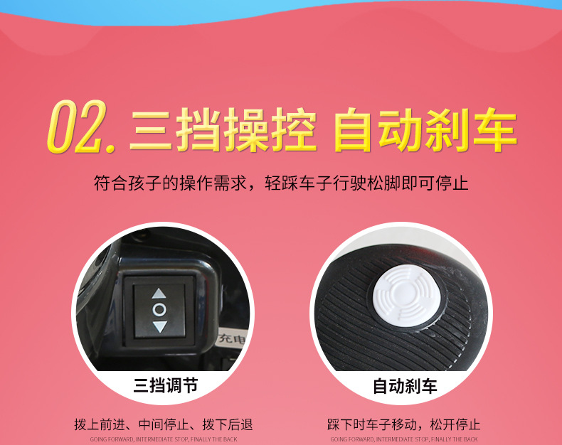 * 功能:脚踏启动 / 前进后退 / 音乐播放 / 喇叭及闪光灯 / 音量调节
