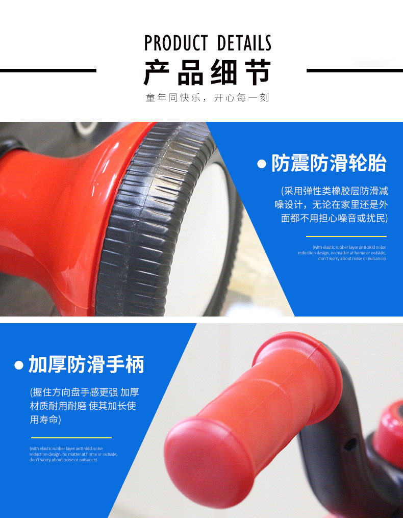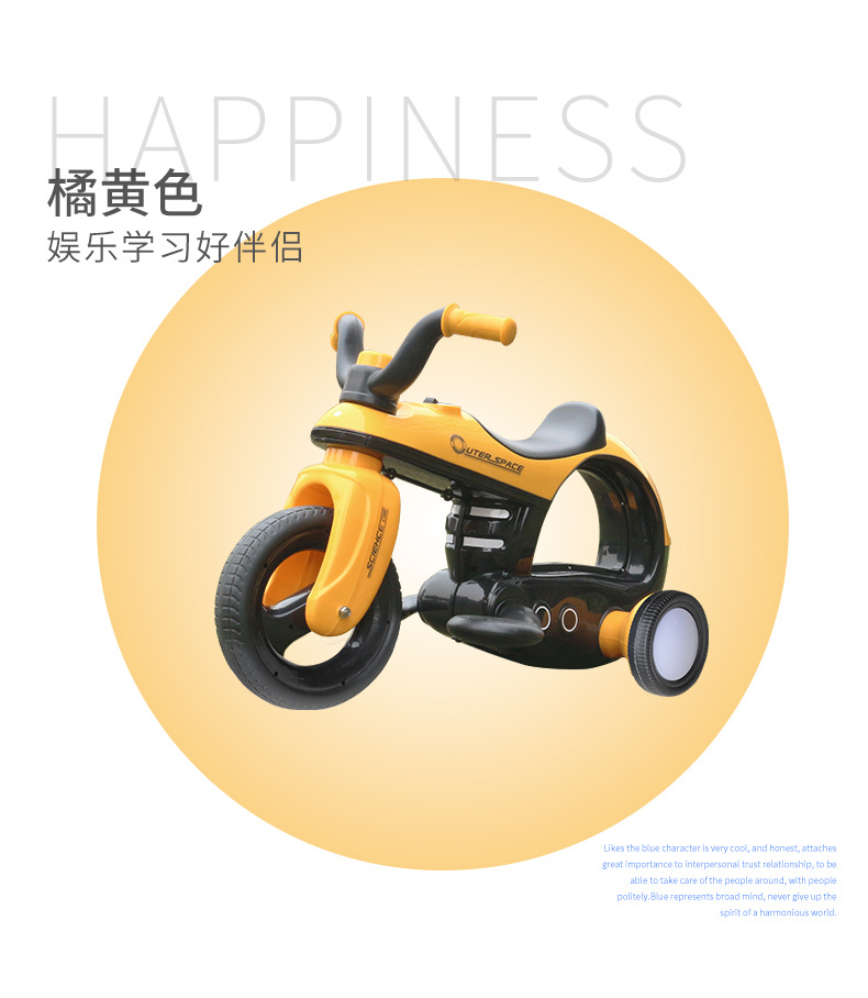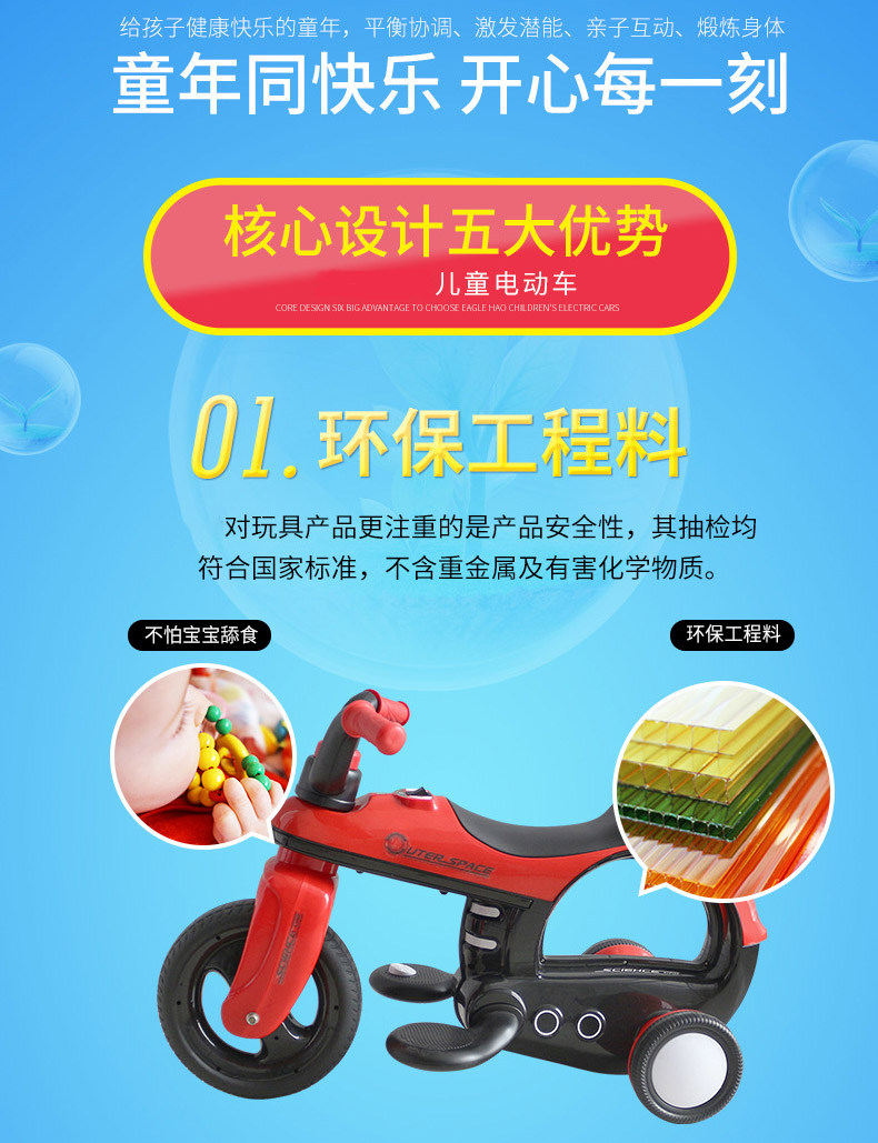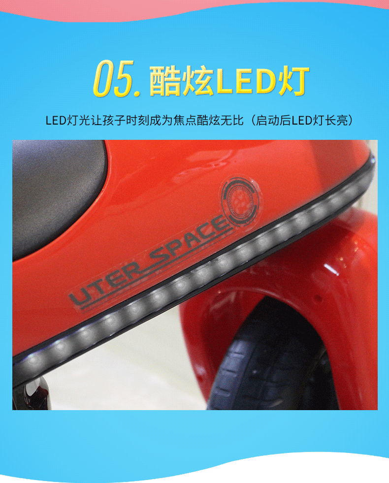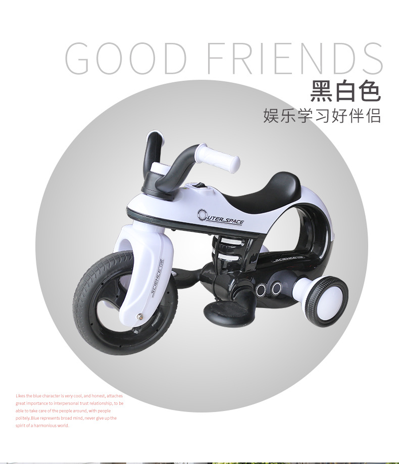 * 功能:脚踏启动 / 前进后退 / 音乐播放 / 喇叭及闪光灯 / 音量调节