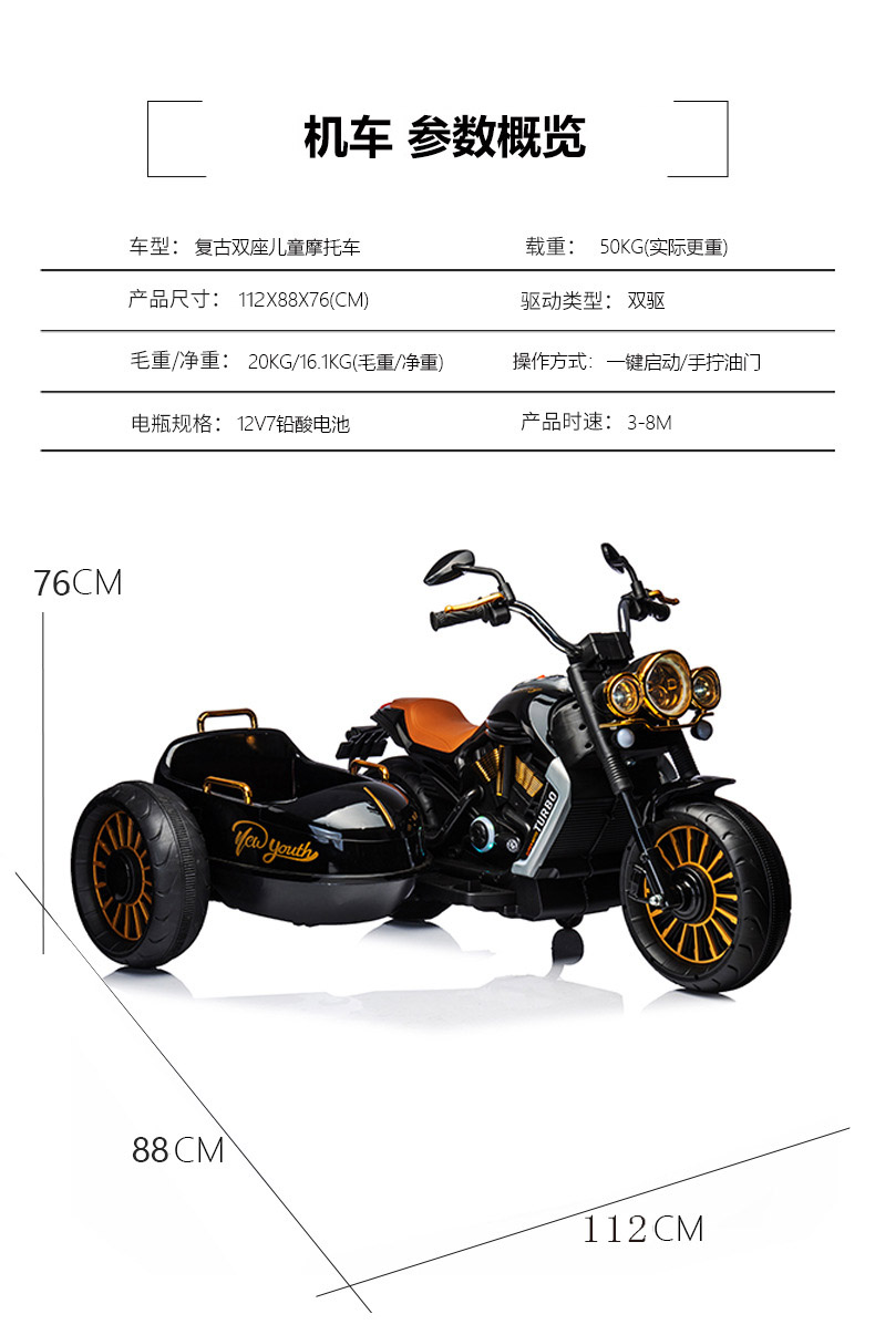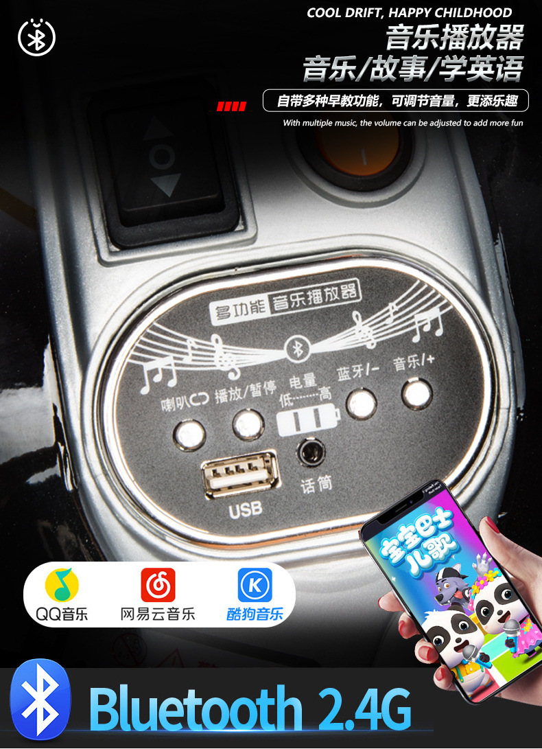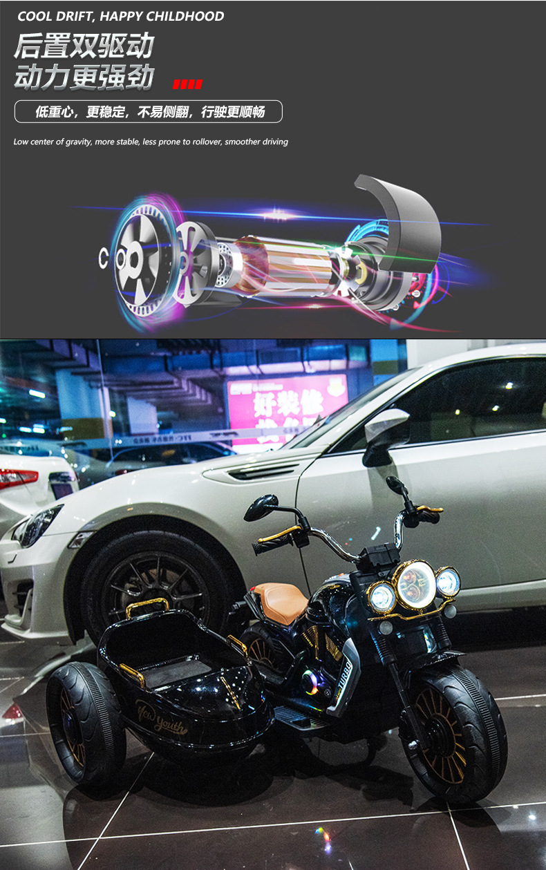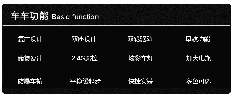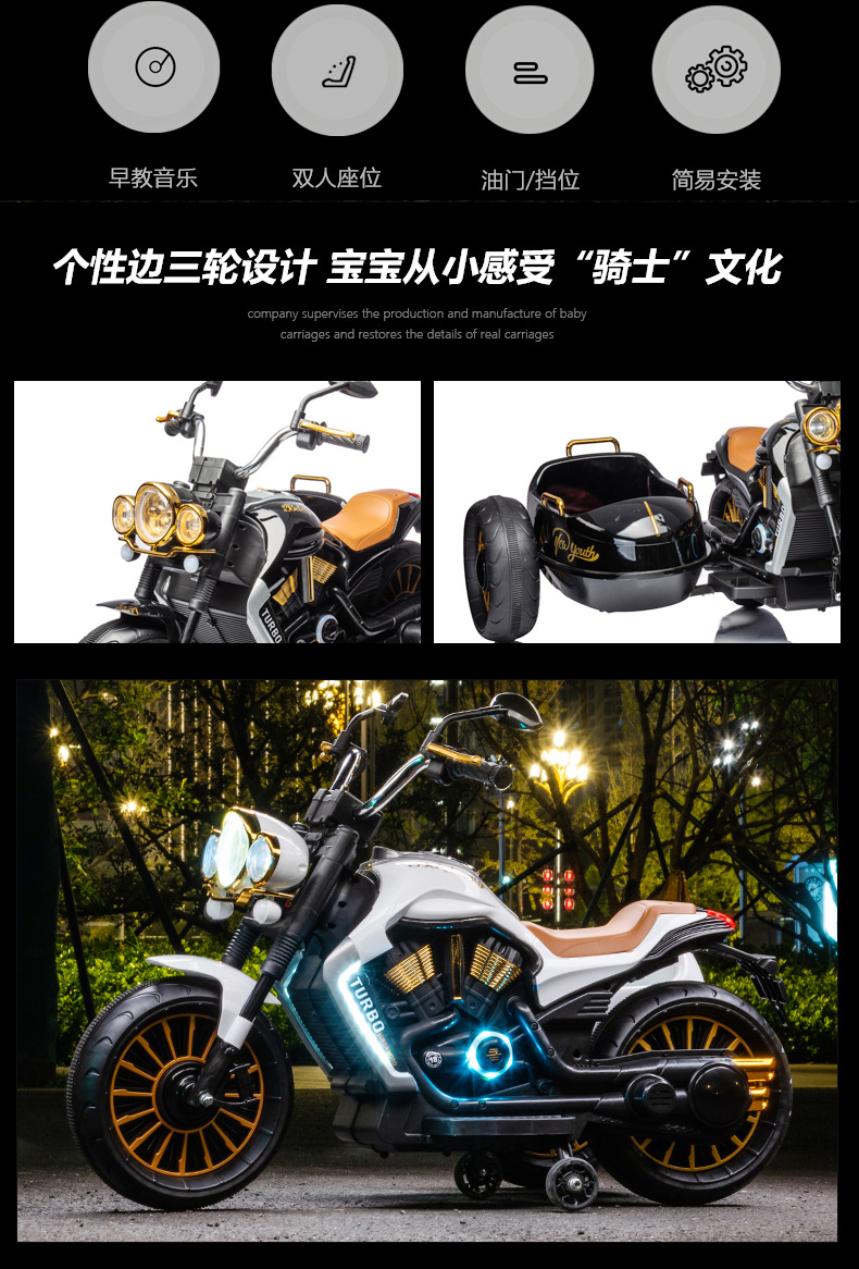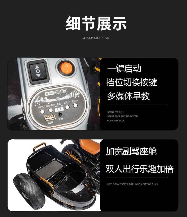货号:09-TCZD 注册会员可查看: 体积.重量等参数,并可自动生成订单合同,自动汇总数据,选配功能! 电瓶12V7AH,马达#550,灯光,音乐,一键启动,MP3播放器(MP3/USB插口/蓝牙/音量调节/早教/故事),电量显示,脚踩油门,带侧座位,皮座
