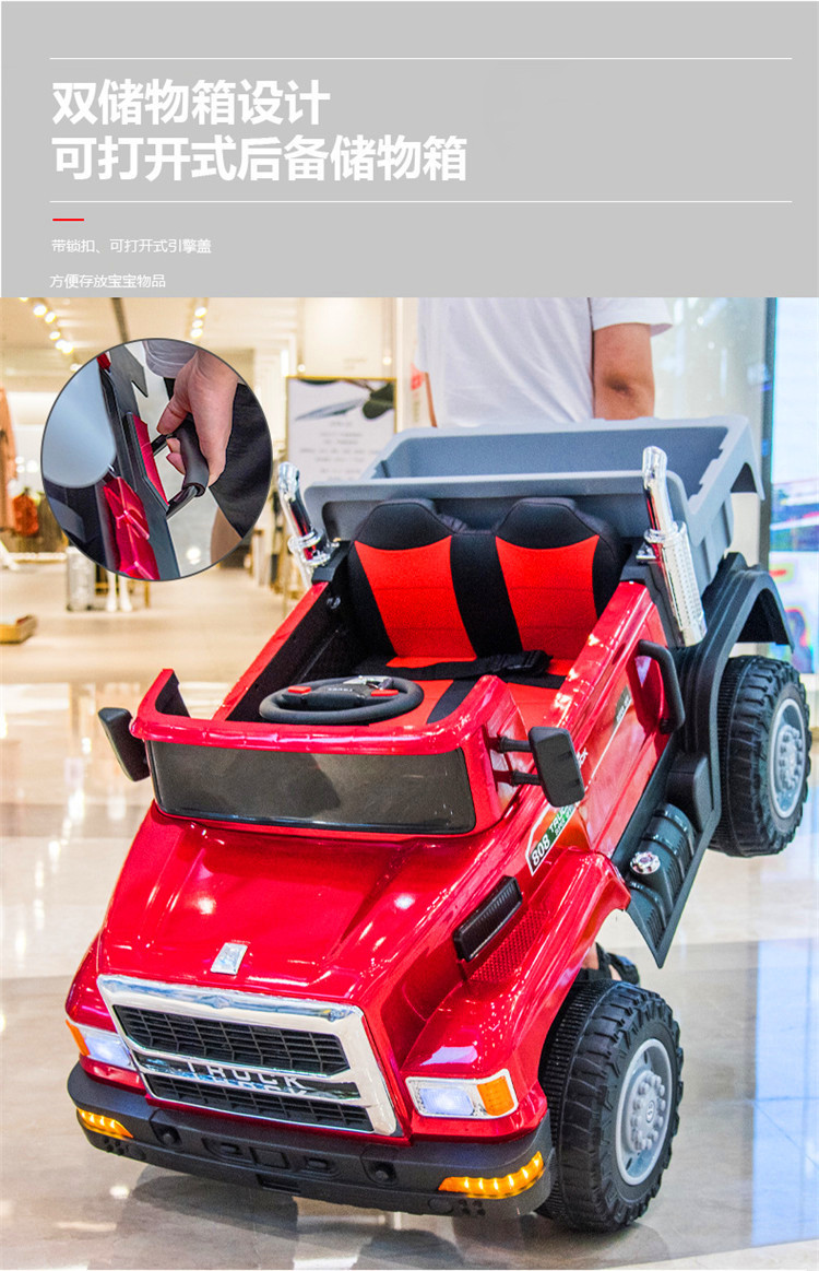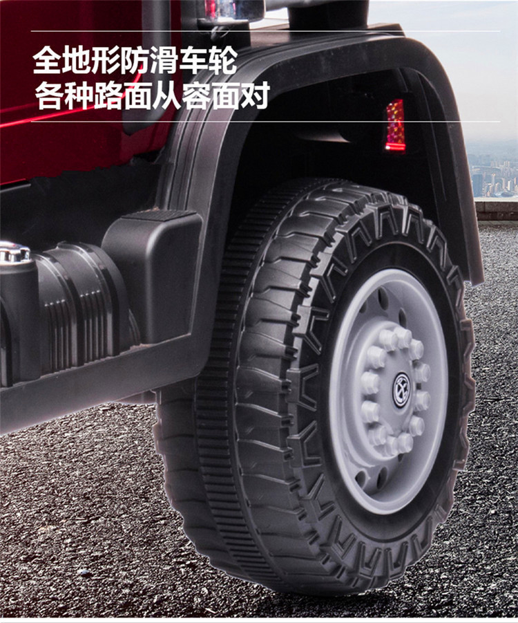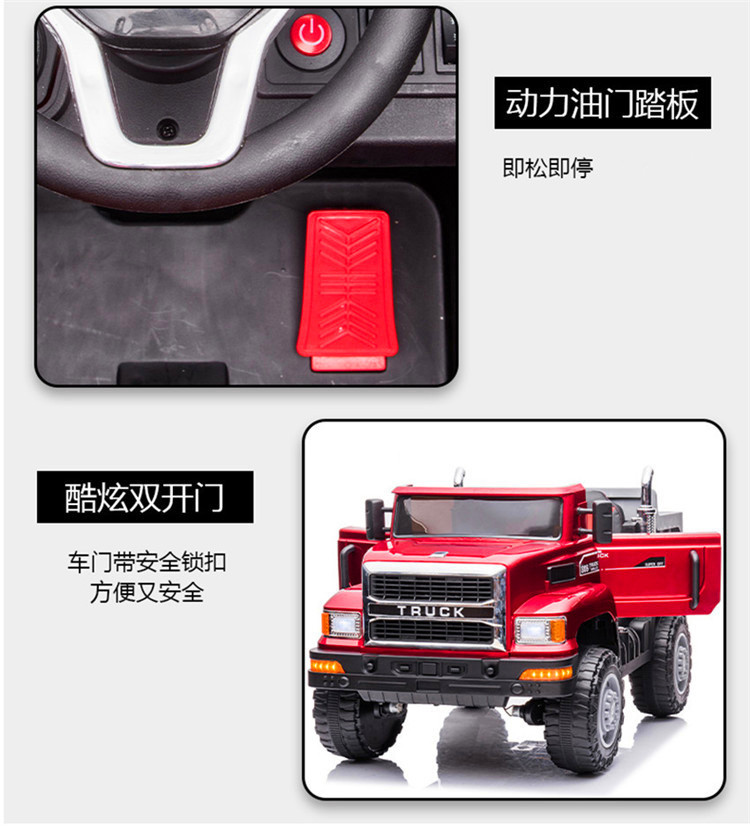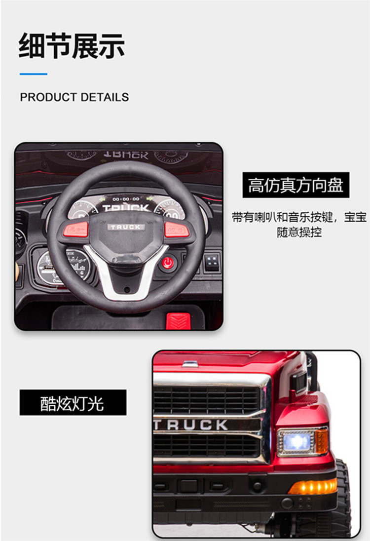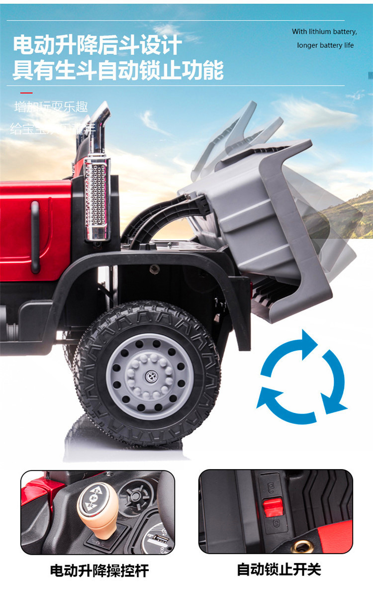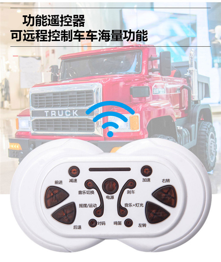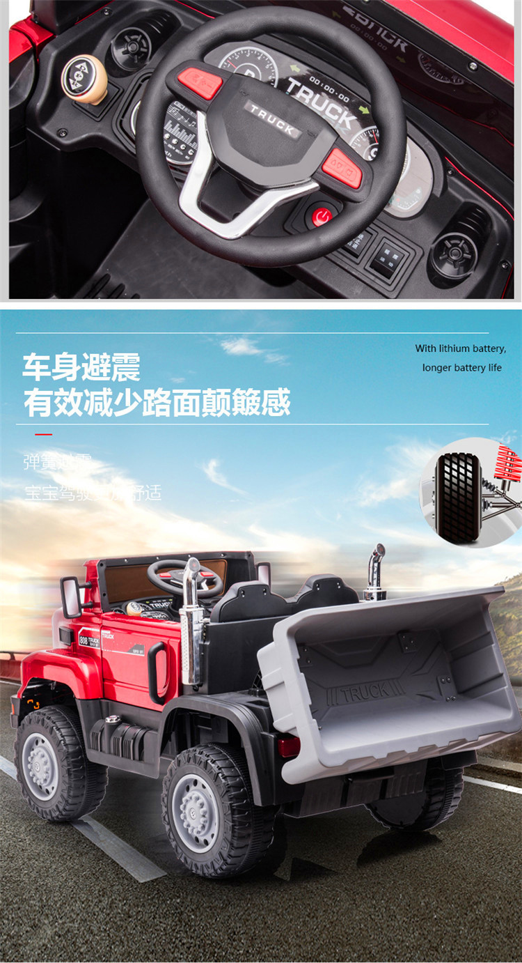 四驱带减震,多种功能能遥控器,可控制调速,缓起缓停,加速减速,音乐切换,揺摆运动,音乐灯光,电源,鸣笛,刹车系统等功能),一键启动,电量显示,电动翻斗手柄操控,带安全锁,仿真前大灯,早教功能,英语故事,LED大灯,USB插口,MP3 插口。
