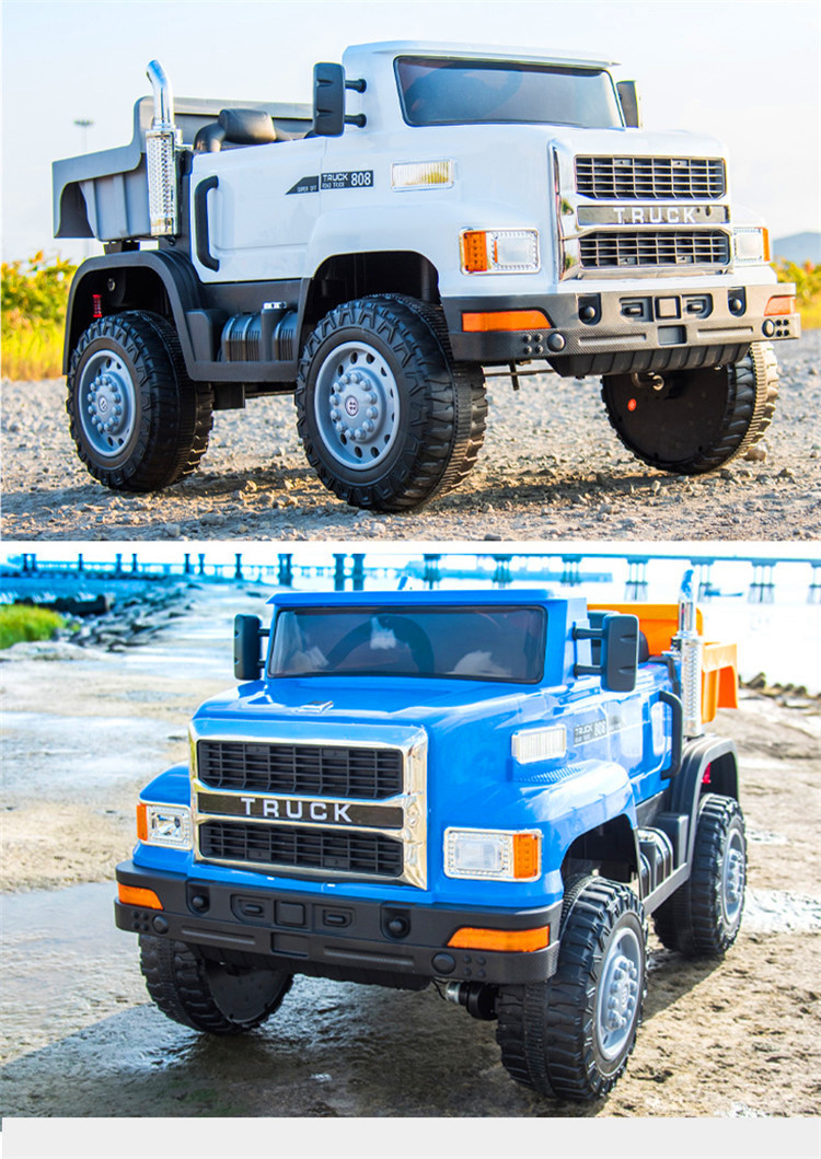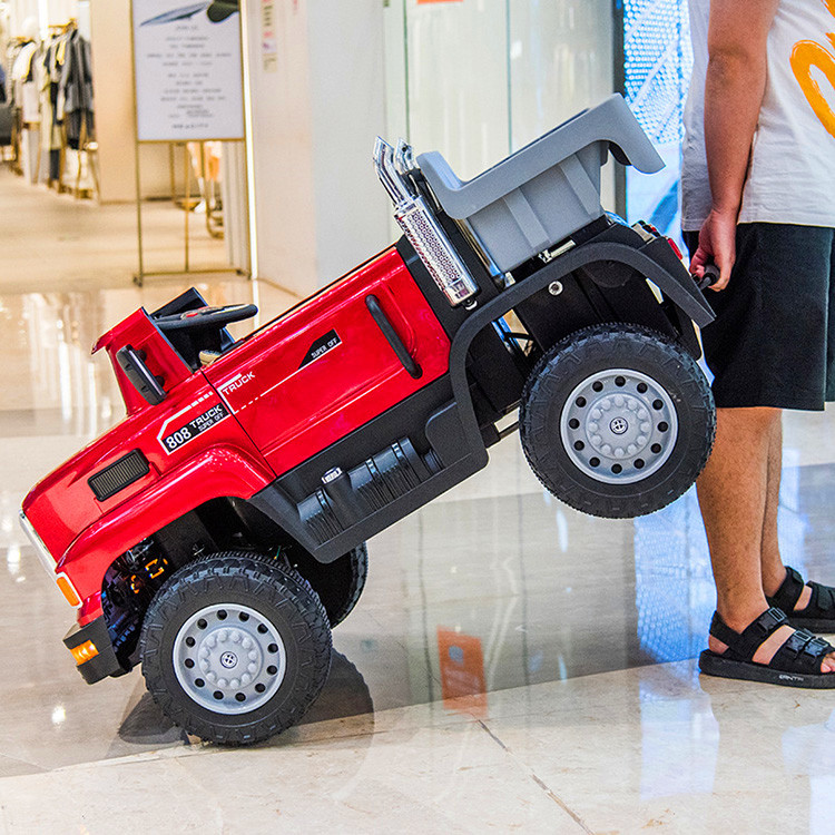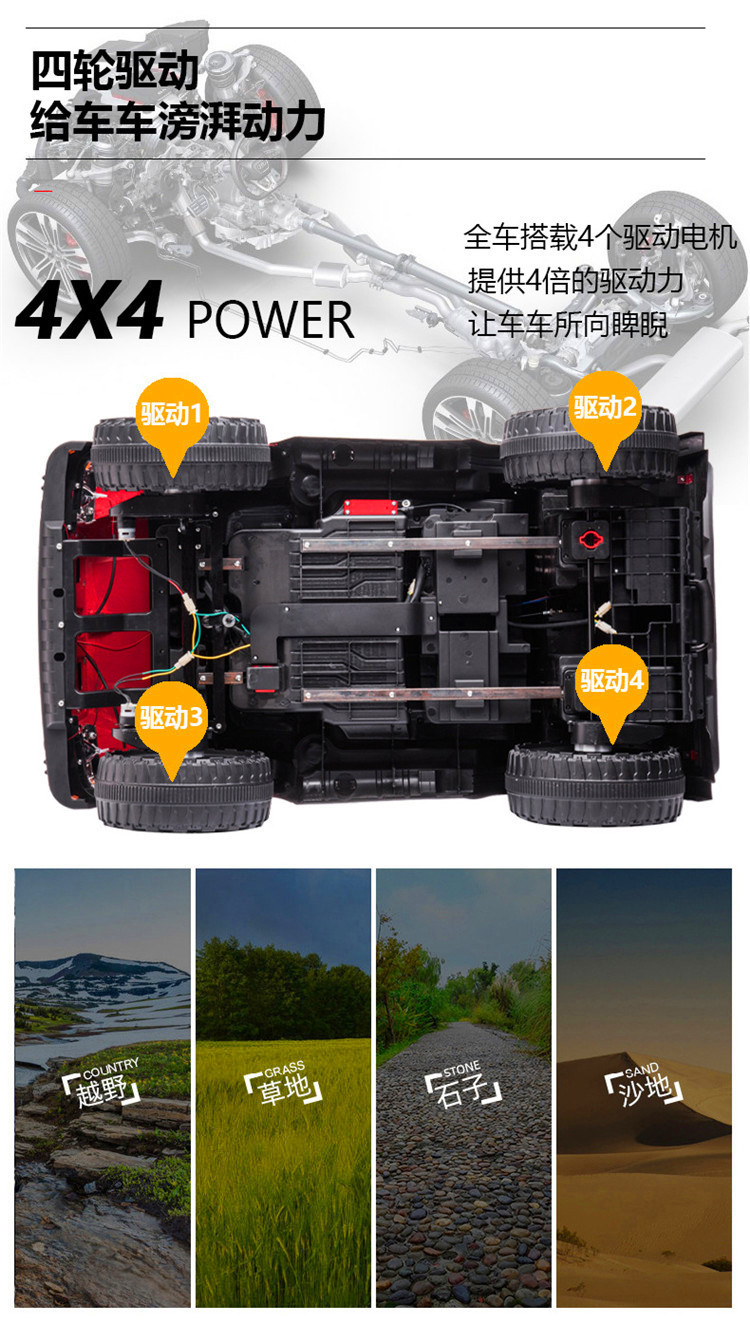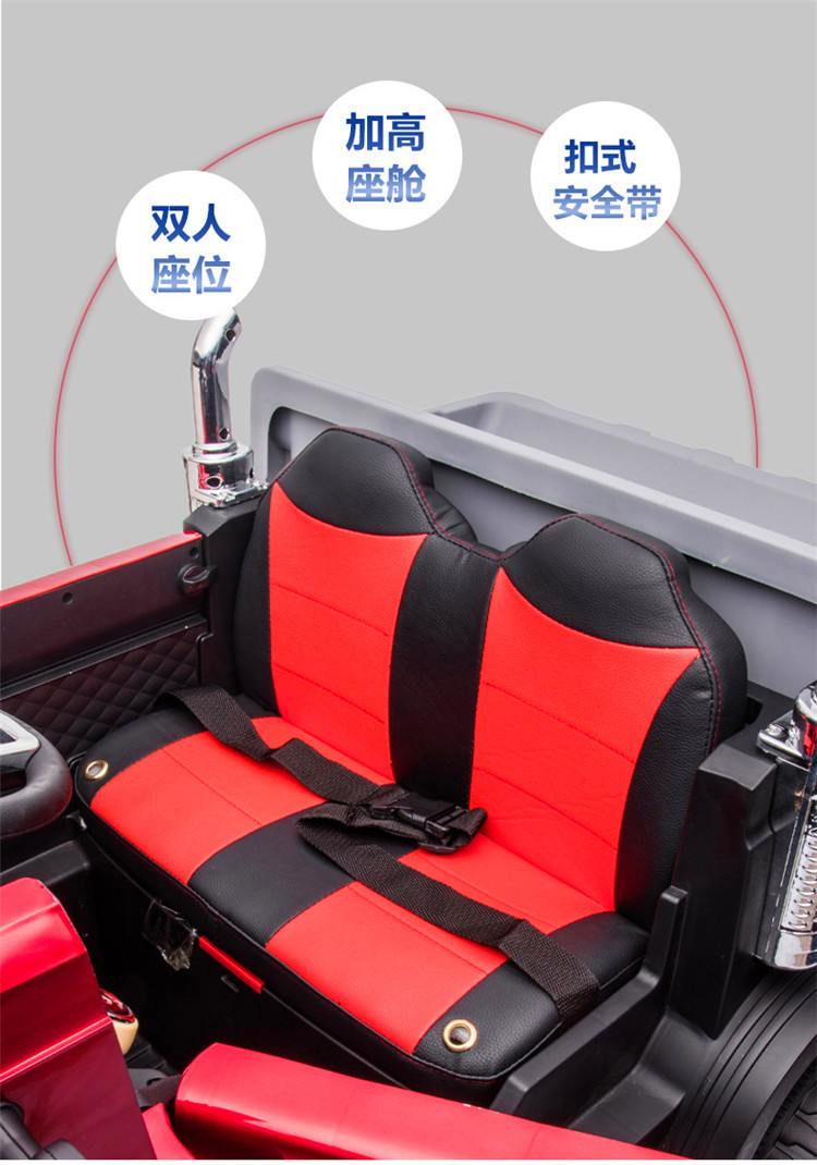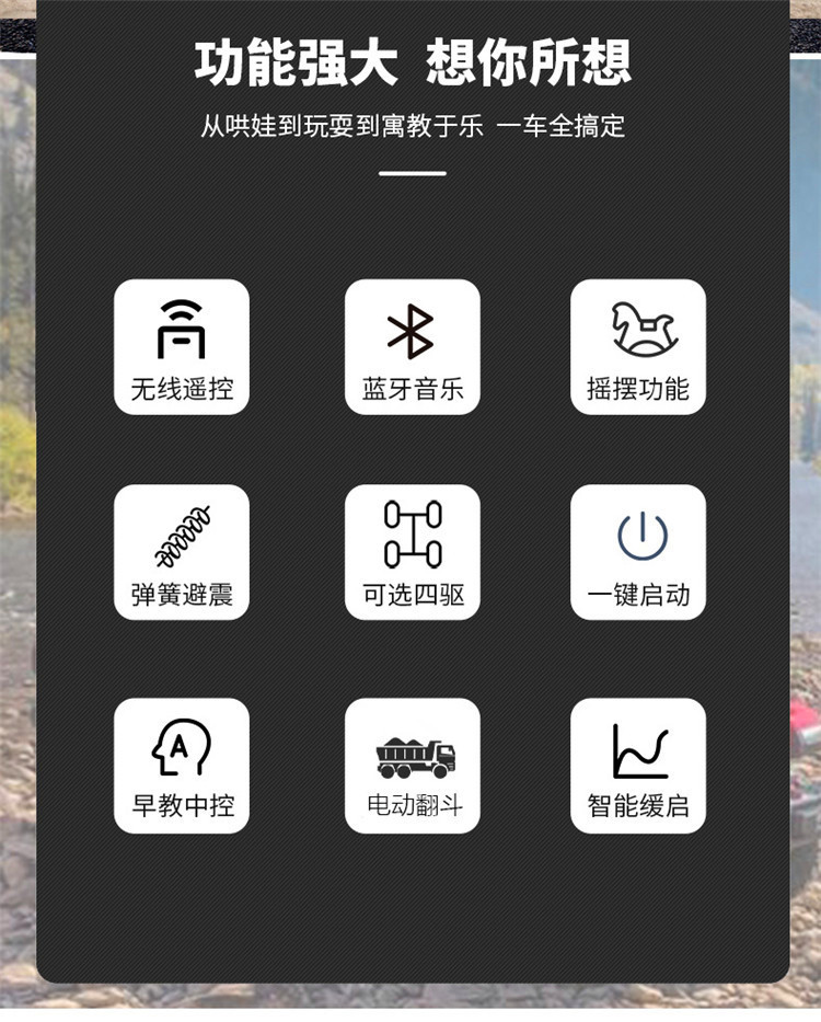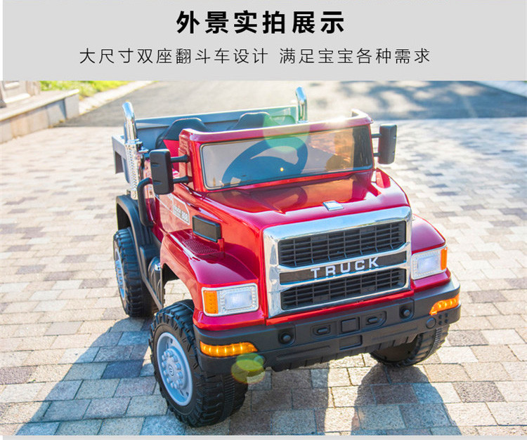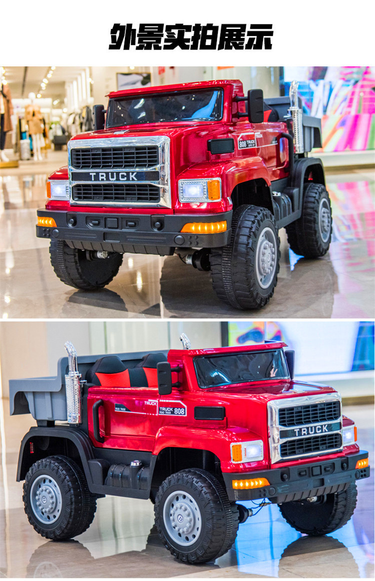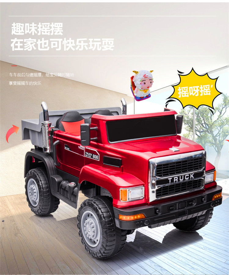 四驱带减震,多种功能能遥控器,可控制调速,缓起缓停,加速减速,音乐切换,揺摆运动,音乐灯光,电源,鸣笛,刹车系统等功能),一键启动,电量显示,电动翻斗手柄操控,带安全锁,仿真前大灯,早教功能,英语故事,LED大灯,USB插口,MP3 插口。