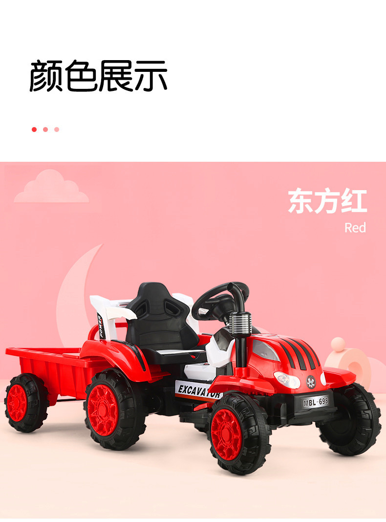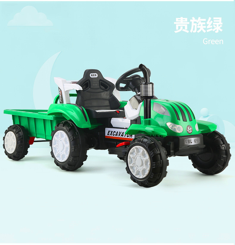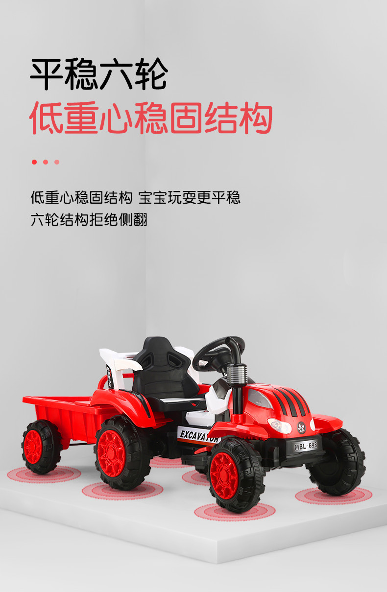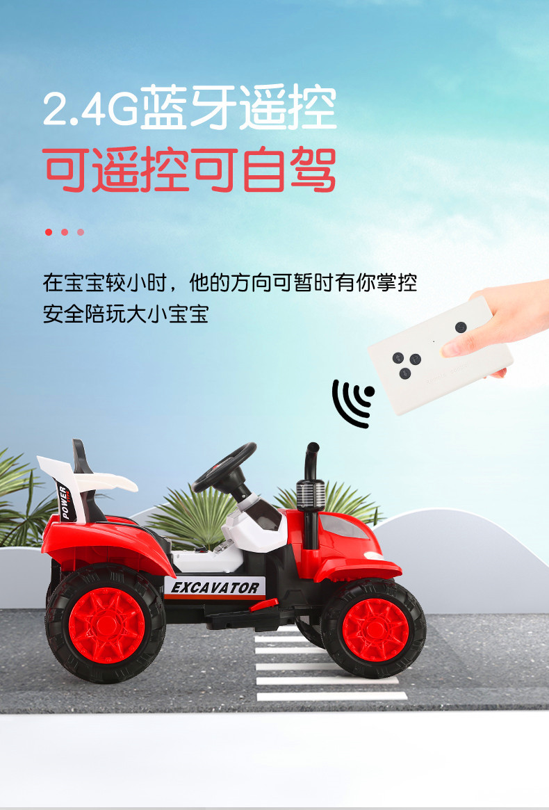 仿真电动拖拉机,仿真方向盘,灯光音乐早教,音量+-功能,一键启动,前进、后退、停止三档位,USB接口,仿真越野车轮不扎胎,脚踩油门,LED大灯,抗冲击PP材质,多种功能能够操作台.皮座椅,遥控