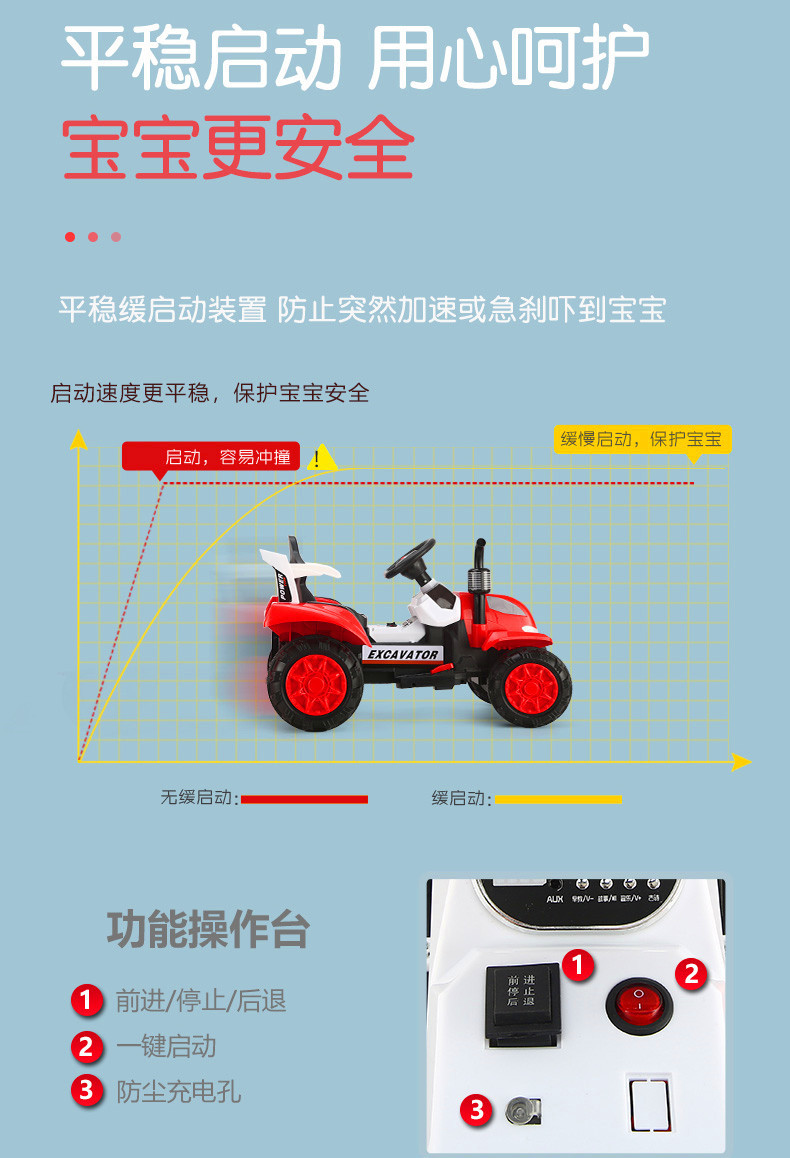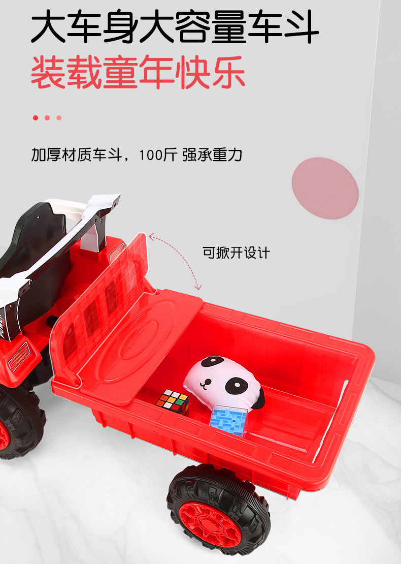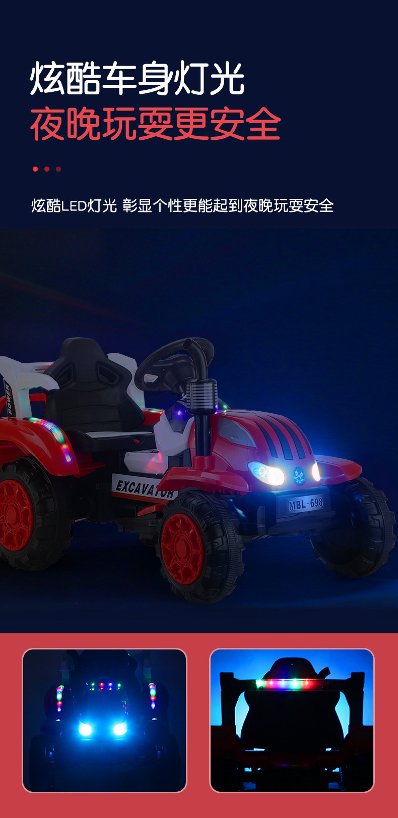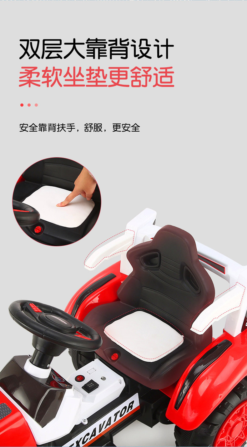 仿真电动拖拉机,仿真方向盘,灯光音乐早教,音量+-功能,一键启动,前进、后退、停止三档位,USB接口,仿真越野车轮不扎胎,脚踩油门,LED大灯,抗冲击PP材质,多种功能能够操作台.皮座椅,遥控