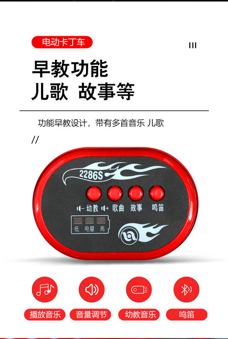 新款儿童电动卡丁车,540W分离式电机,一键启动,早教功能,炫酷英文音乐,故事,电量显示 LED大灯,三档调节功能,缓启动,采用防滑耐磨轮胎,舒适车座,环保聚丙烯PP料,每箱一台