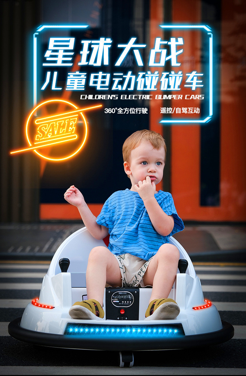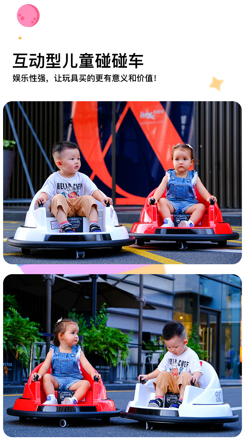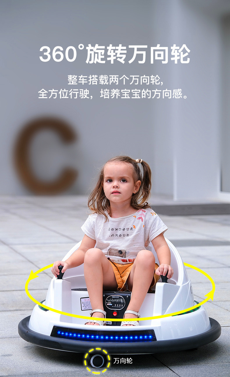 互动型儿童电动碰碰车,360度旋转万向轮,对一2.4G遥控器,LED七彩灯光,两个万向控制杆,转向灵活,全方向行驶,一键刹车,双电双驱马达,炫酷环绕式LED灯带,动感音乐,音量可大小调节,环保软质PVC车体防撞条,防震静音弹性碰撞,全封闭底盘。