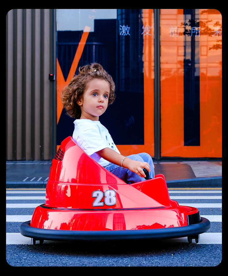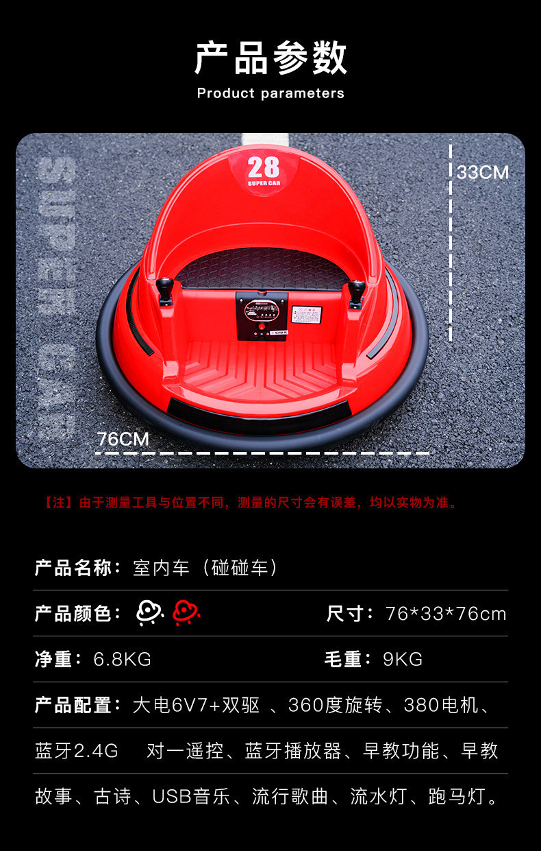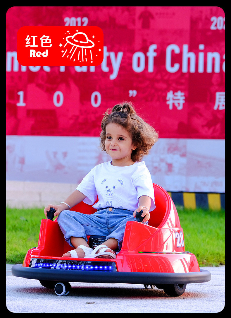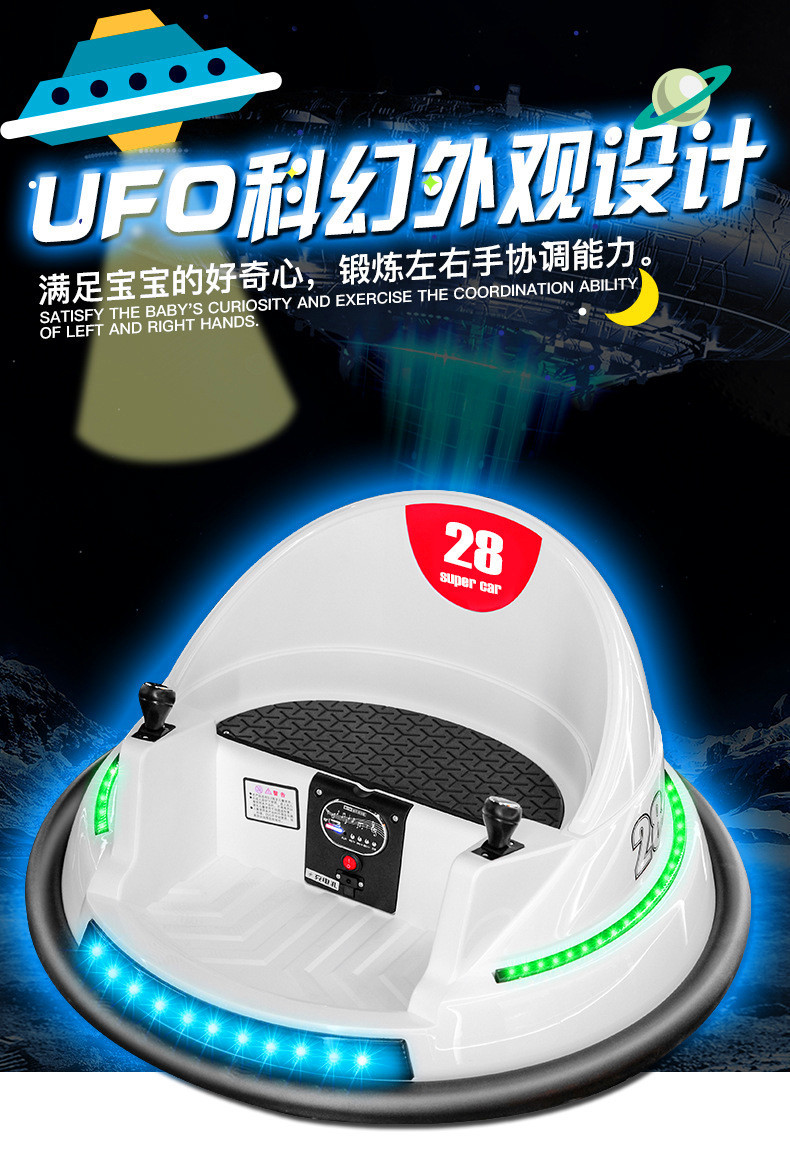 互动型儿童电动碰碰车,360度旋转万向轮,对一2.4G遥控器,LED七彩灯光,两个万向控制杆,转向灵活,全方向行驶,一键刹车,双电双驱马达,炫酷环绕式LED灯带,动感音乐,音量可大小调节,环保软质PVC车体防撞条,防震静音弹性碰撞,全封闭底盘。