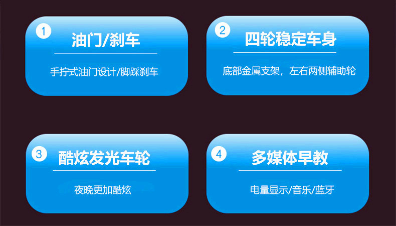 红色,白色,黄色,蓝色:标配+脚踩油门+12V4+硬座,高配+手拧油门+12V7+皮座,D配+手拧油门+超威12V12a皮座,定制+发泡软胎+双电机+超威12V12a+皮座