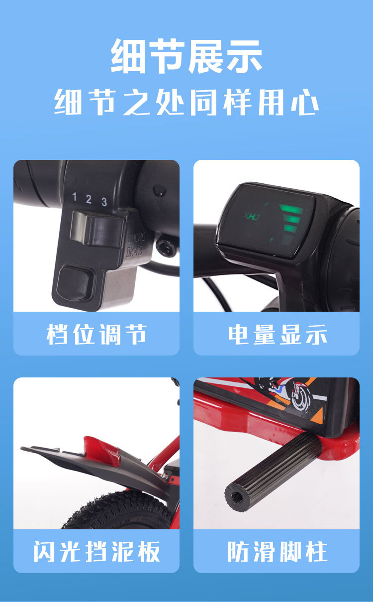 【红色/蓝色/黑色】: 100-500W大功率电机+24v4.5电瓶 +充气轮胎+手拧油门+碟刹+辅轮,高配+24v8锂电+充气轮胎+手拧油门+碟刹
