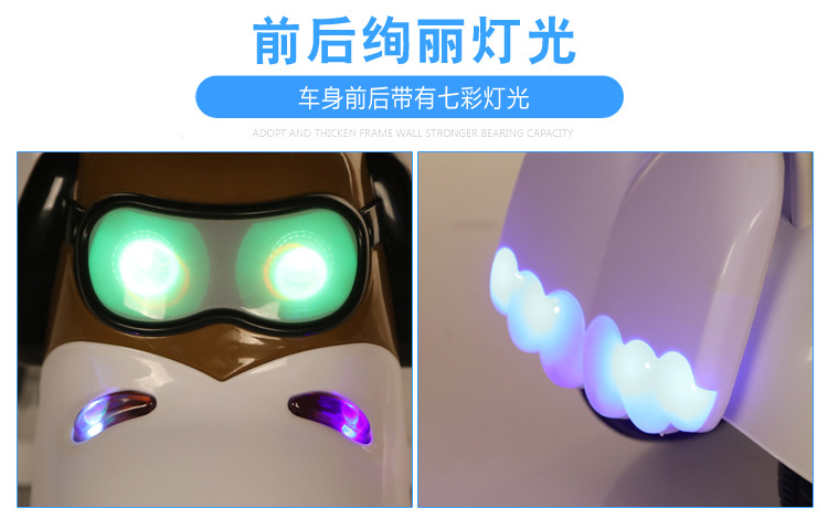 1.真车一键启动控制开关 2.前后LED灯独家设计工艺 3.钢梁车架与PVC环保耐摔外壳组成 4.可调节音量大小 5.升级重低音喇叭设计,无杂音 6.人性化脚踩油门设计,踩住启动,松开停止,安全可靠,自由控制 7.前进,停止,后退三挡调节 8.靠背护栏计,